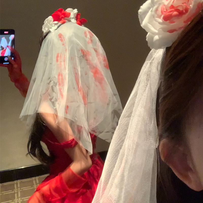 피 묻은 신부 다크 레드 꽃 머리띠 여성 화이트 메쉬 머리띠 할로윈 코스 유령 신부 헤어 액세서리