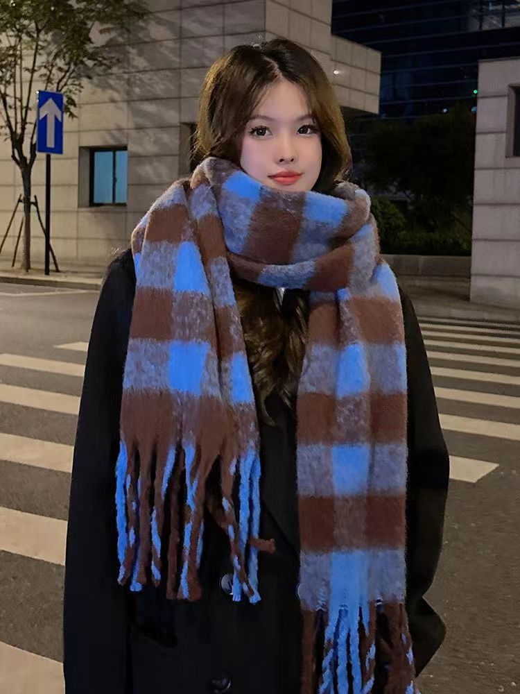 가을과 겨울 캐시미어 격자 무늬 술 스카프 한국 스타일 여성 사이클링 여행 따뜻한 패션 니트 스카프 목도리
