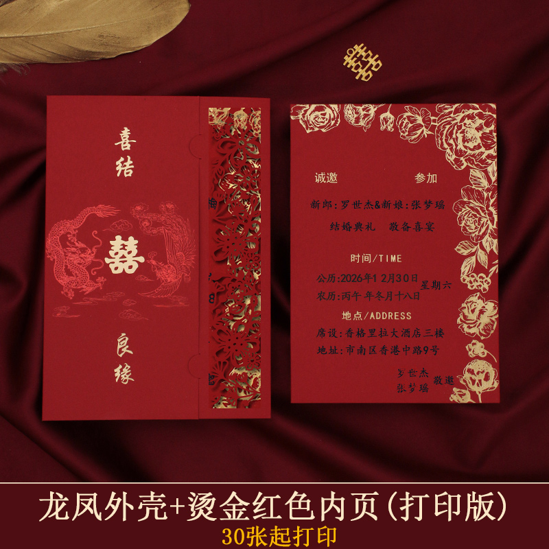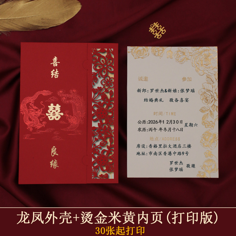 • 인쇄판 - 용과 봉황의 행복한 결혼 중공 초대장 [빨간색 핫 스탬핑 내부 페이지] 10부