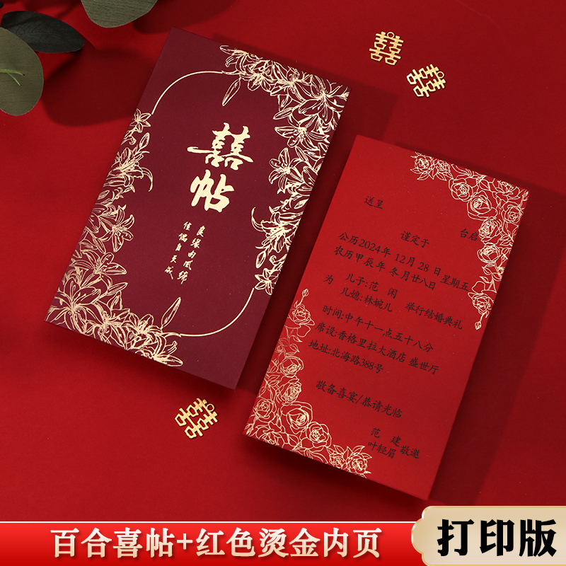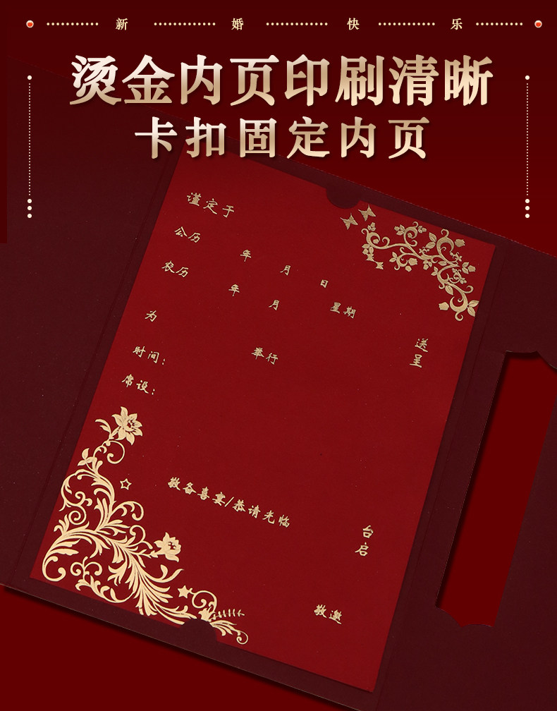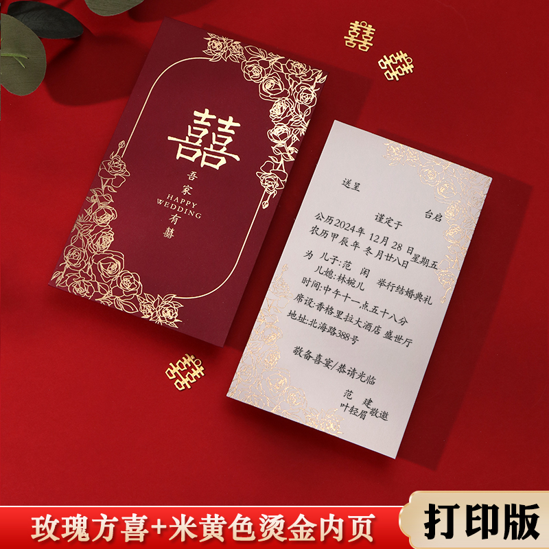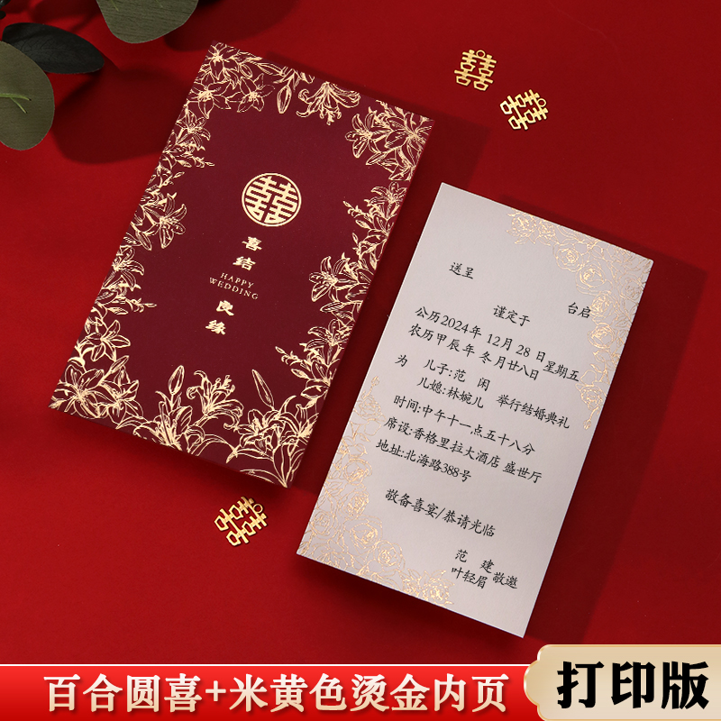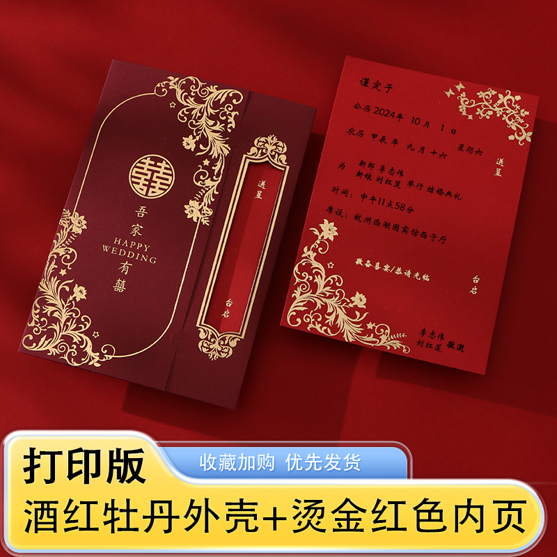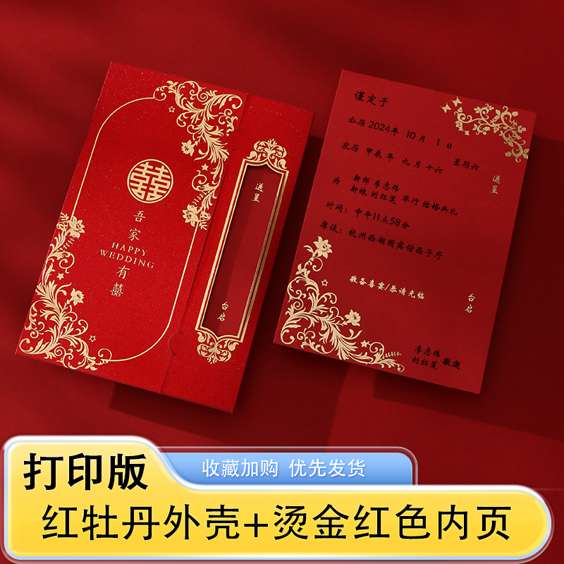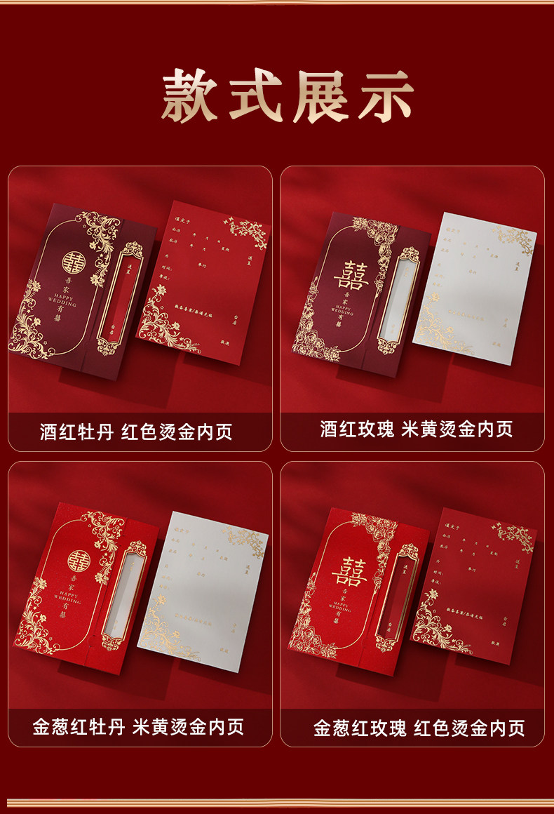 • 인쇄 버전 - 붉은 모란 중공 초대장 [베이지색 핫 스탬핑 내부 페이지] 10 장