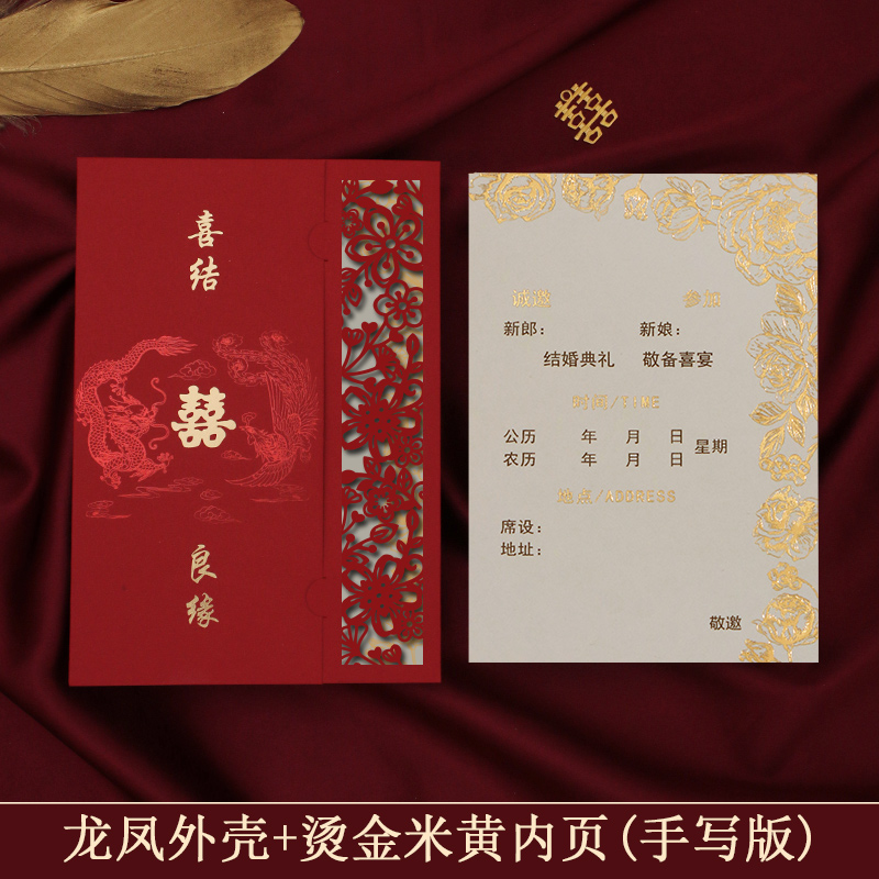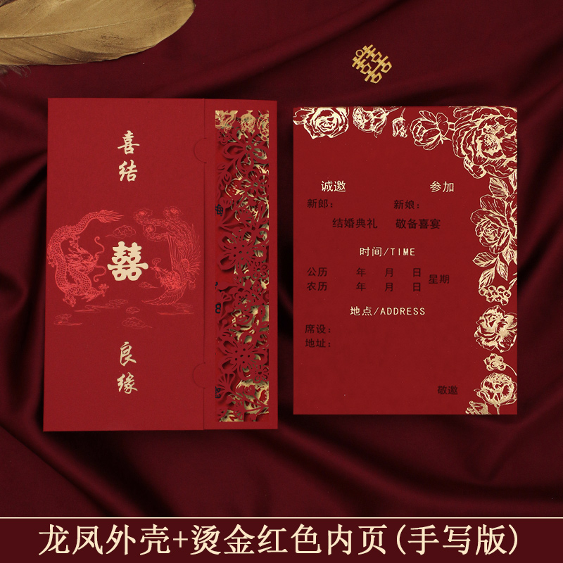 • 손글씨 버전 - 용과 봉황의 행복한 결혼 중공 초대장 [빨간색 핫 스탬핑 내부 페이지] 10부