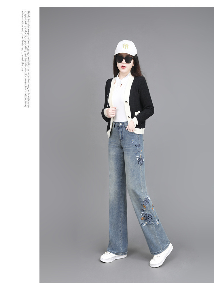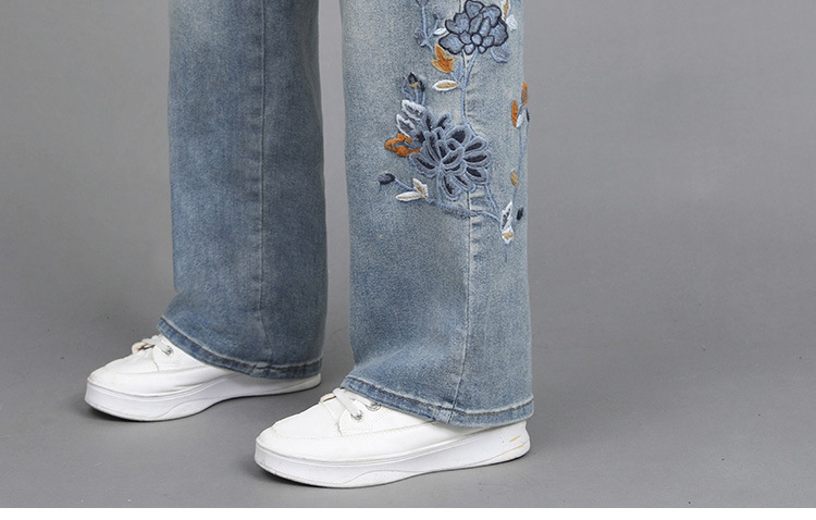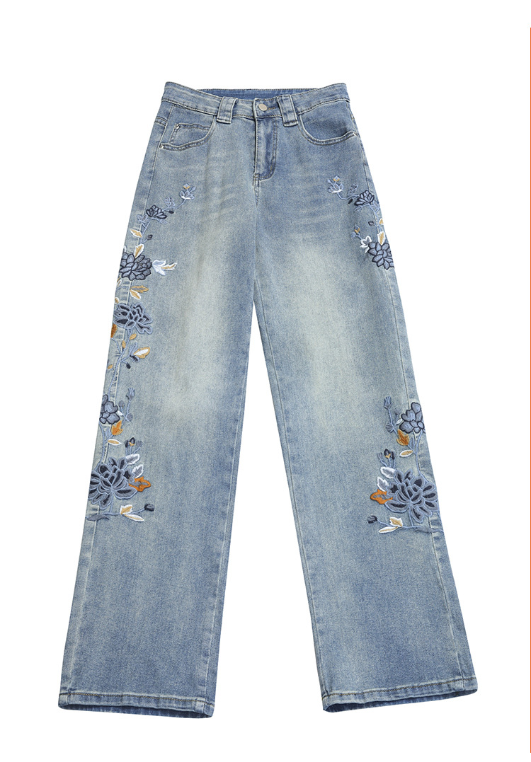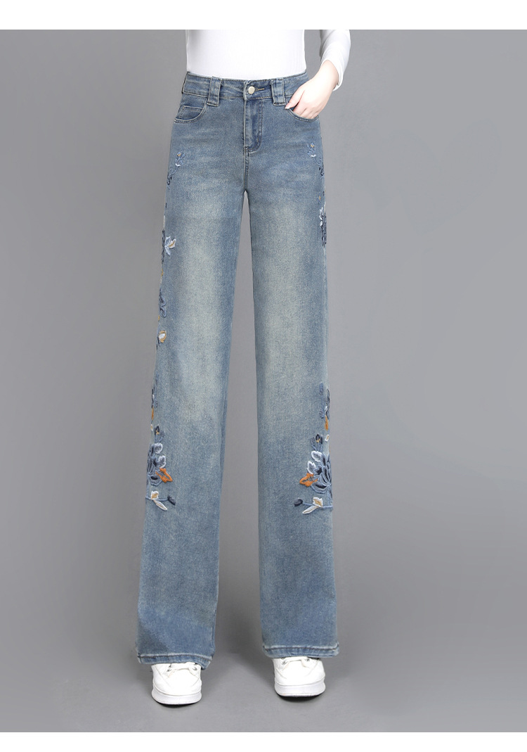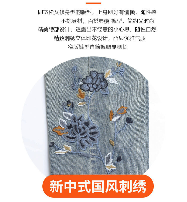 새로운 중국 하이 엔드 자수 꽃 중공업 청바지 여성의 2024 가을 새로운 패션 트렌드 국가 스타일 와이드 다리 바지스토어 가기