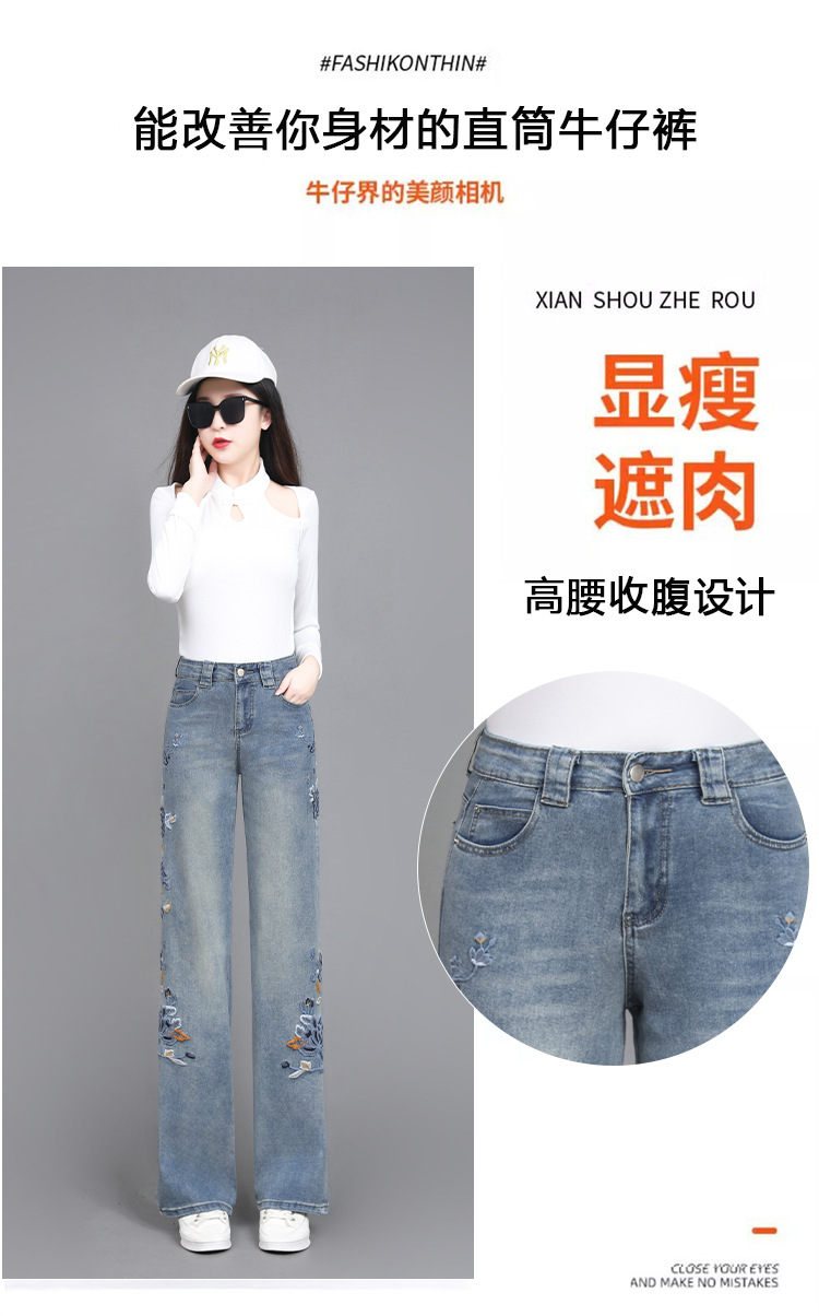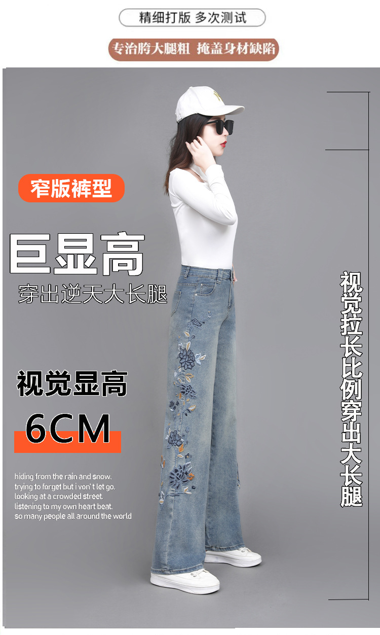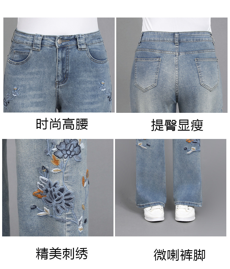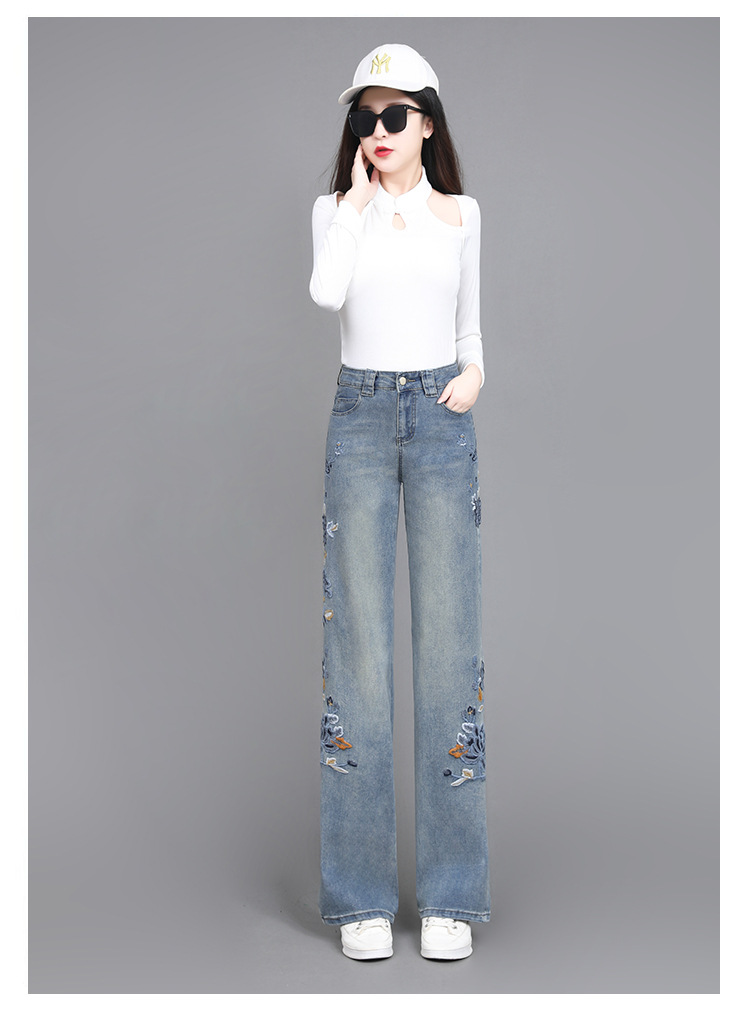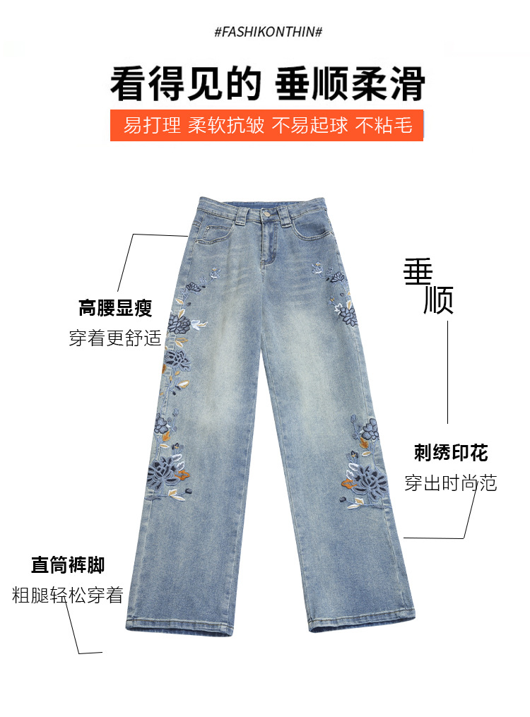 새로운 중국 하이 엔드 자수 꽃 중공업 청바지 여성의 2024 가을 새로운 패션 트렌드 국가 스타일 와이드 다리 바지스토어 가기
