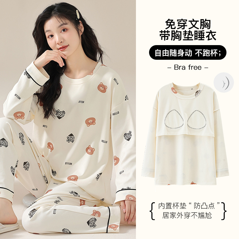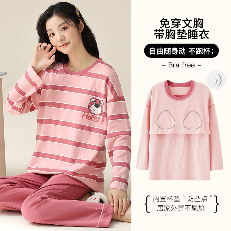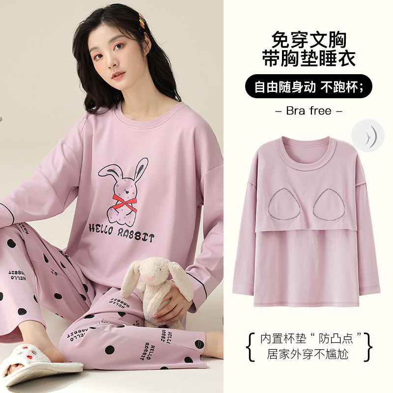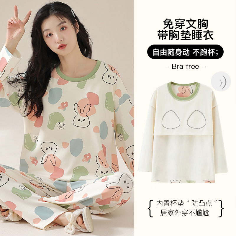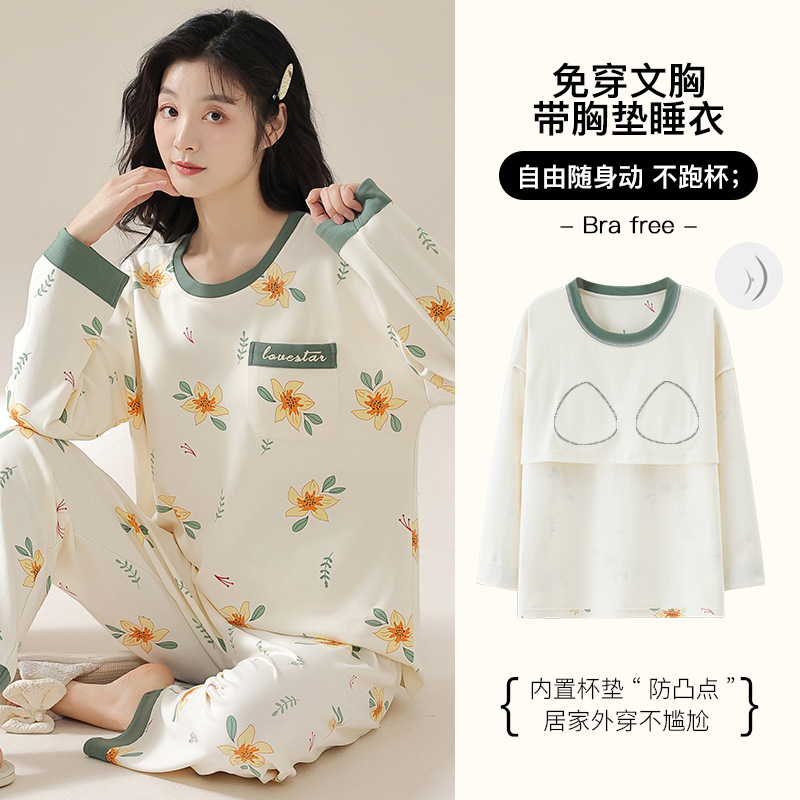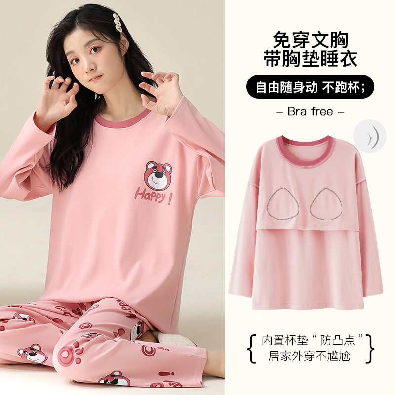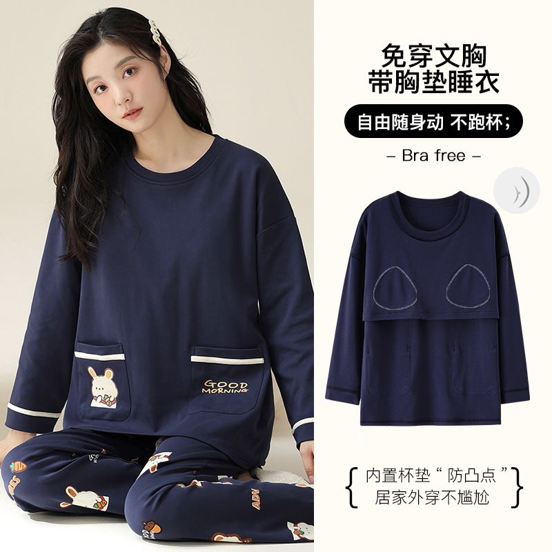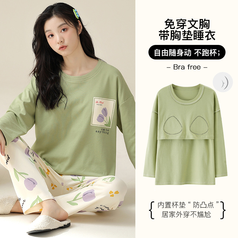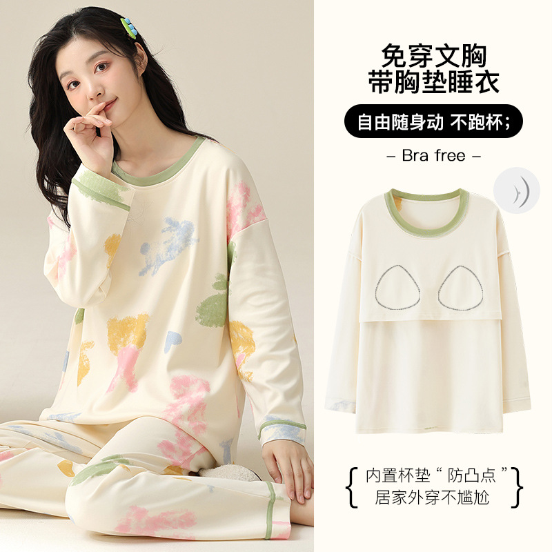 잠옷 여성의 봄과 가을면 가슴 패드가 달린 긴팔 바지 5XL 초대형 의상 홈 세트스토어 가기