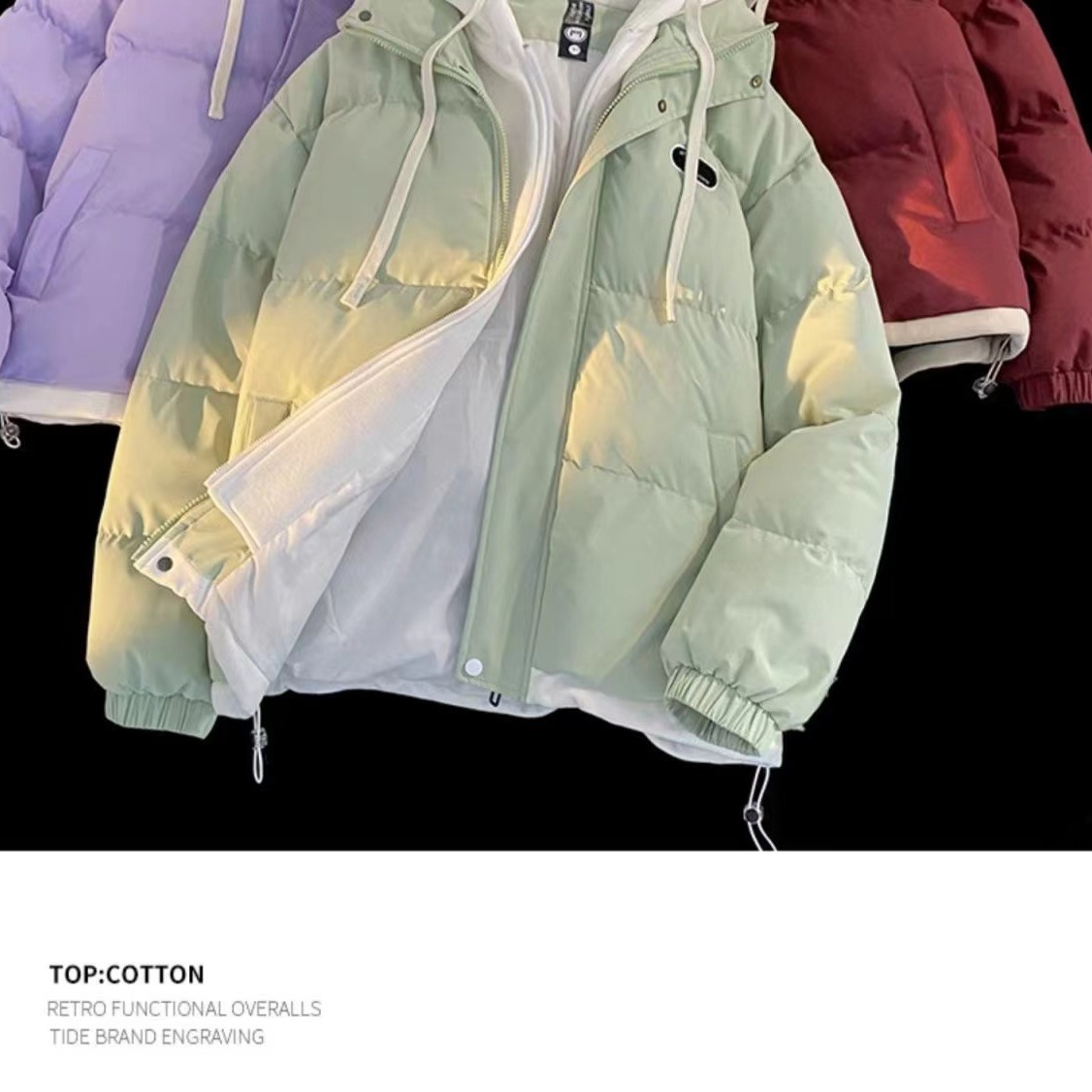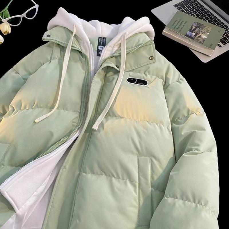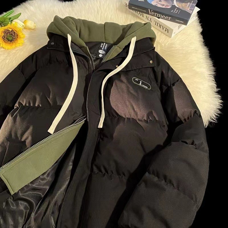 남자와 여자를위한 가짜 투피스 스티칭 후드 패셔너블 코튼 패딩 재킷 가을과 겨울 두꺼운 따뜻한 느슨한 코튼 패딩 재킷 커플의 코트 트렌디스토어 가기