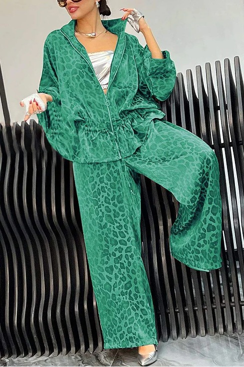 2024 스팟 가을, 겨울 새로운 유럽과 미국의 국경 여성 옷깃 허리 Drawstring 긴 소매 표범 인쇄 캐주얼 정장스토어 가기