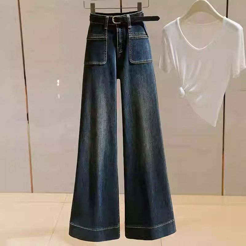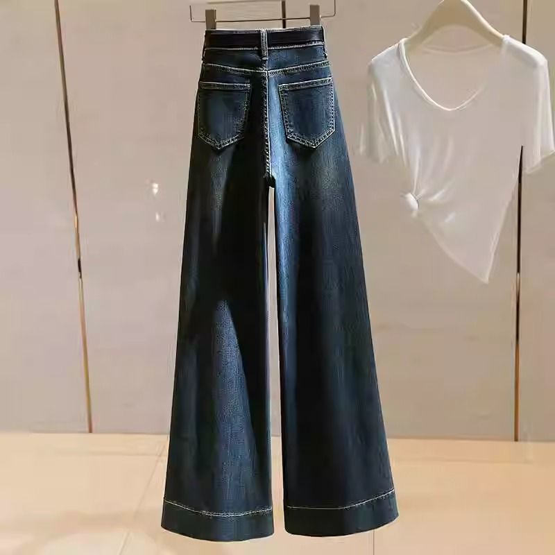 플러스 사이즈 통통녀 높은 허리 청바지 여성의 가을 2024 슬리밍 느슨한 뿔 직선 다리 바지 디자인 넓은 다리 바지스토어 가기