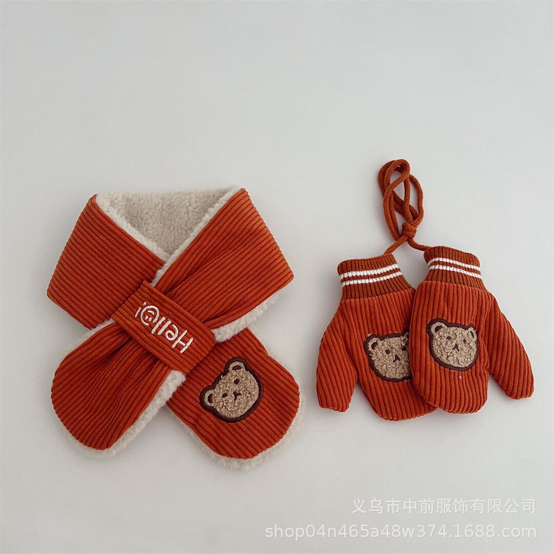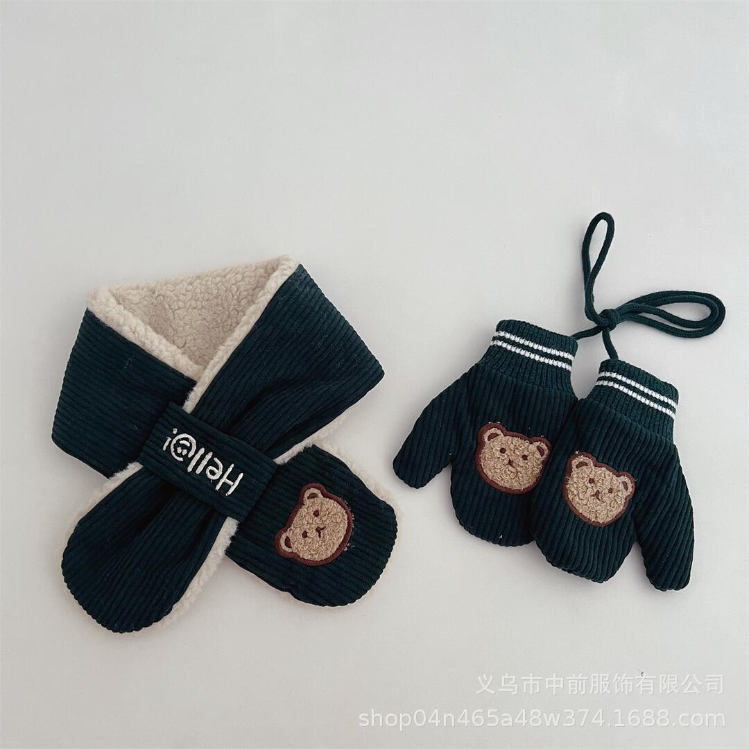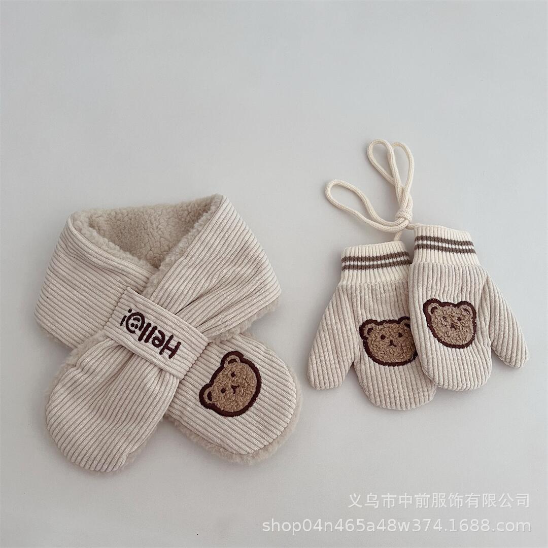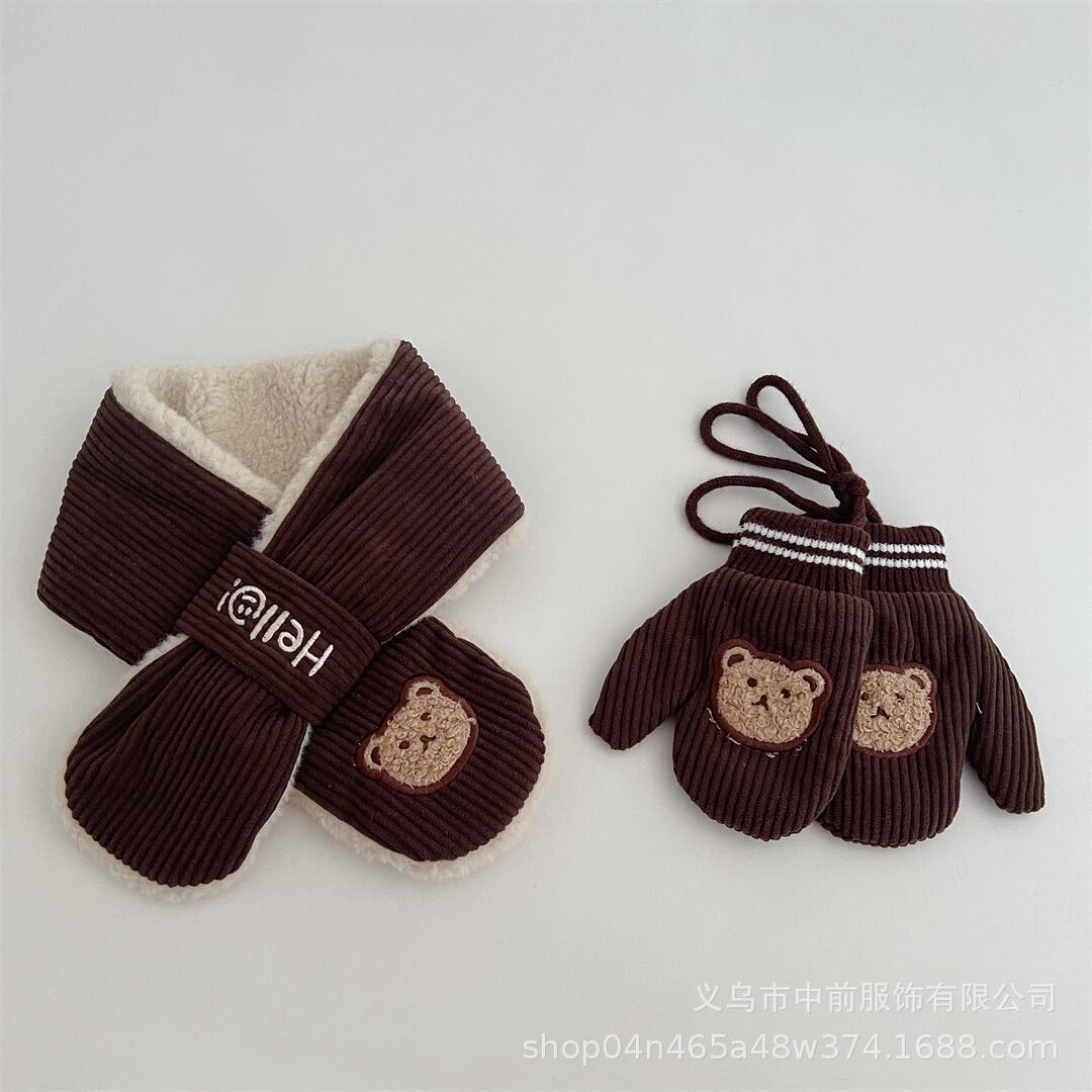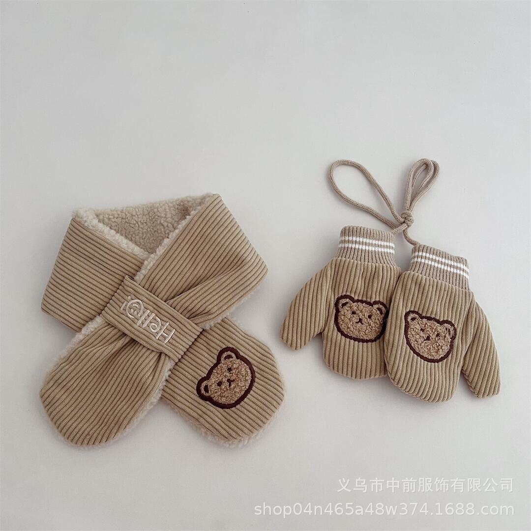 2024 어린이 장갑 스카프 겨울 코듀로이 만화 곰 따뜻한 목 교수형 소년 소녀를위한 장갑