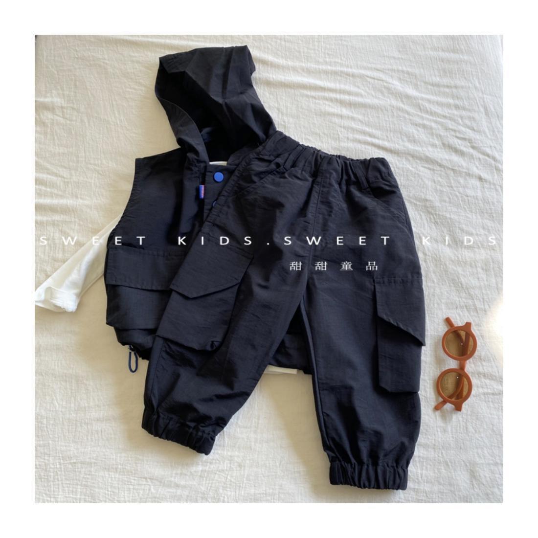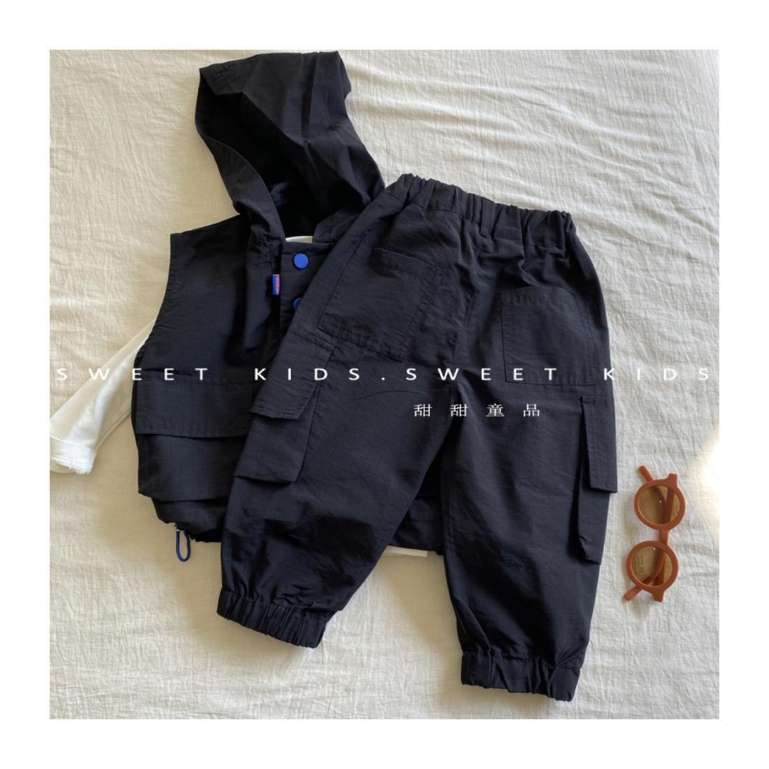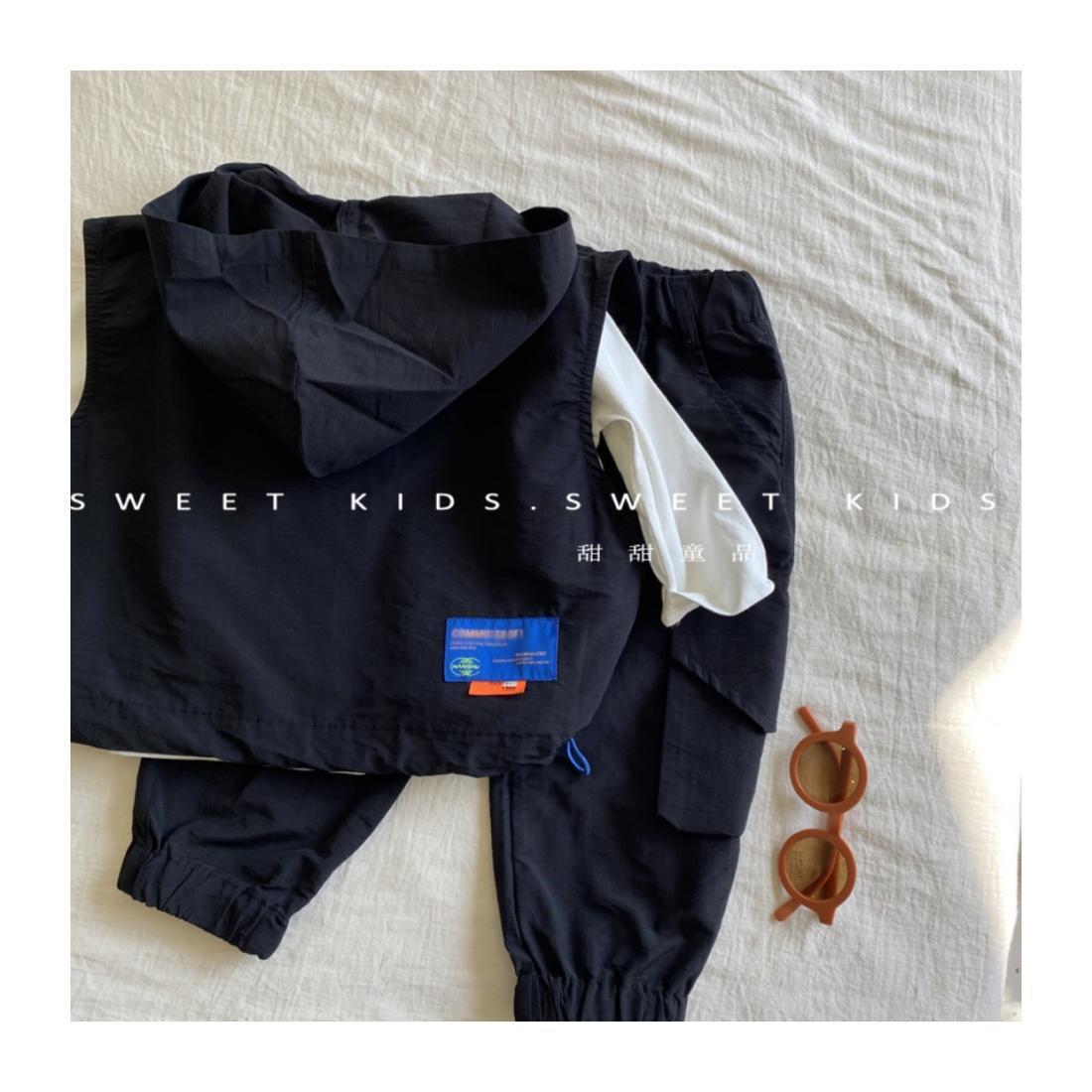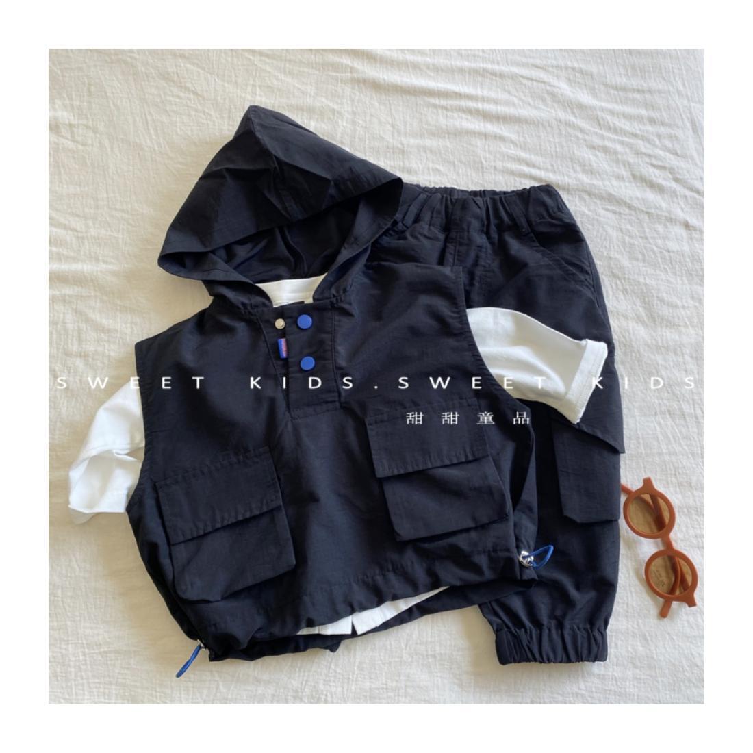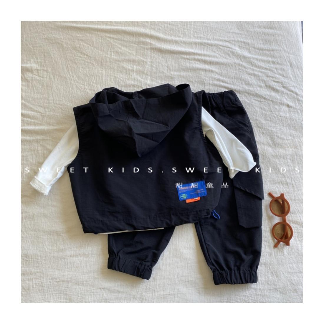 2024 새로운 스타일의 아기 소년 후드 조끼 바닥 셔츠 작업 바지 3 피스 트렌디 한 소년 가을 세트
