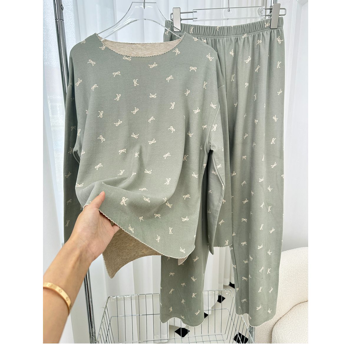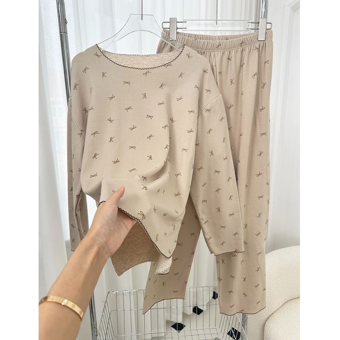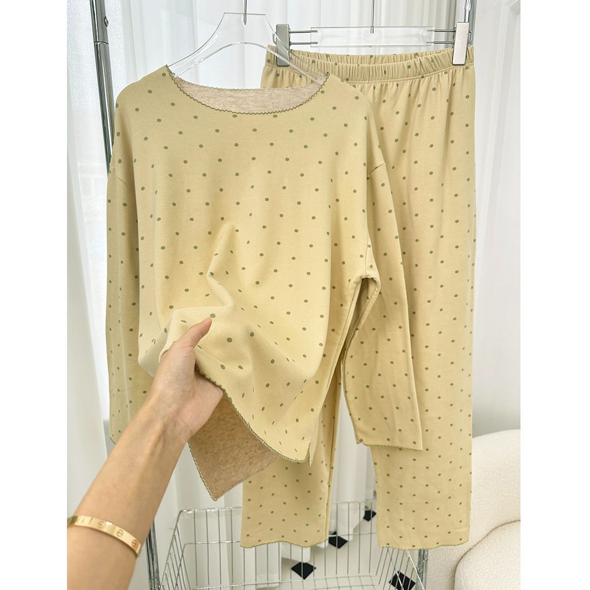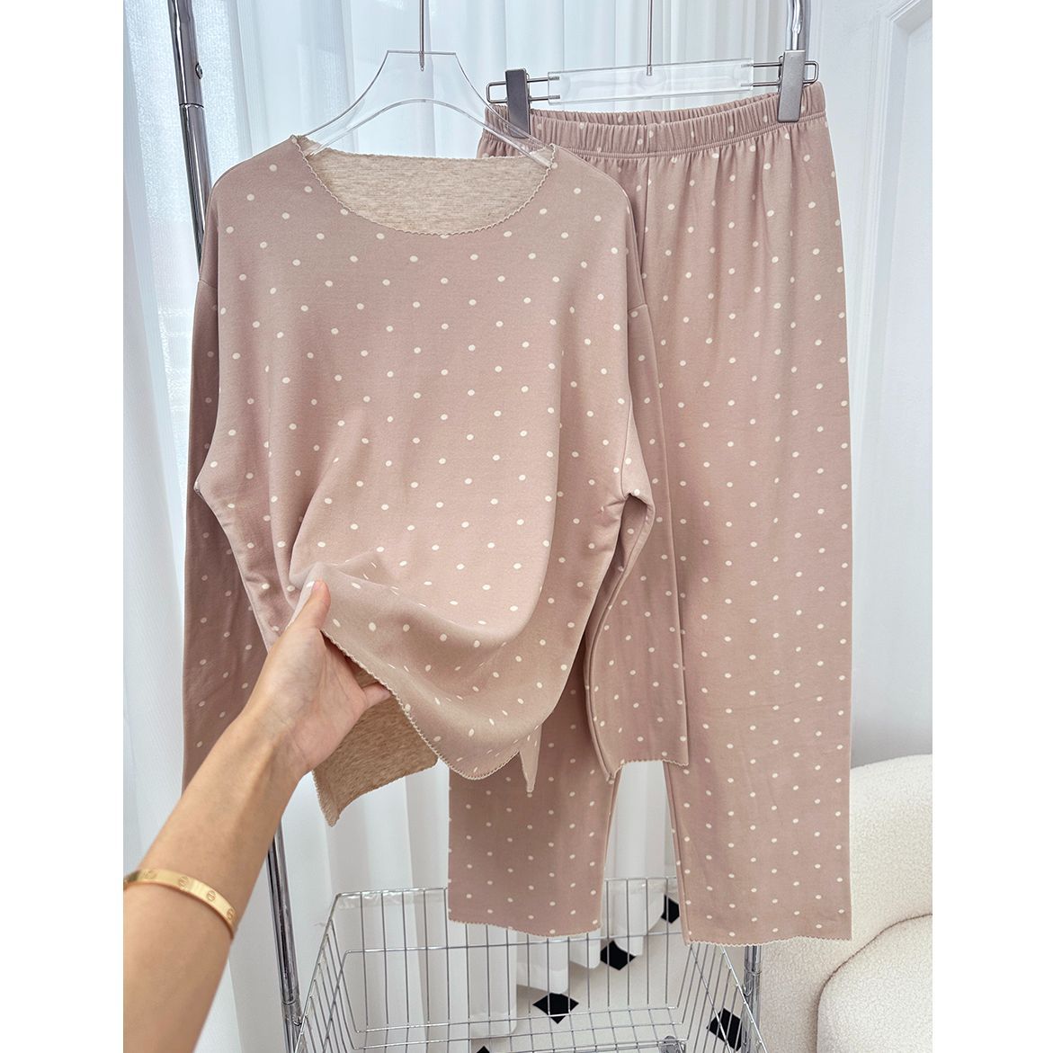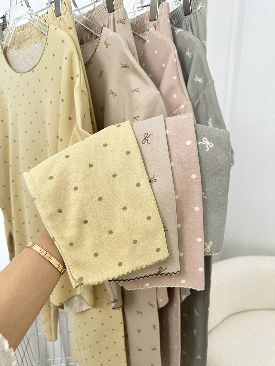 양모 실크 가을과 겨울 여성 홈웨어 세트 크루 넥 투피스 세트 따뜻한 파자마 폴카 도트 활 인쇄스토어 가기