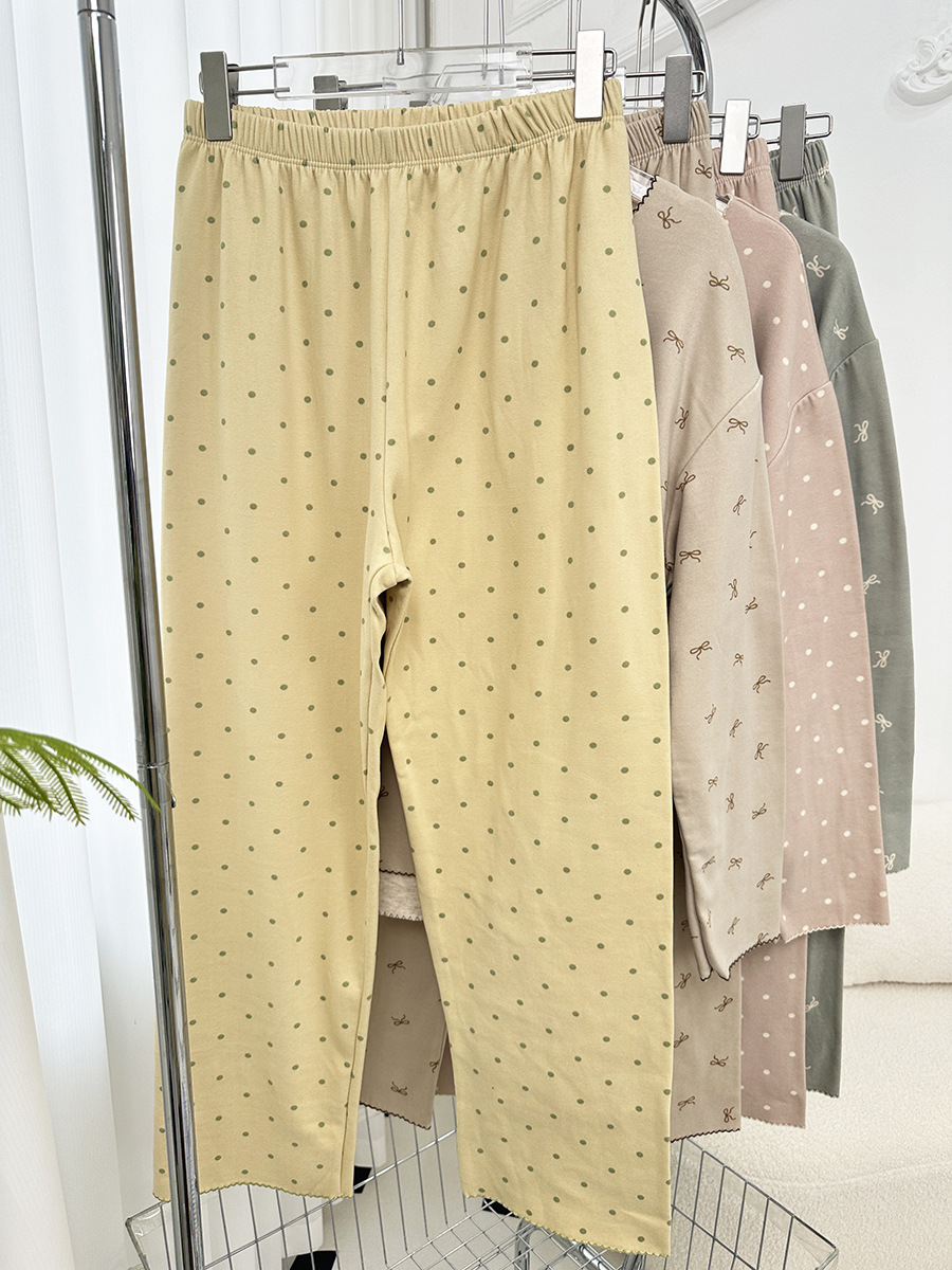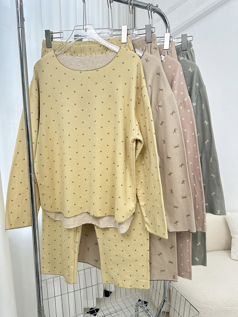 양모 실크 가을과 겨울 여성 홈웨어 세트 크루 넥 투피스 세트 따뜻한 파자마 폴카 도트 활 인쇄