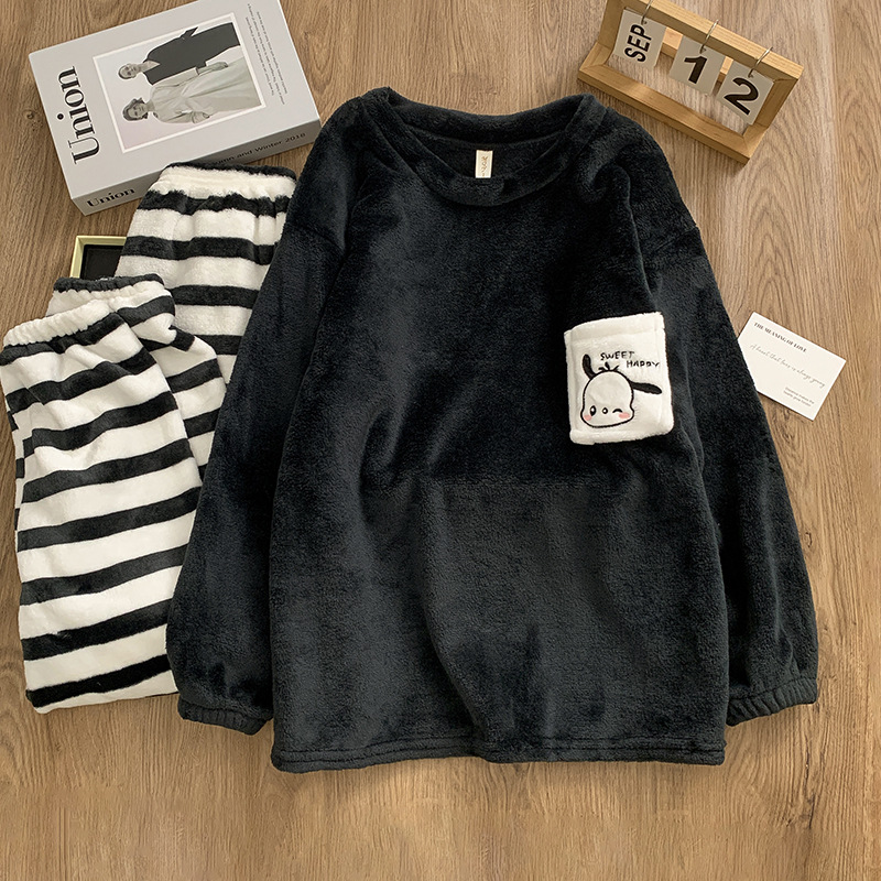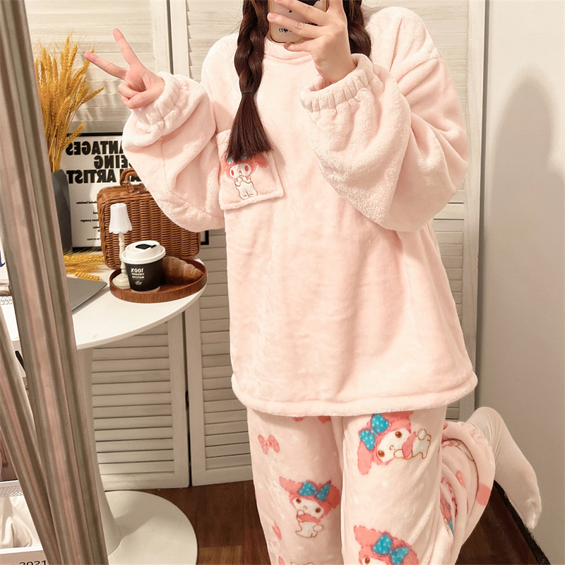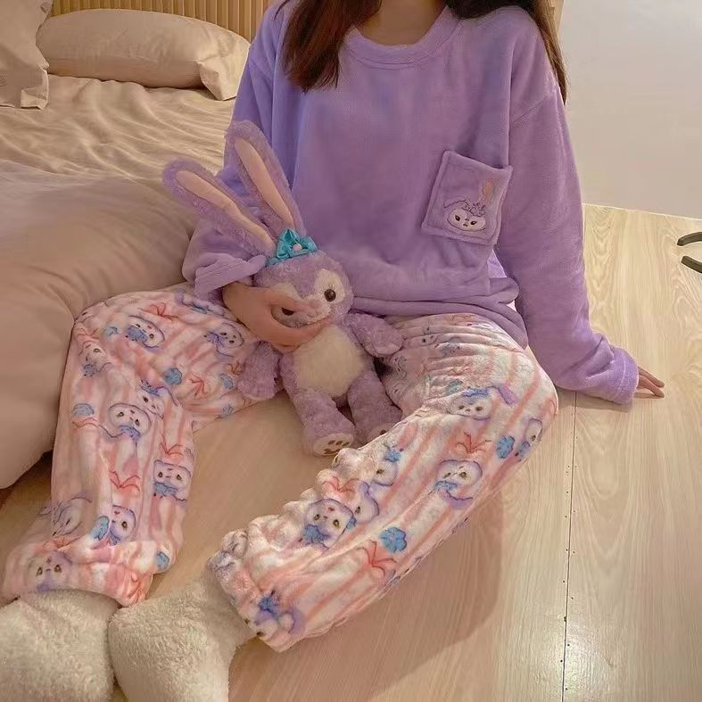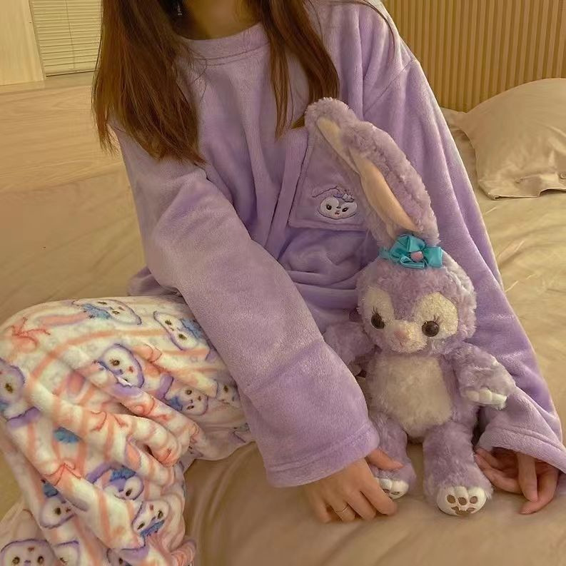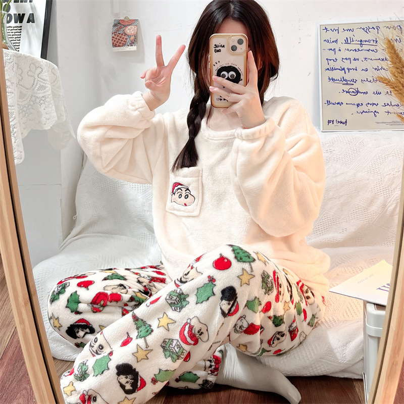가을 겨울 여성용 플란넬 잠옷 긴팔 바지 반팔 라운드넥 인기 심플 소녀 따뜻한 홈웨어스토어 가기
