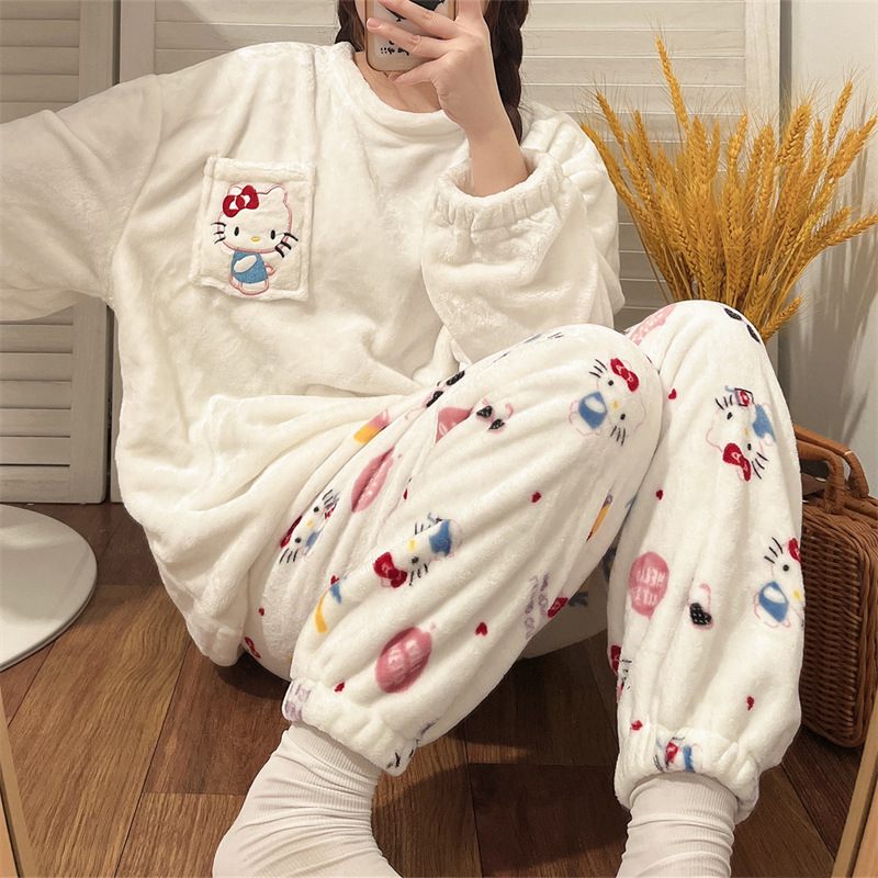 가을 겨울 여성용 플란넬 잠옷 긴팔 바지 반팔 라운드넥 인기 심플 소녀 따뜻한 홈웨어
