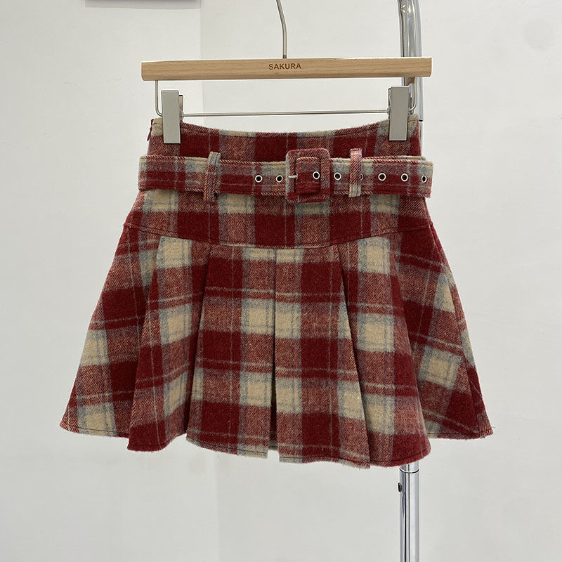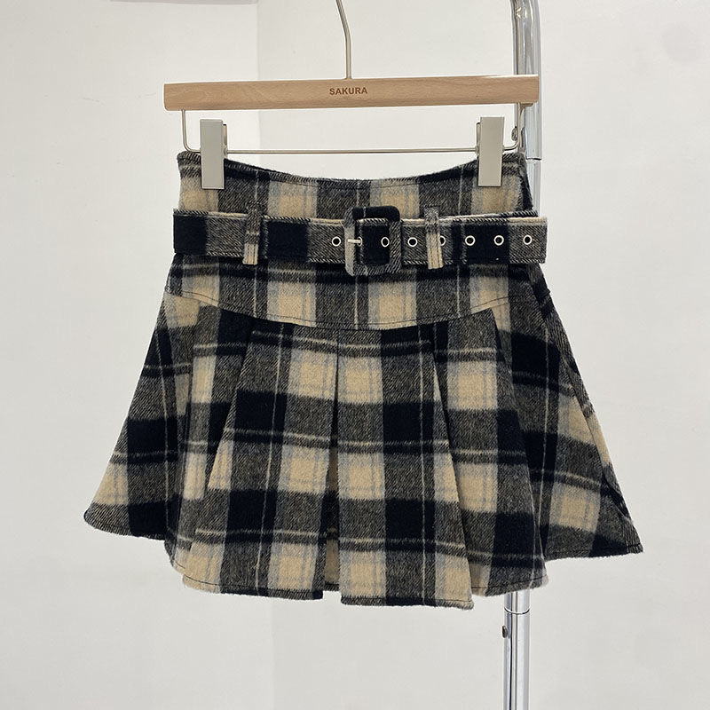 여자 겨울 새 격자 무늬 모직 하이 웨이스트 스커트 2025 한국어 버전 벨트가있는 노출 방지 탄성 주름 스커트