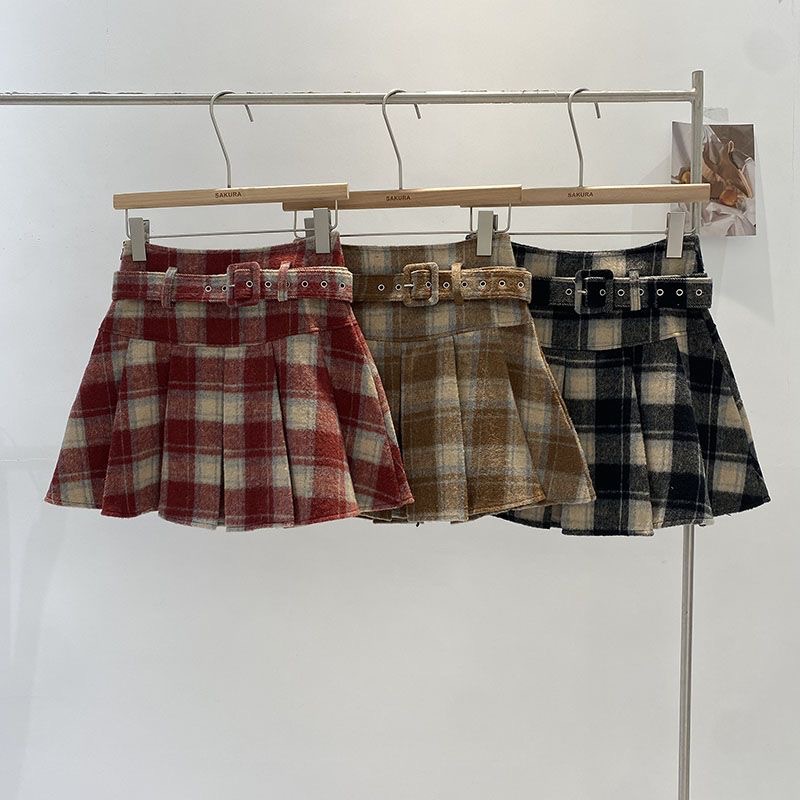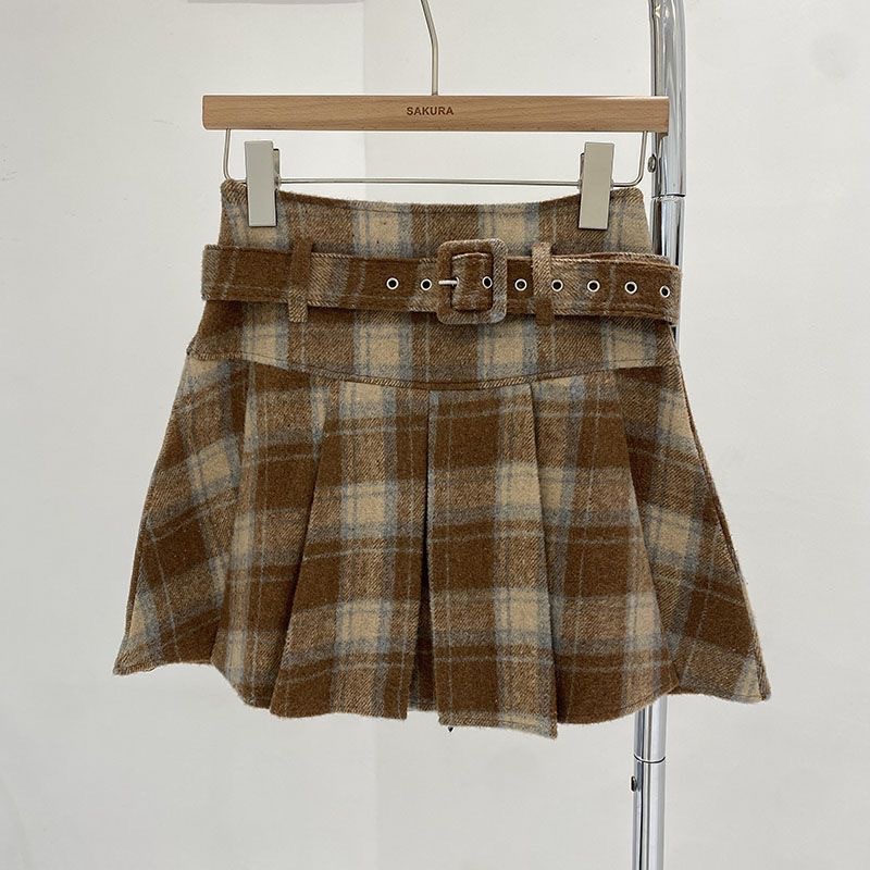 여자 겨울 새 격자 무늬 모직 하이 웨이스트 스커트 2025 한국어 버전 벨트가있는 노출 방지 탄성 주름 스커트스토어 가기
