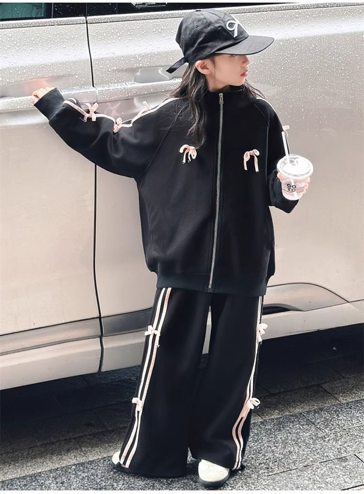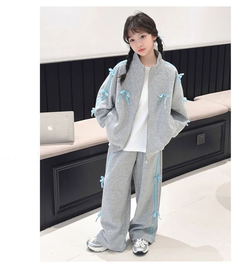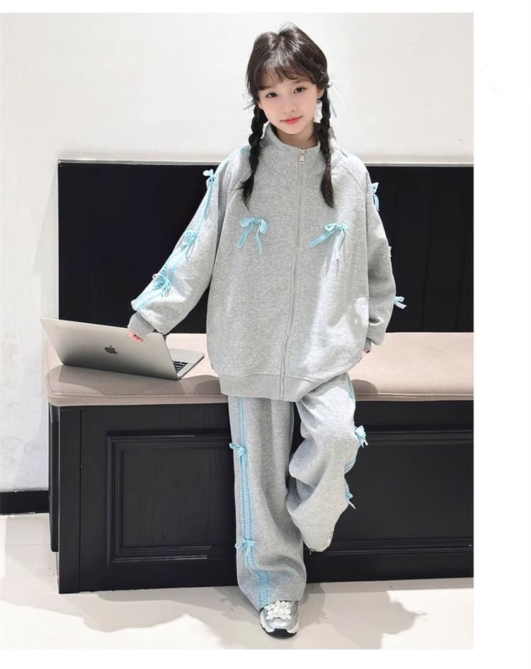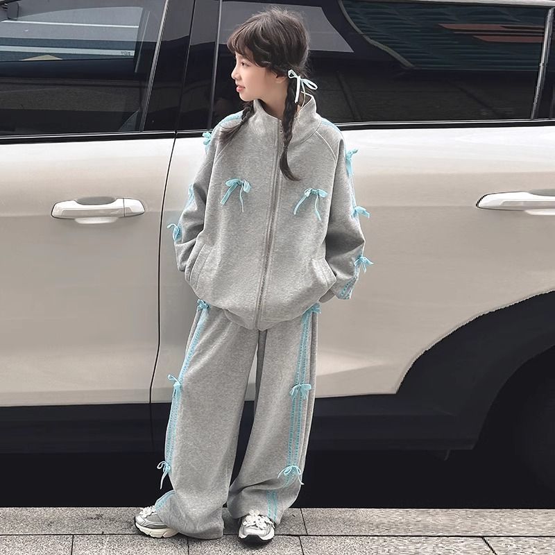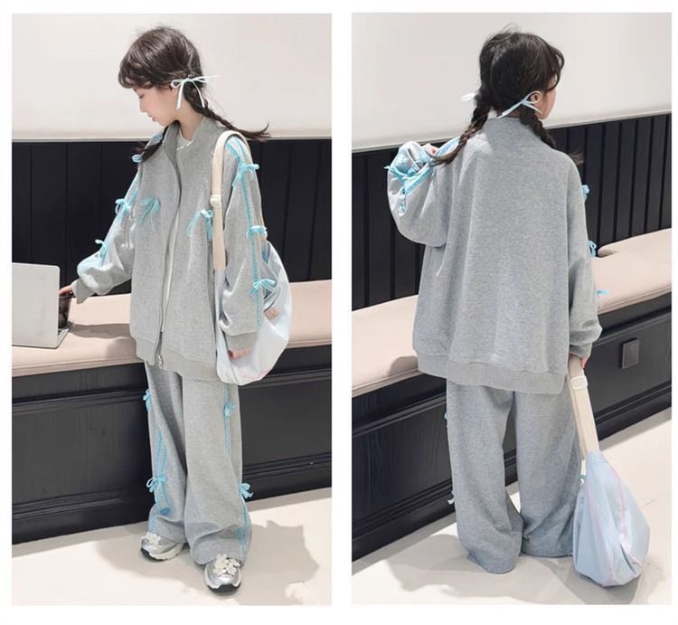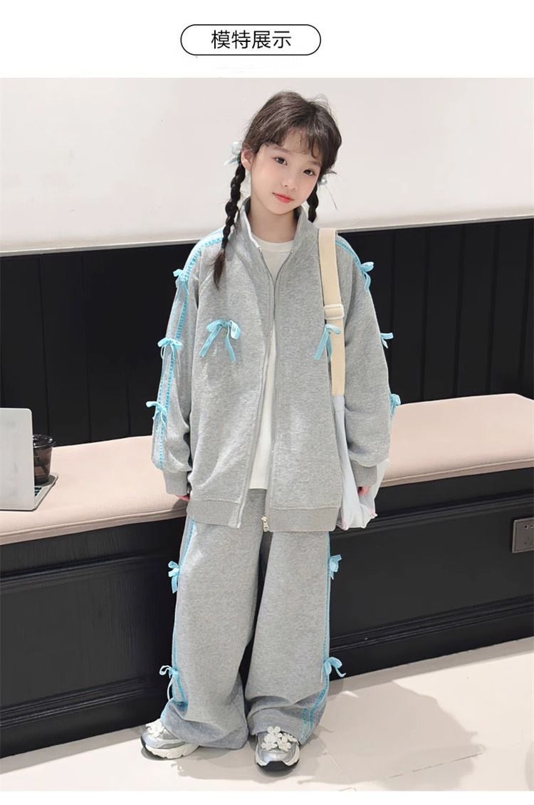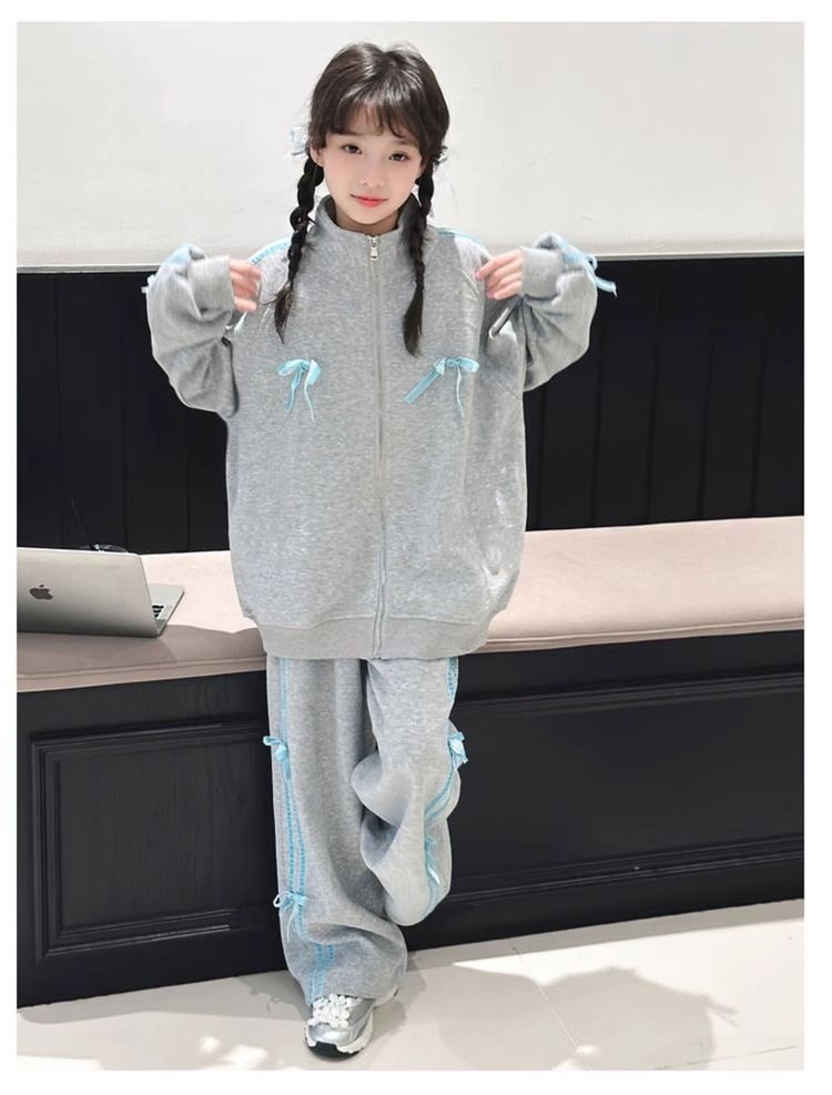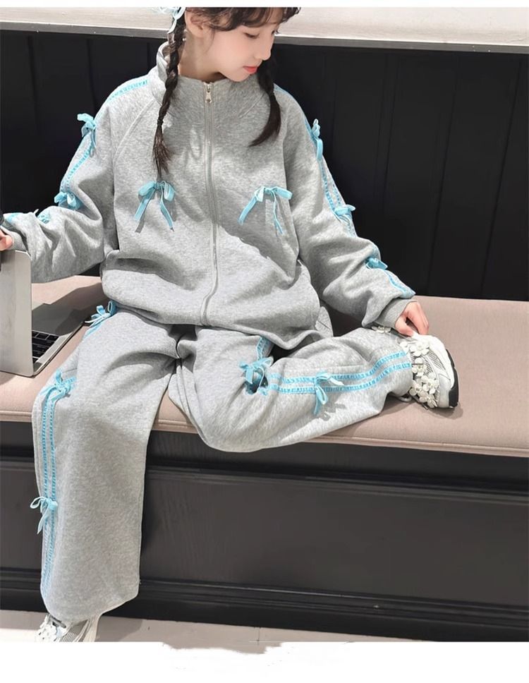 여자 운동복 정장 봄과 가을 2025 새로운 스타일 보우 스탠드 칼라 스웨터 재킷 캐주얼 넓은 다리 바지 유행스토어 가기