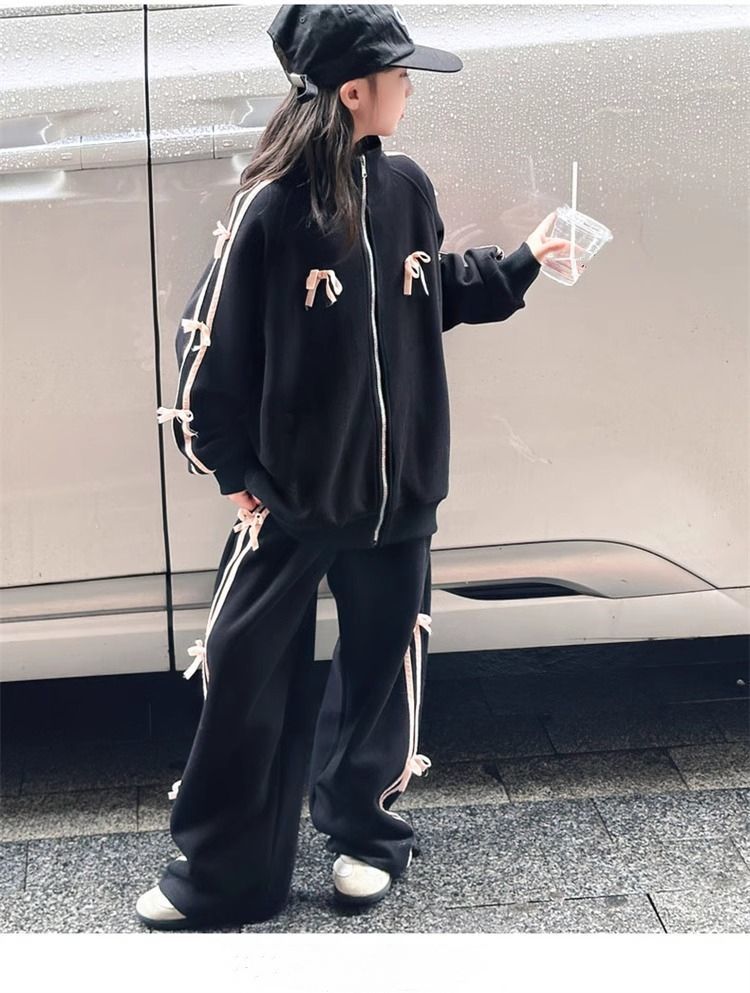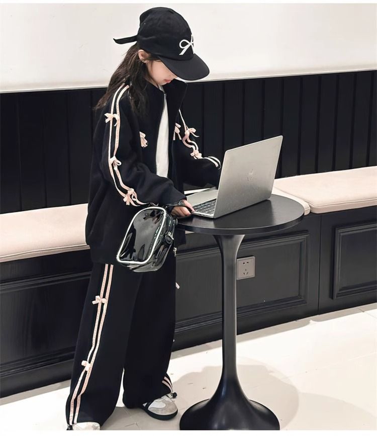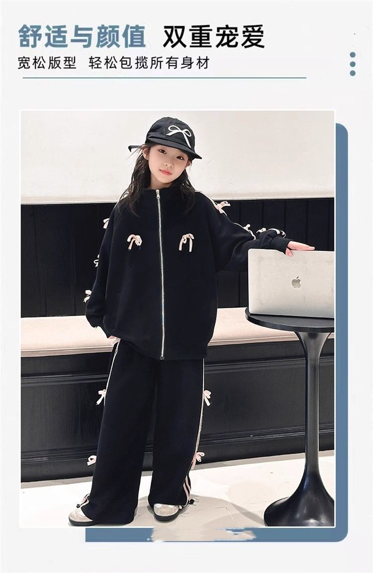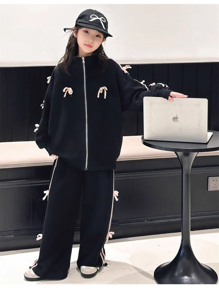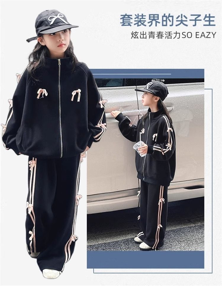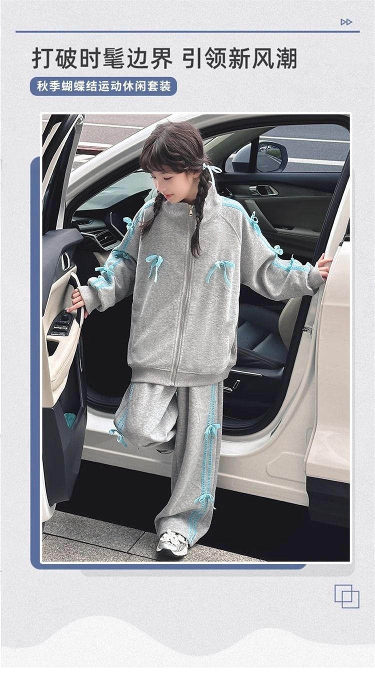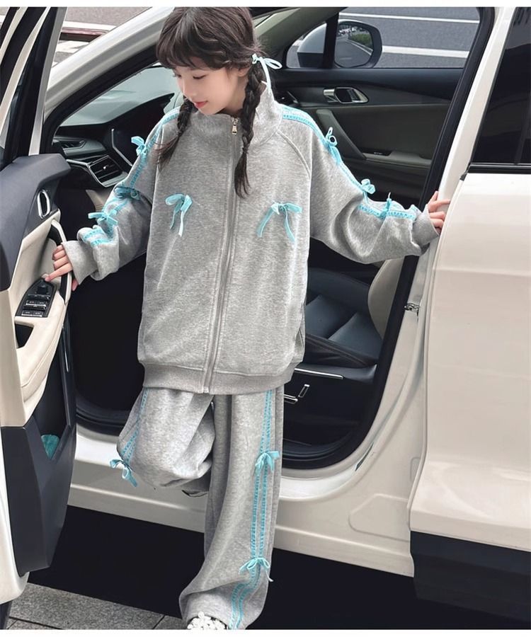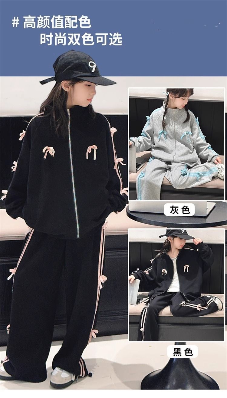 여자 운동복 정장 봄과 가을 2025 새로운 스타일 보우 스탠드 칼라 스웨터 재킷 캐주얼 넓은 다리 바지 유행스토어 가기