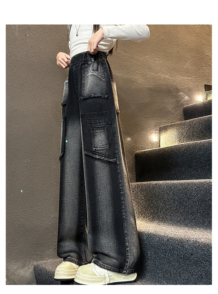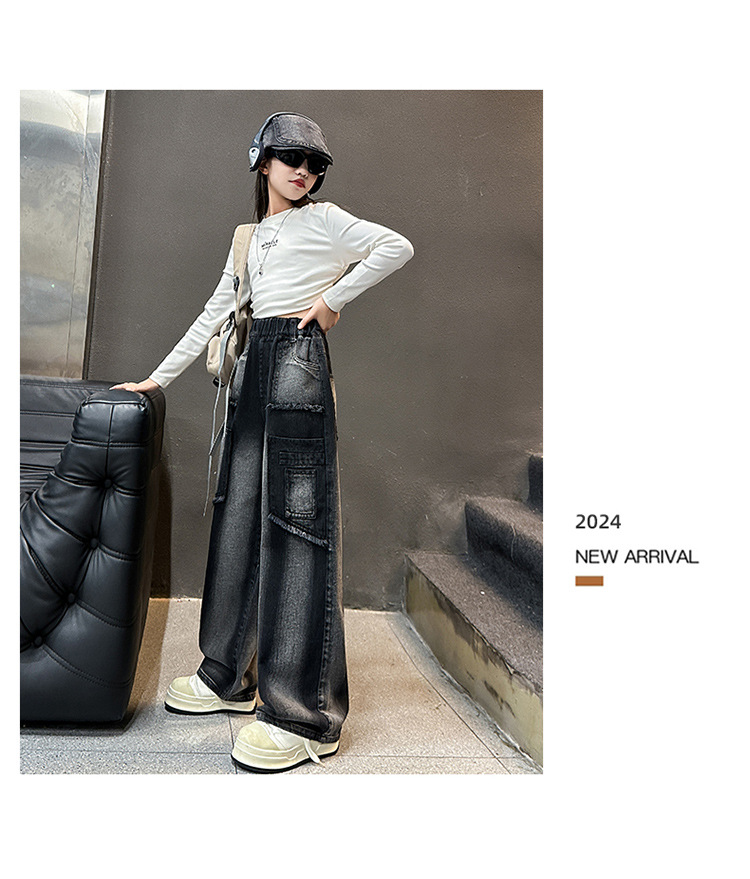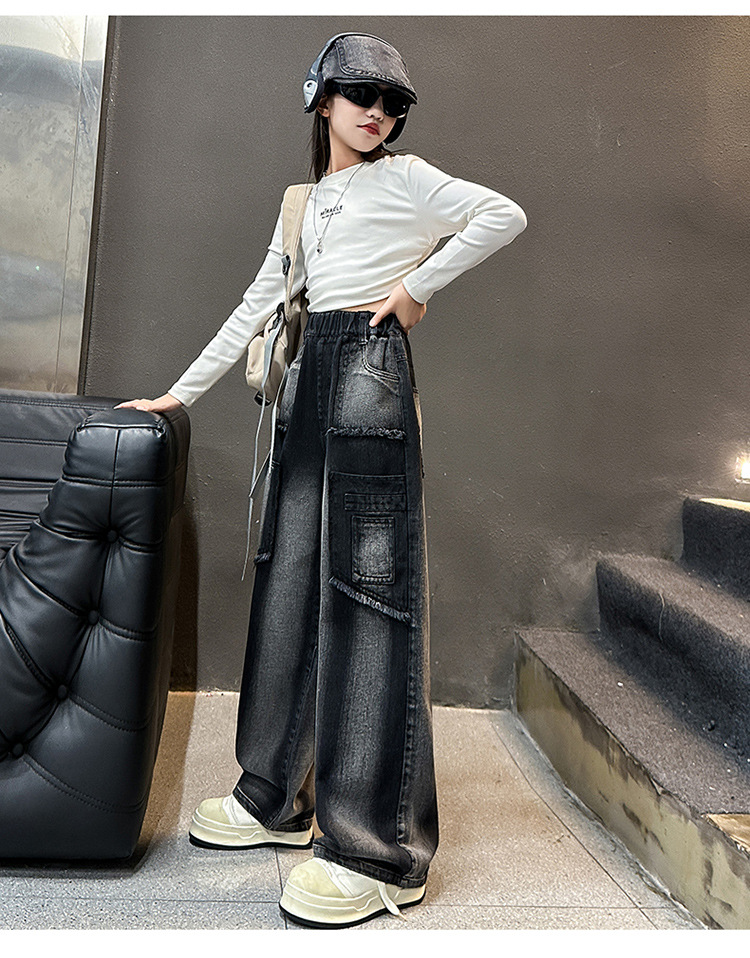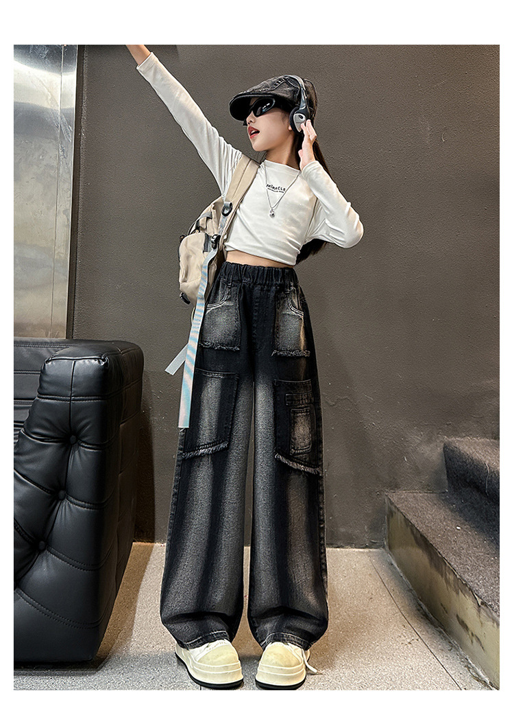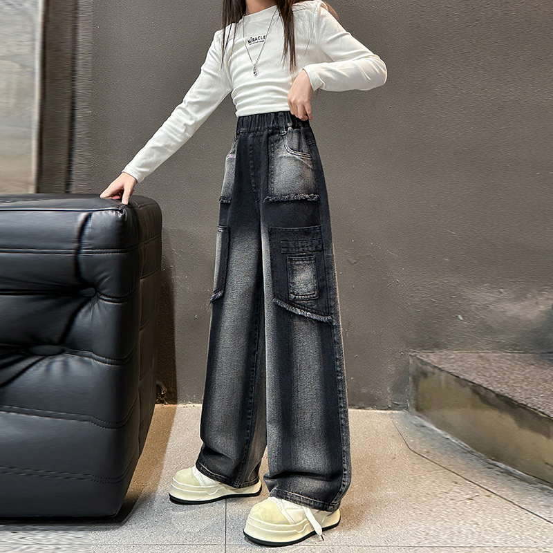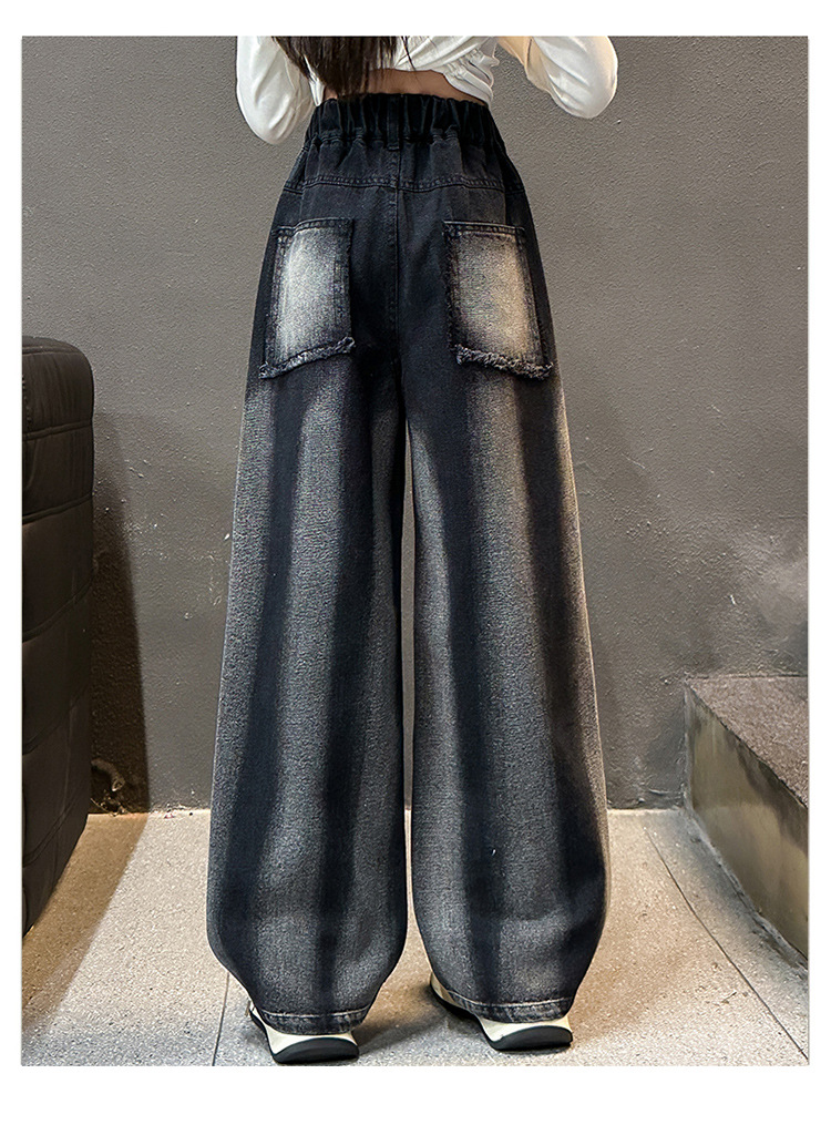 소녀 가을 바지 2024 새로운 서양 스타일 초가을 큰 어린이 가을 청바지 어린이 봄과 가을 스트레이트 와이드 다리 바지스토어 가기