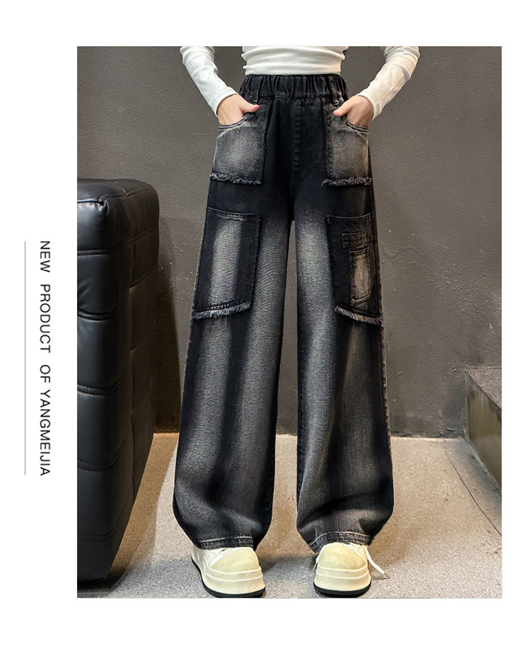 소녀 가을 바지 2024 새로운 서양 스타일 초가을 큰 어린이 가을 청바지 어린이 봄과 가을 스트레이트 와이드 다리 바지