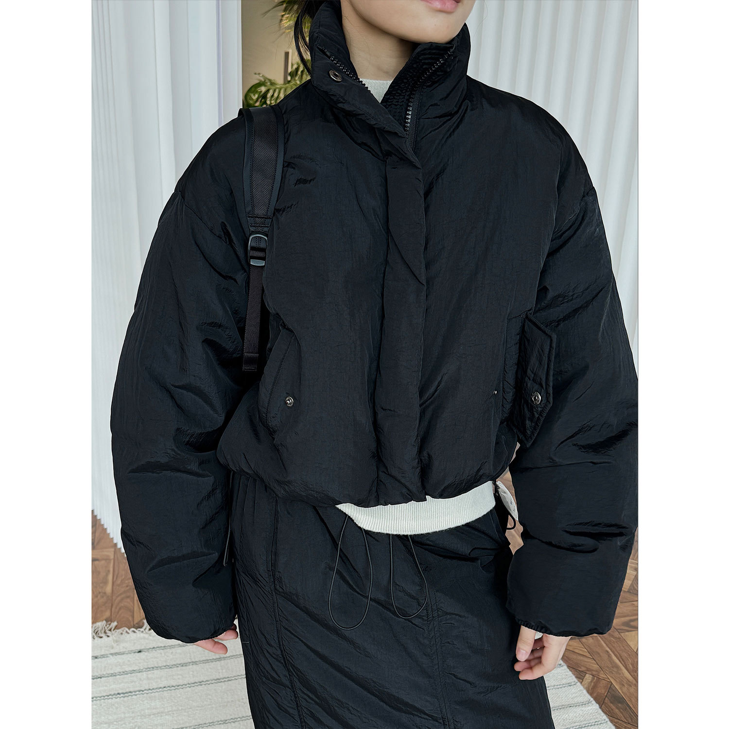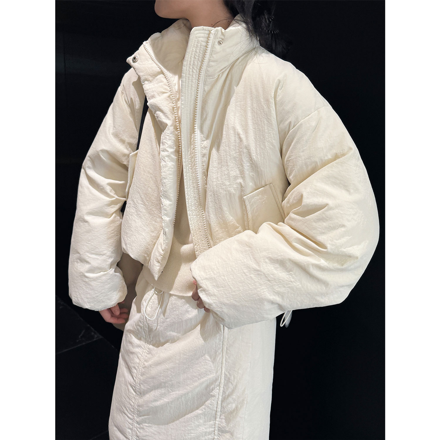 루푸 가을과 겨울 새로운 한국 스타일 유행 공기 느낌 수직 칼라 다운 재킷 짧은 프로필 작은 여성의 슬림 룩 재킷스토어 가기