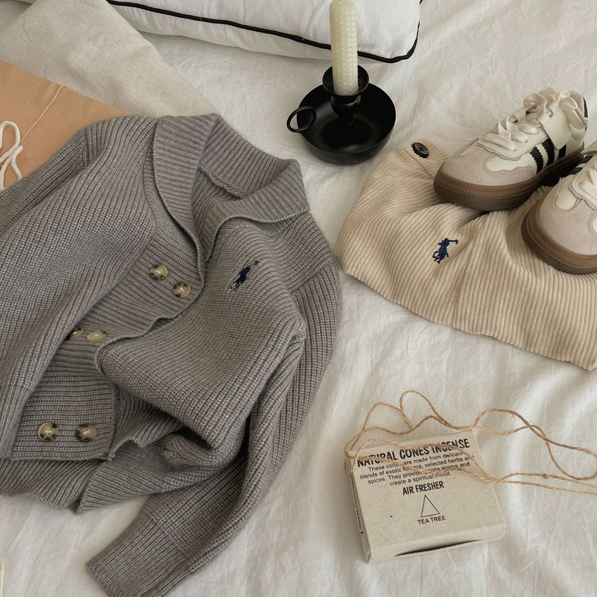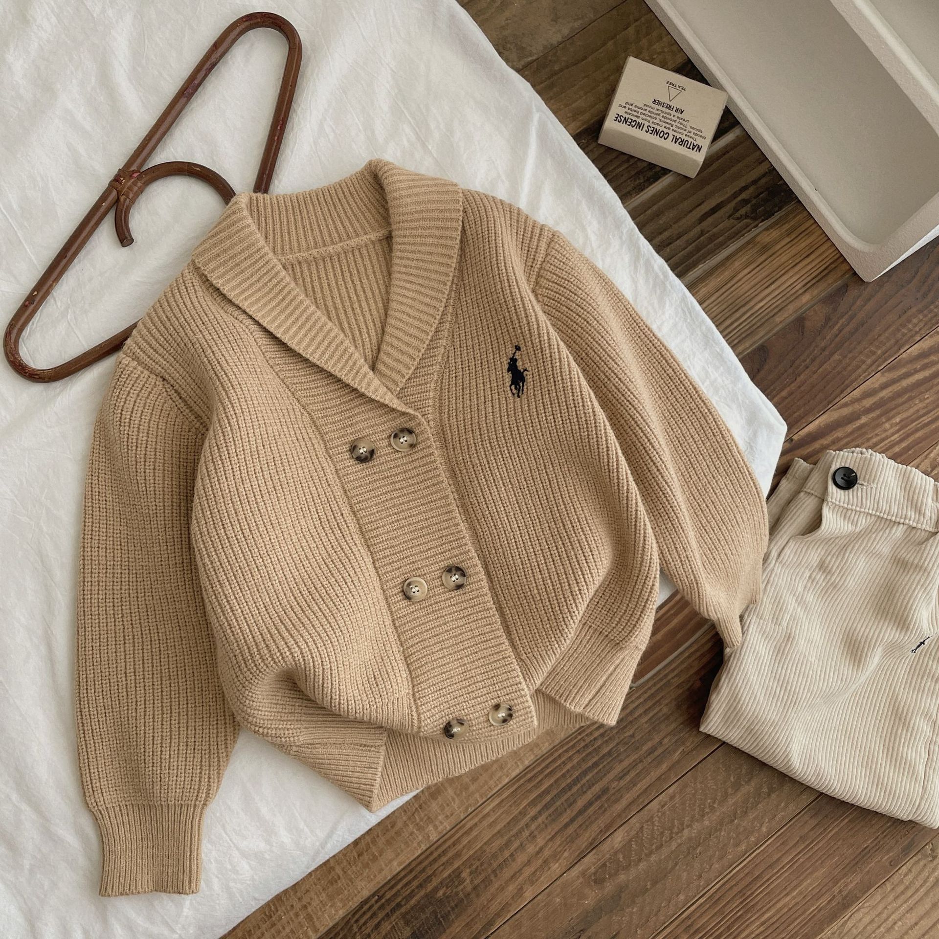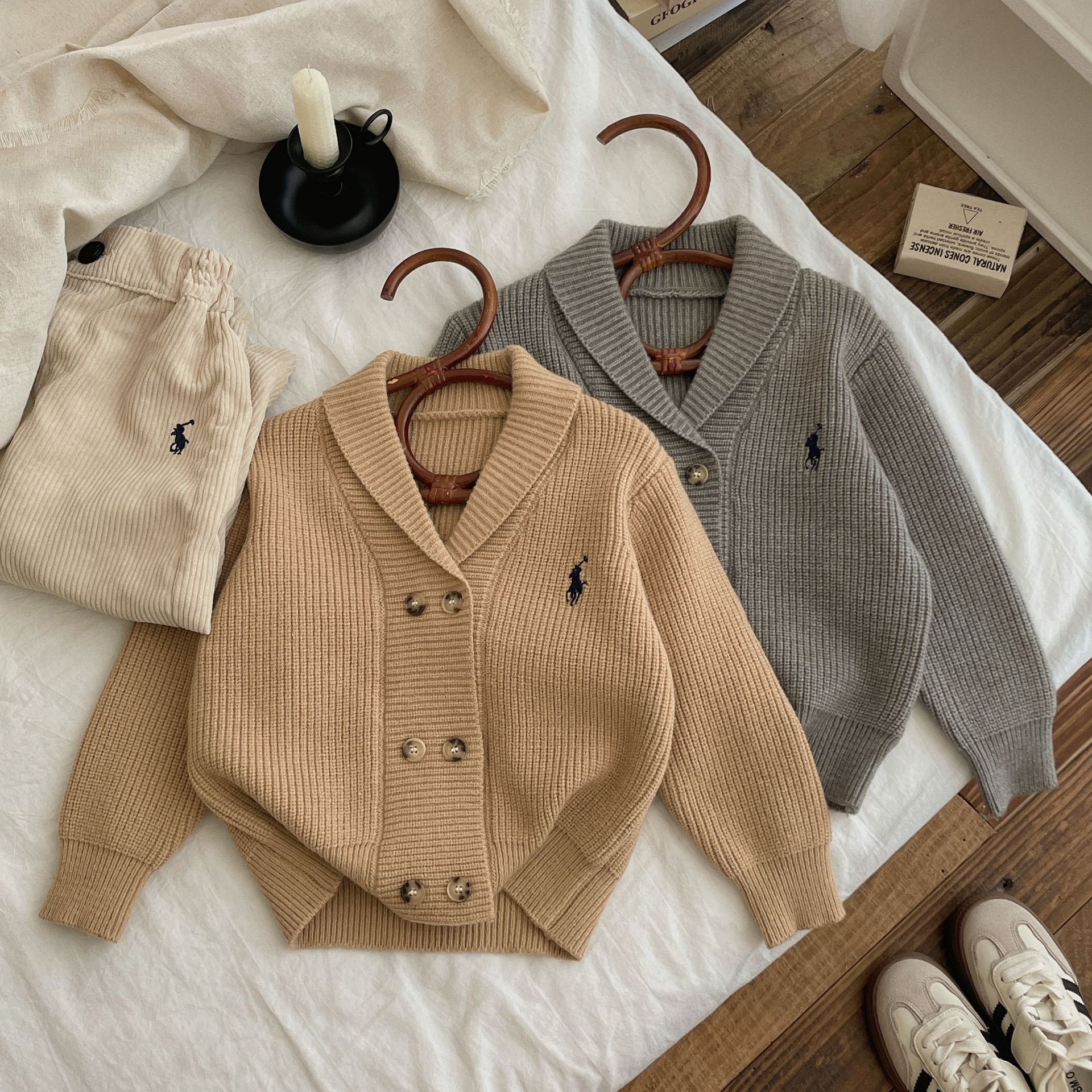 2025 가을, 겨울 새로운 스타일 옷깃 다목적 복고풍 더블 브레스트 스웨터 소년과 소녀를위한 한국 스타일 자수 서양식 니트 가디건