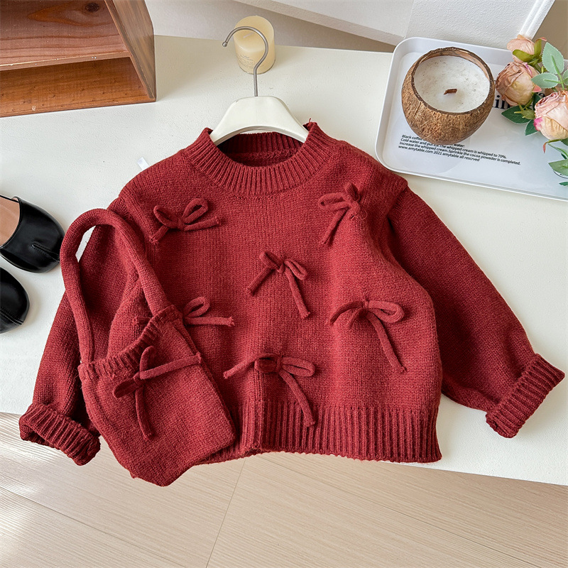 통 싱위안 가을 새로운 한국 스타일 귀여운 빨간 활 스웨터 코트 소녀 니트 셔츠 꽃 바지 세트