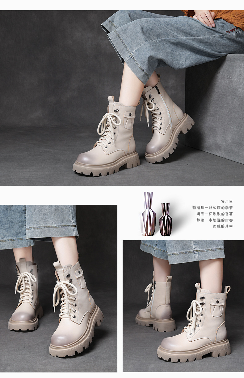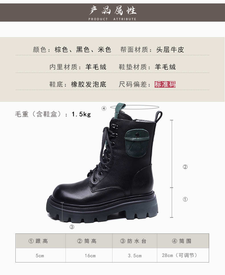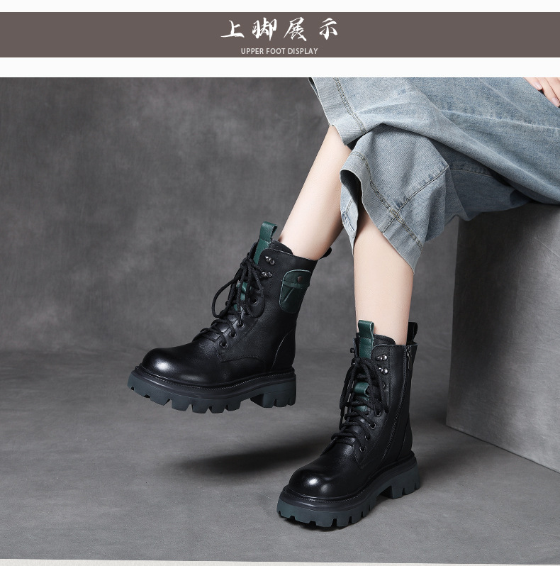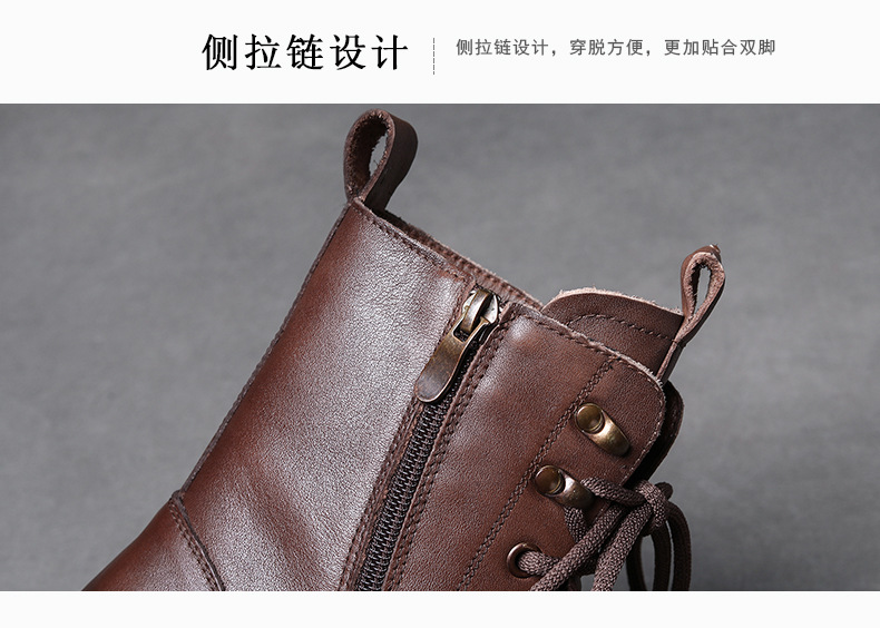 Delphinium 가을 및 겨울 양모 부츠 헤드 레이어 Cowhide 캐주얼 영국식 마틴 부츠 두꺼운 싱글 미드 힐 따뜻한 발목 부츠