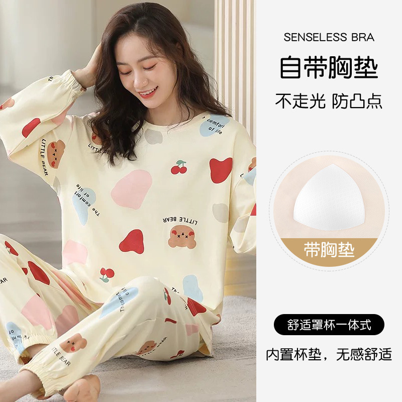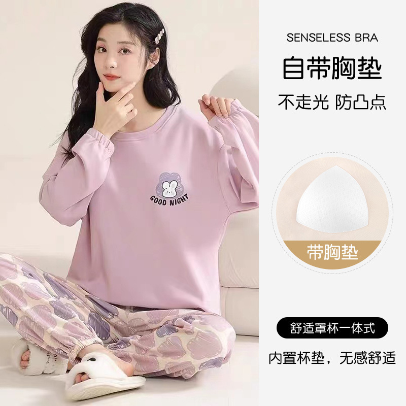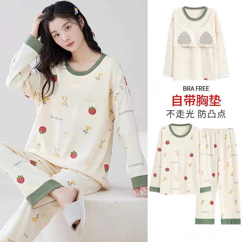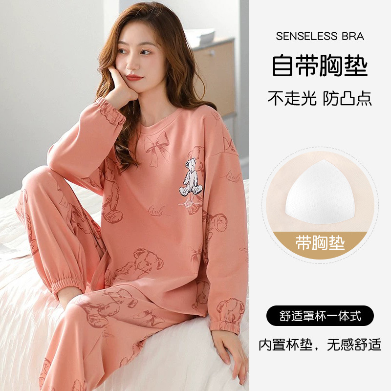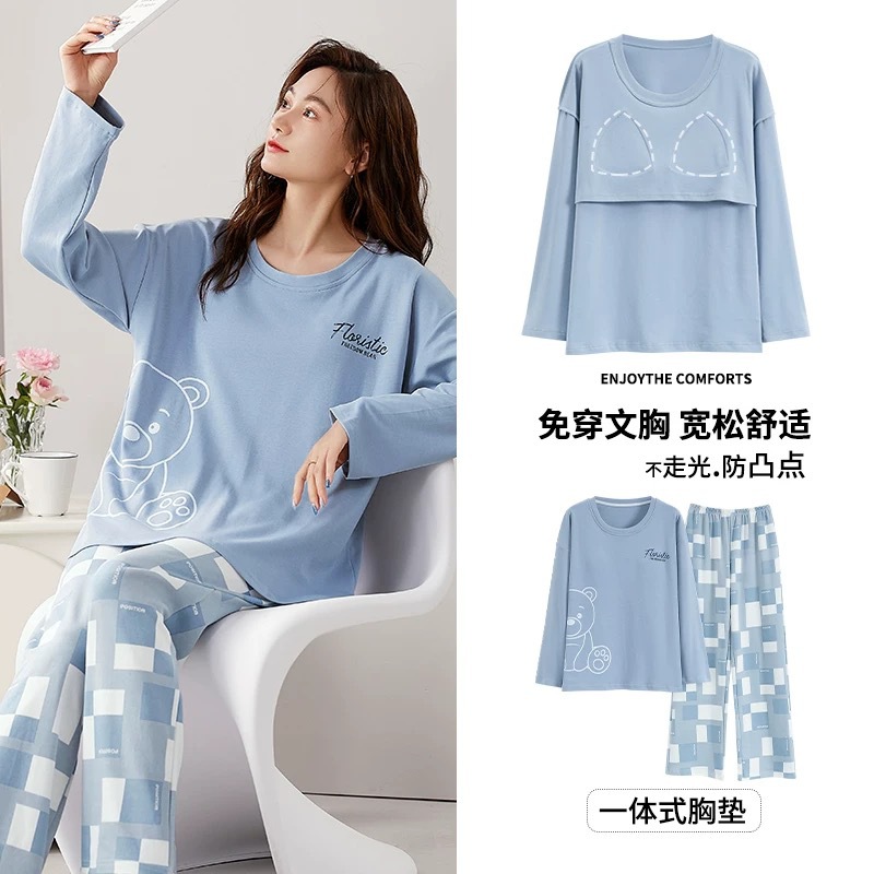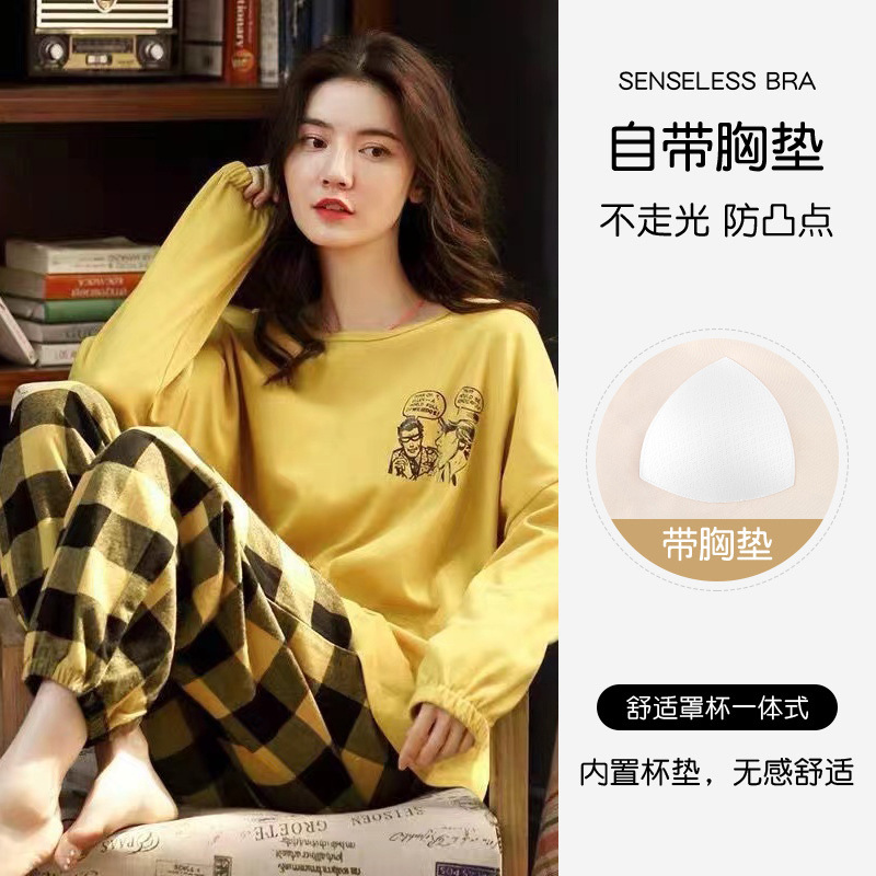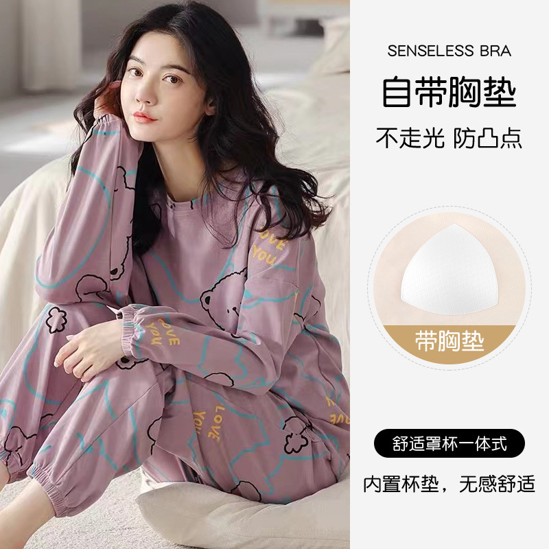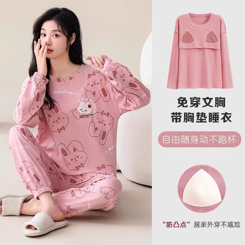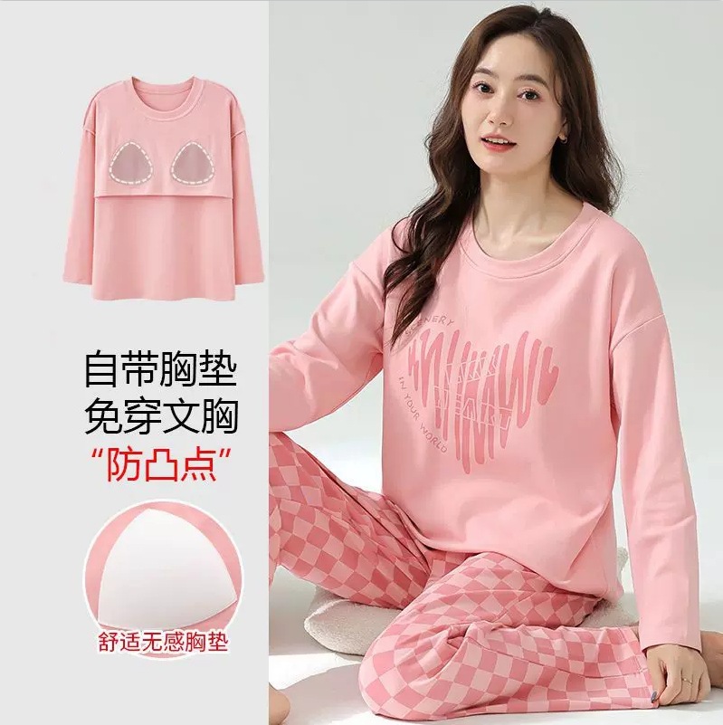 파자마 여성의 봄과 가을 외부 가정 옷을 입고 2024 플러스 사이즈 가슴 패드 긴 소매 바지 세트 새로운 스타일스토어 가기