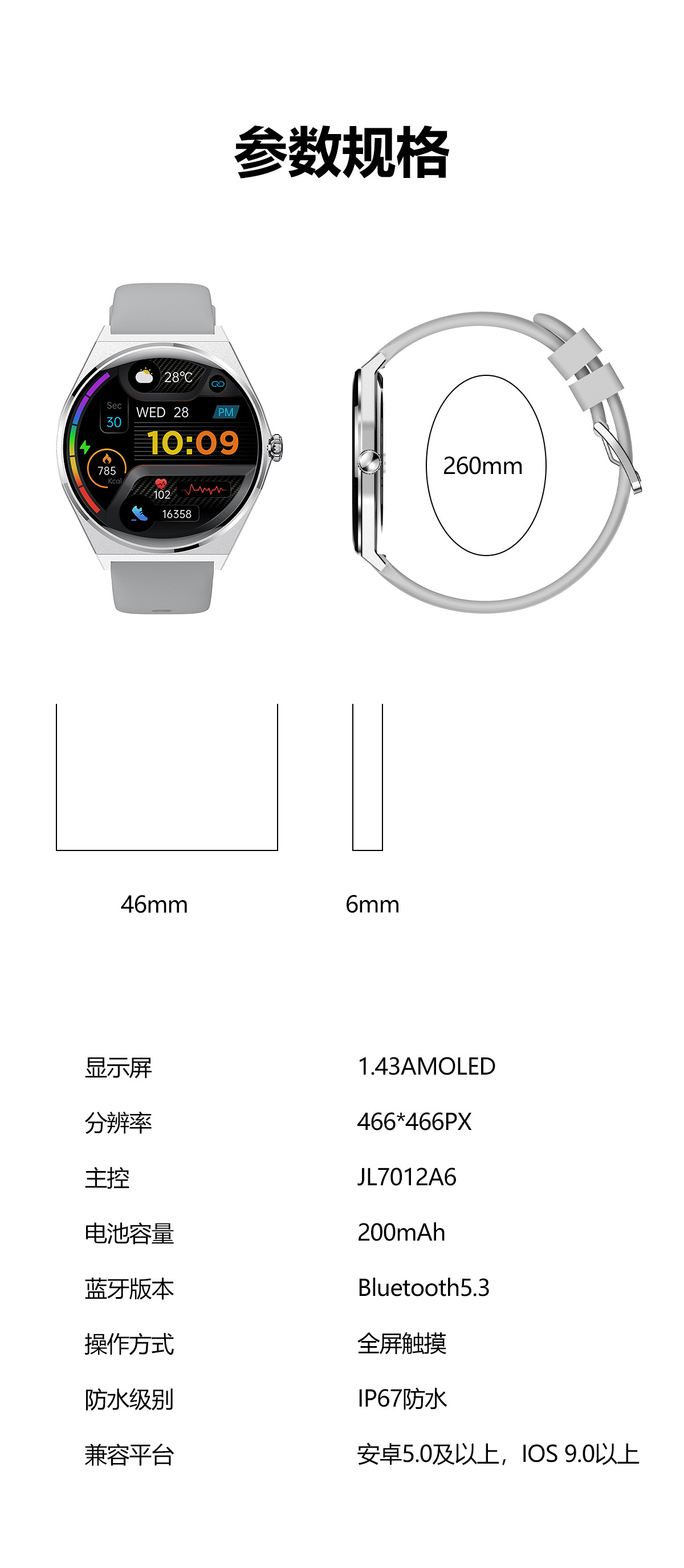 국경 간 새로운 MT56 스마트 시계 슬림 1.43AMOLED HD 화면 블루투스 IP68 깊이 방수 호출