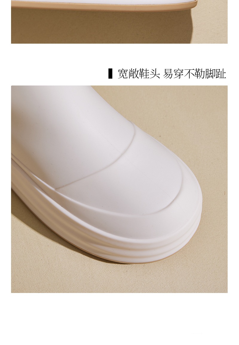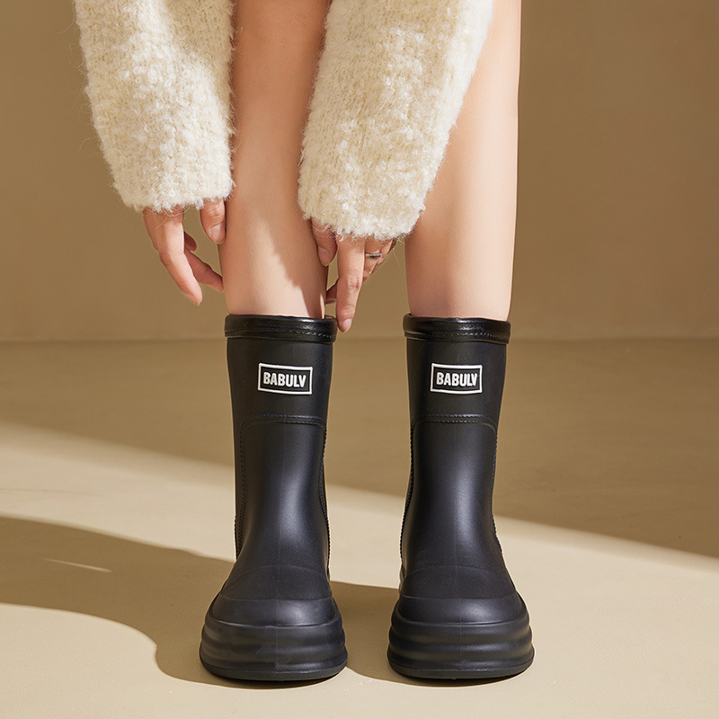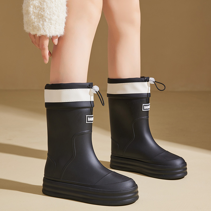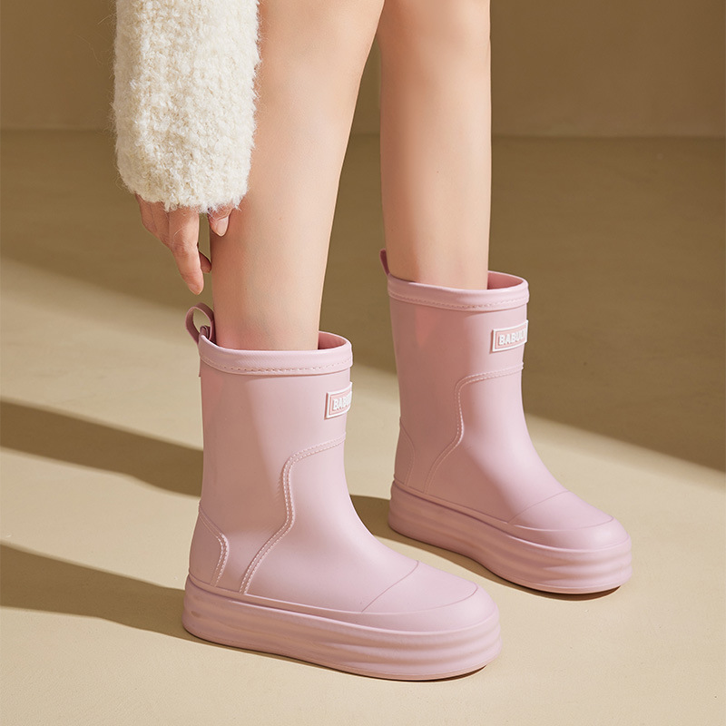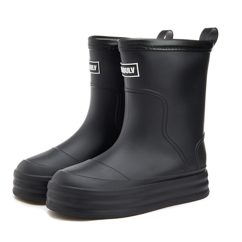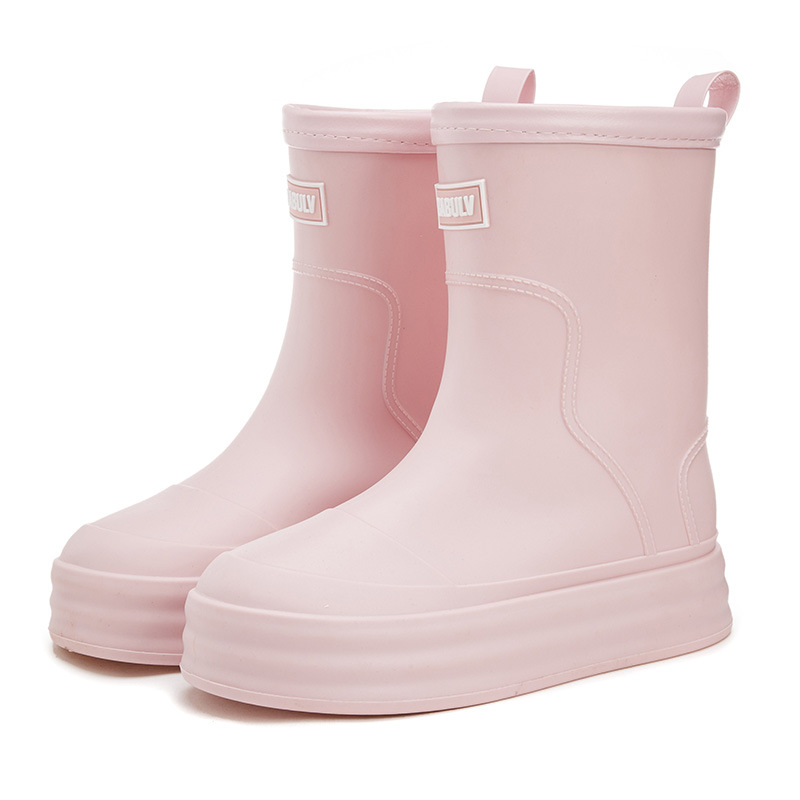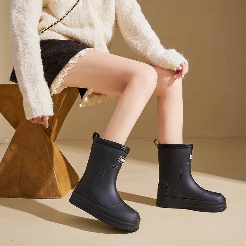 성인용 중간 길이 여성용 레인부츠, 패셔너블한 두꺼운 밑창의 한국 스타일 레인부츠, 외부 착용 가능한 플랫 밑창 고무신, 슬립온 방수 신발스토어 가기