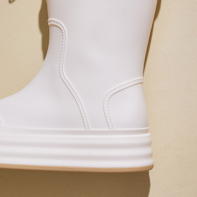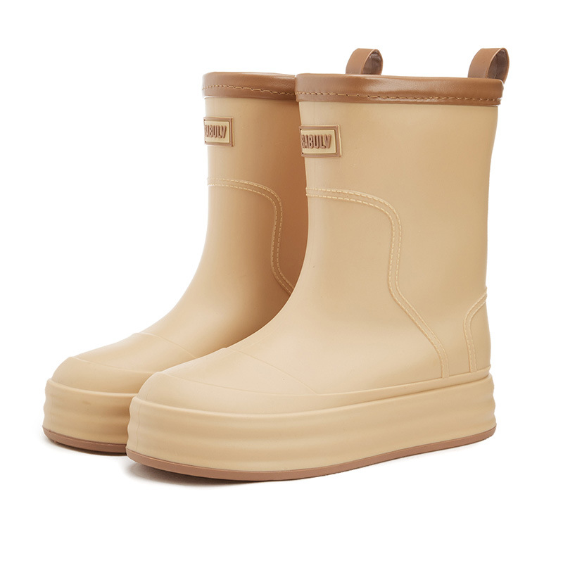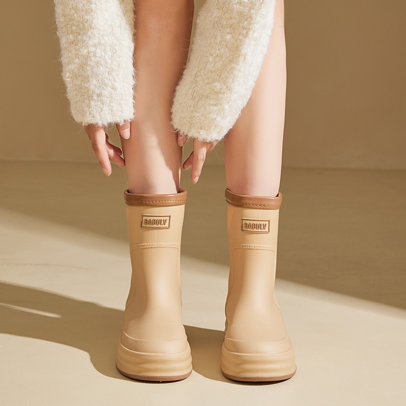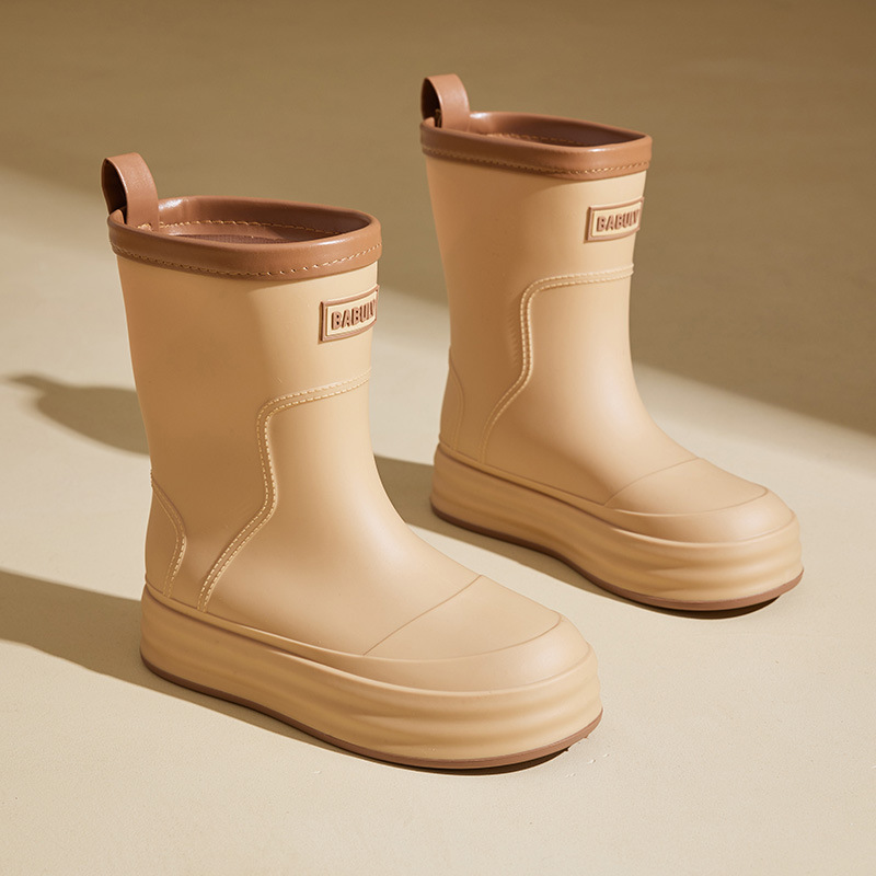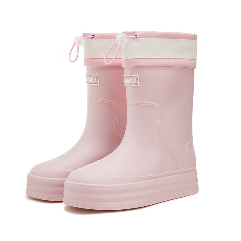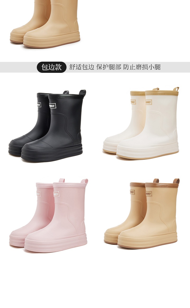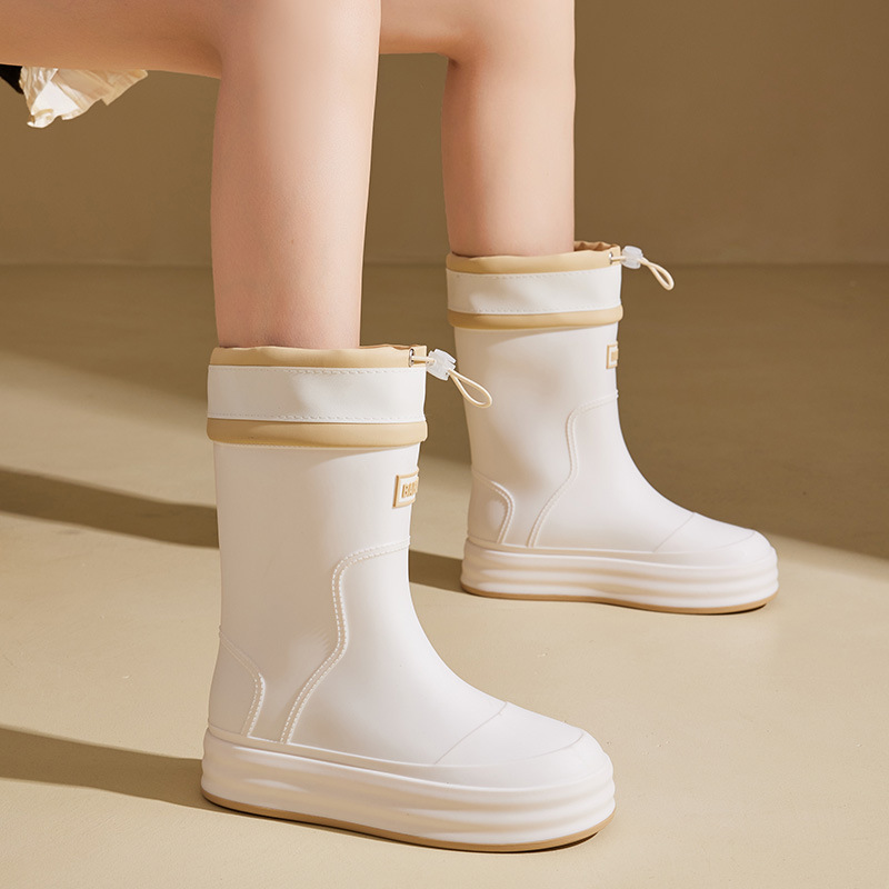 성인용 중간 길이 여성용 레인부츠, 패셔너블한 두꺼운 밑창의 한국 스타일 레인부츠, 외부 착용 가능한 플랫 밑창 고무신, 슬립온 방수 신발스토어 가기