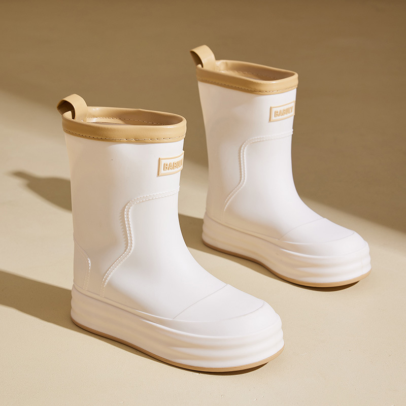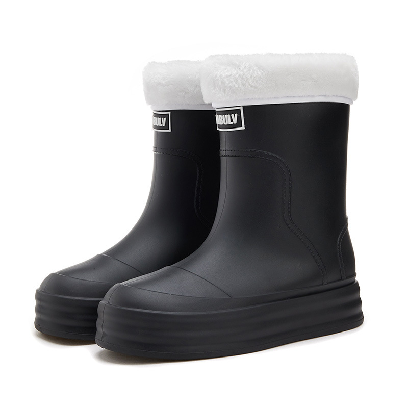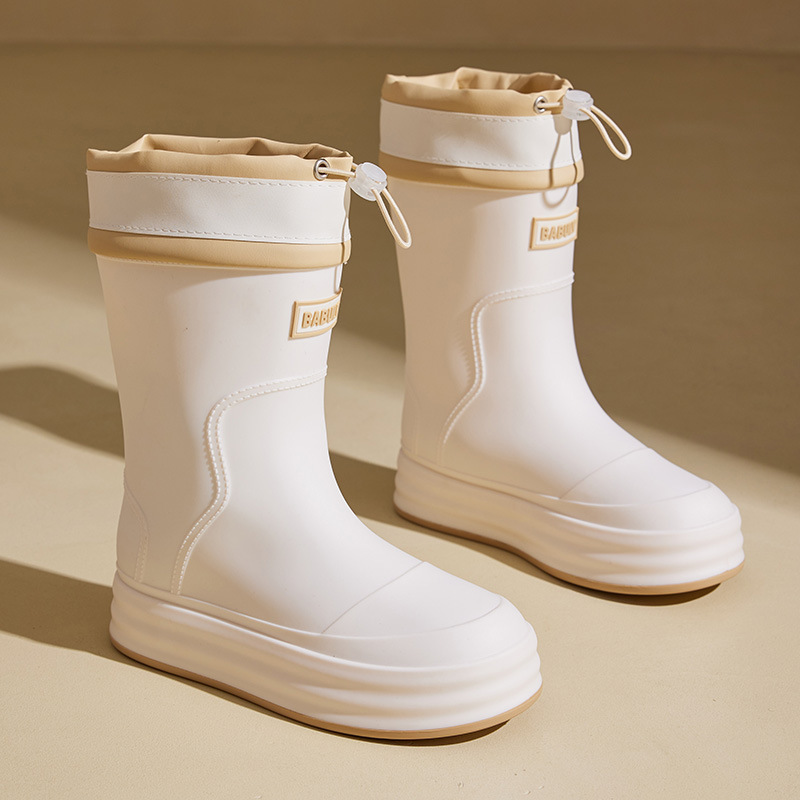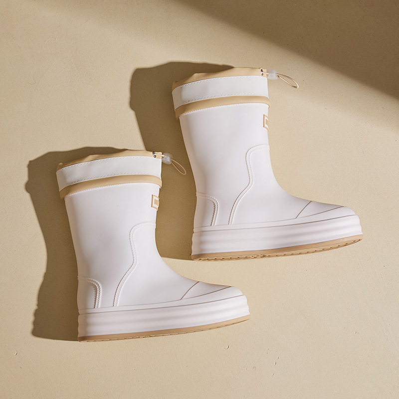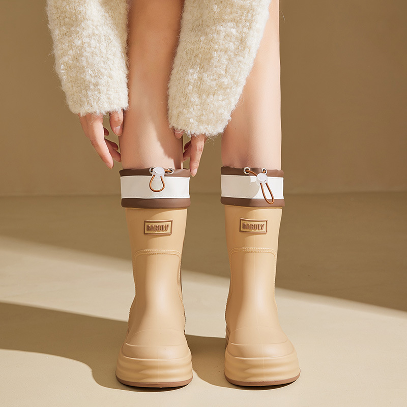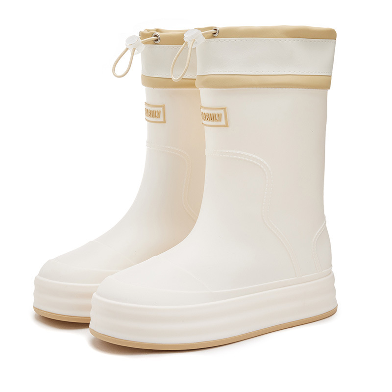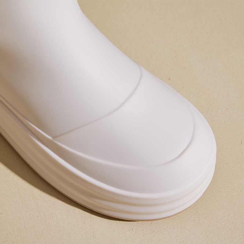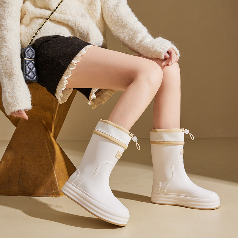 성인용 중간 길이 여성용 레인부츠, 패셔너블한 두꺼운 밑창의 한국 스타일 레인부츠, 외부 착용 가능한 플랫 밑창 고무신, 슬립온 방수 신발스토어 가기