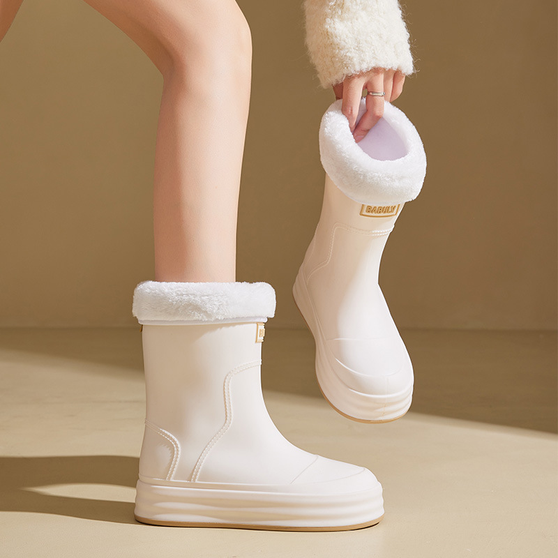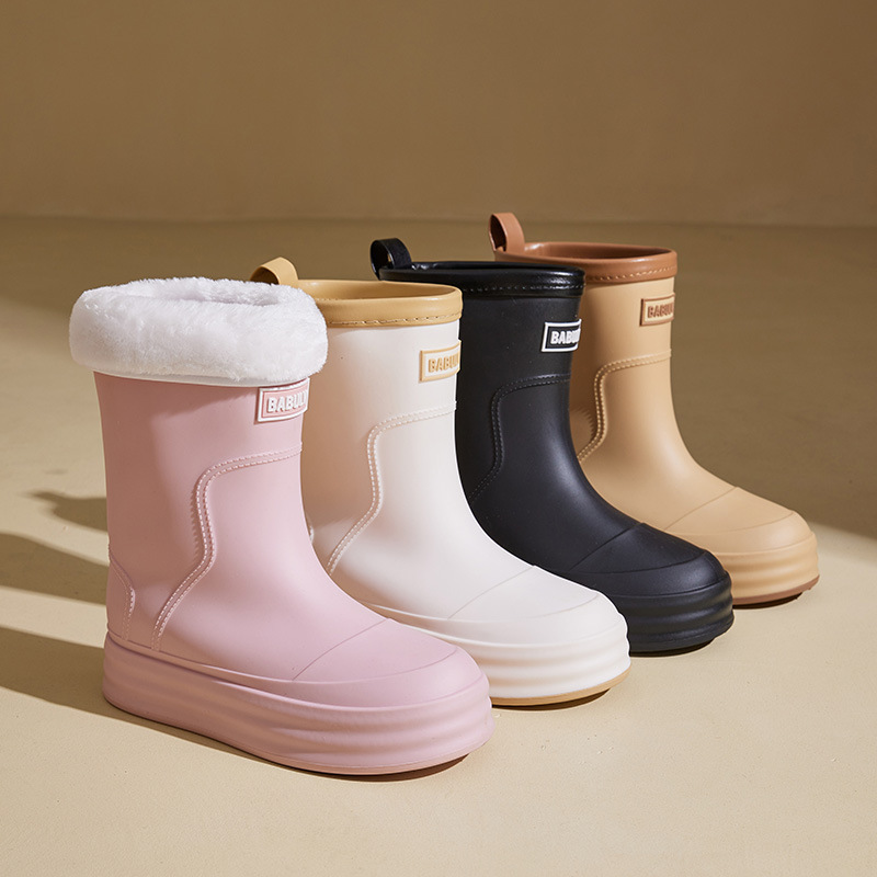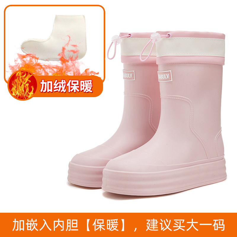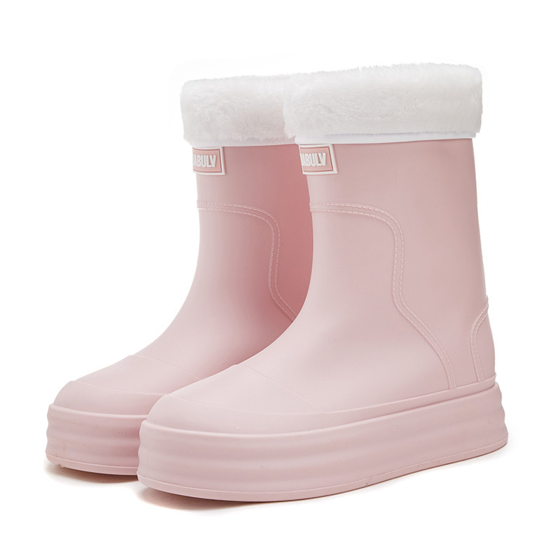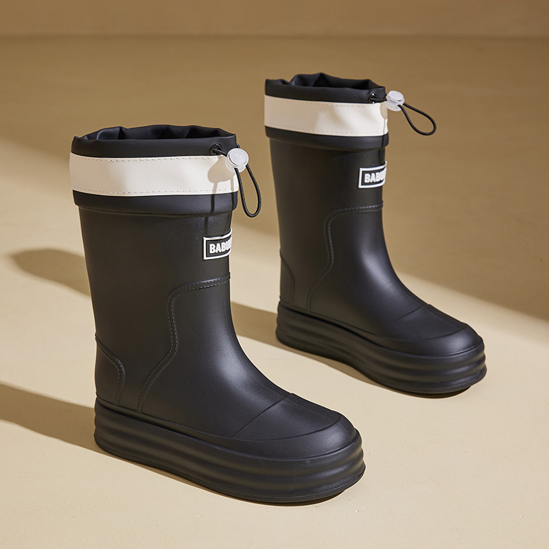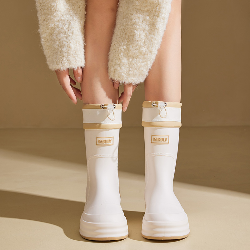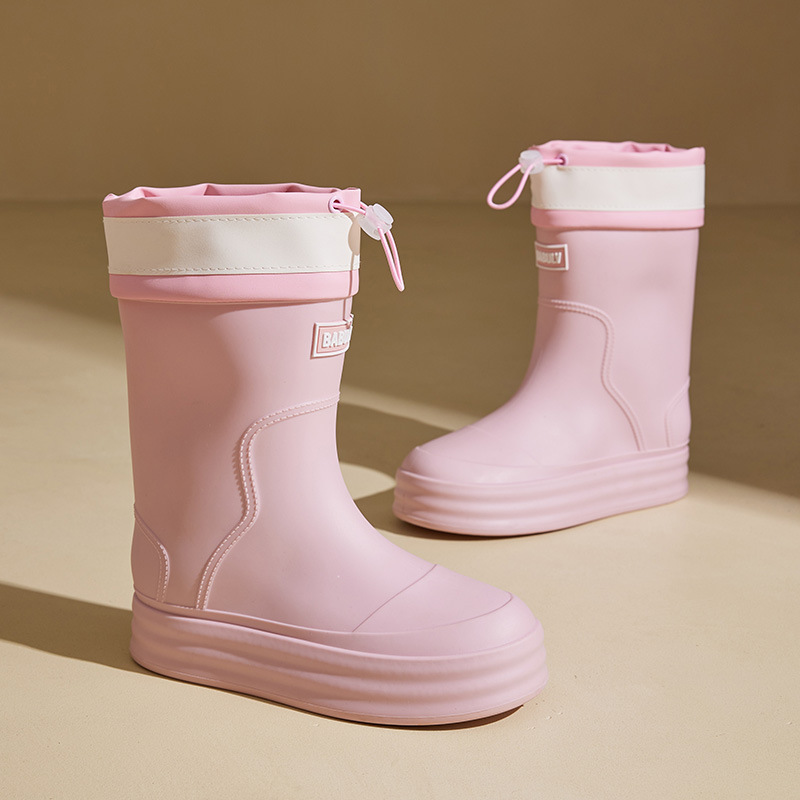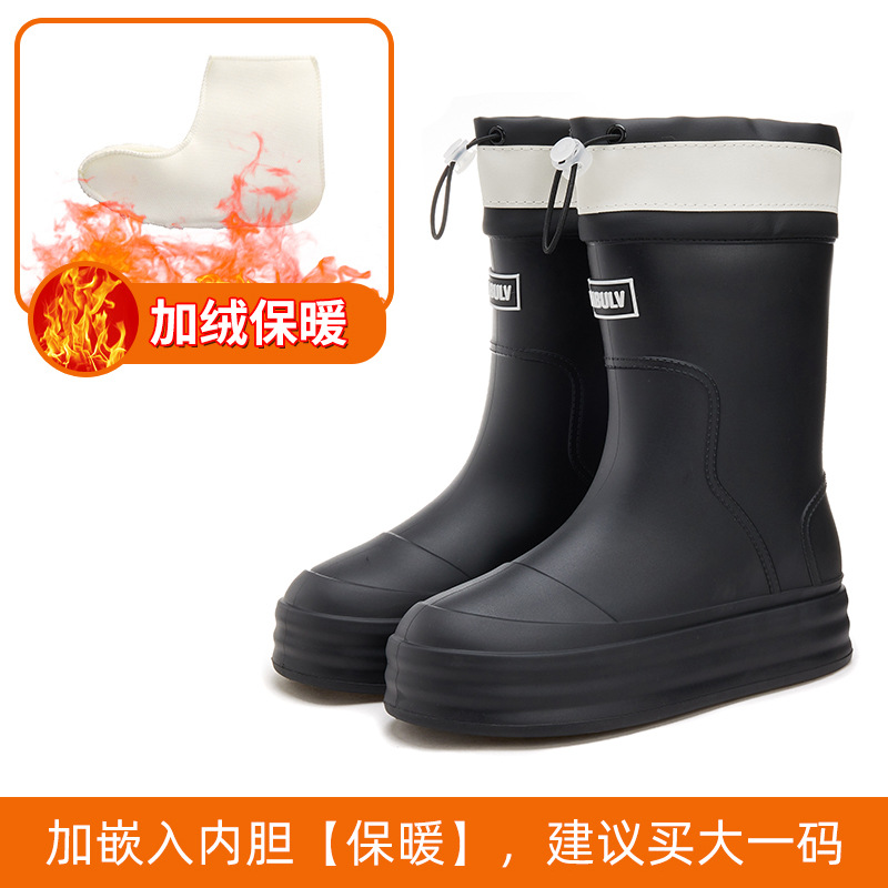 성인용 중간 길이 여성용 레인부츠, 패셔너블한 두꺼운 밑창의 한국 스타일 레인부츠, 외부 착용 가능한 플랫 밑창 고무신, 슬립온 방수 신발스토어 가기