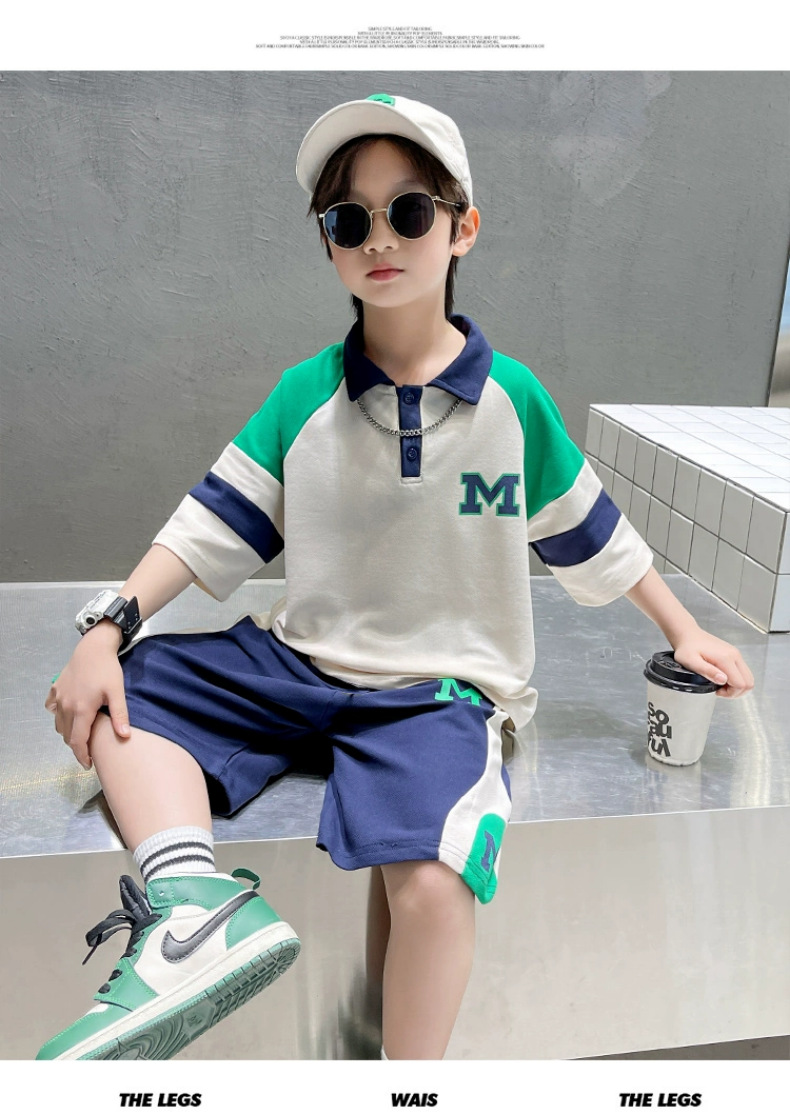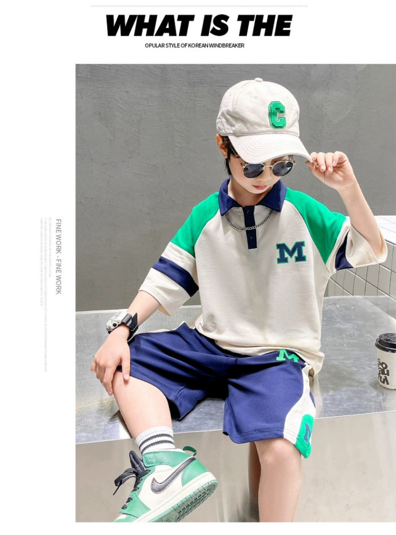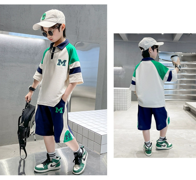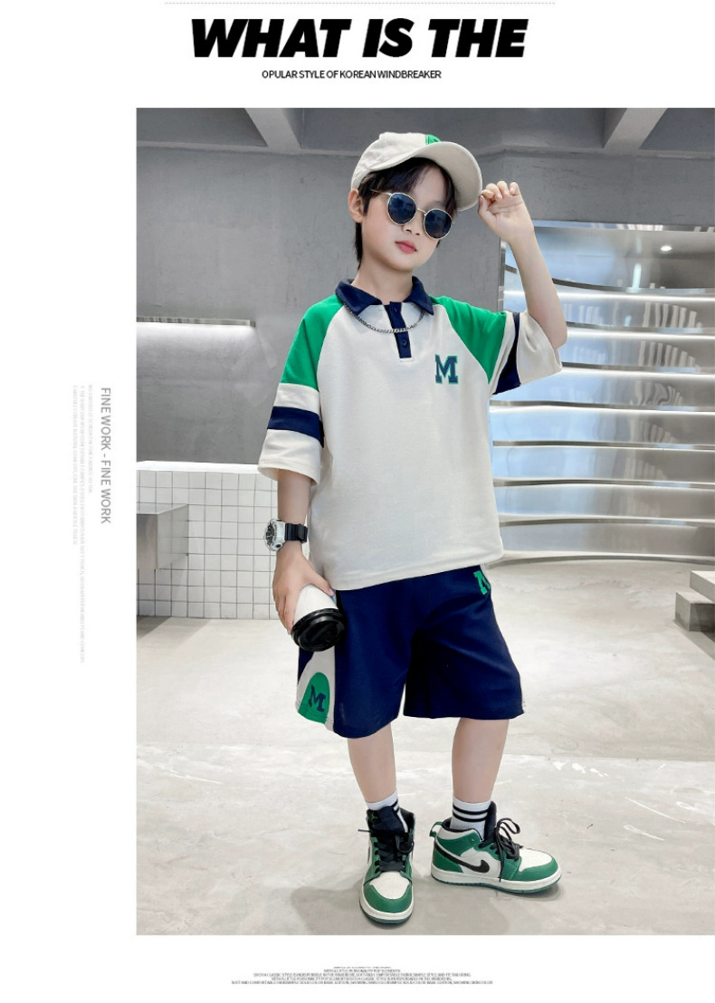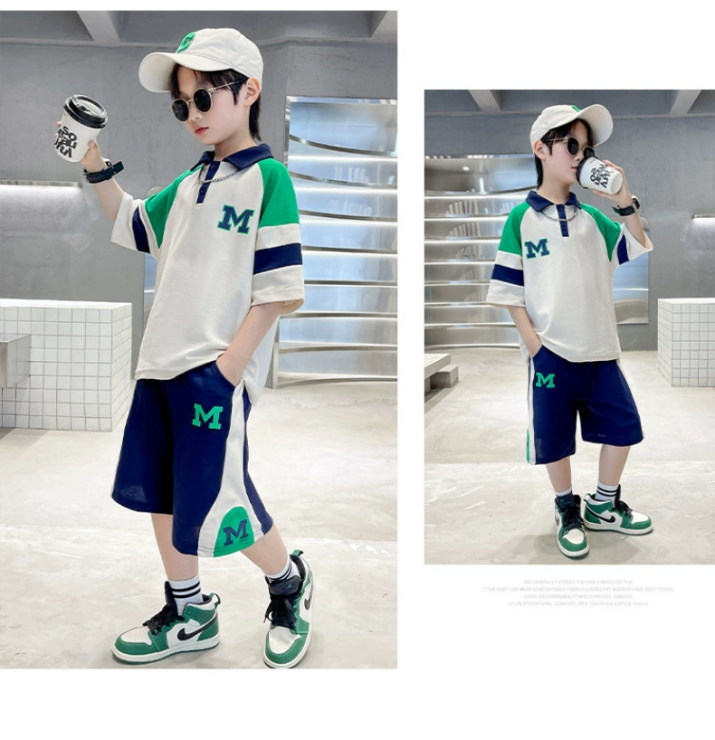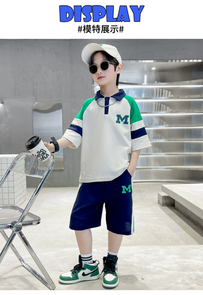 여름 어린이 트렌디 한 멋진 패션 잘 생긴 폴로 셔츠 캐주얼 세트 소년 컬러 대비 편지 짧은 소매 반바지 투피스 세트스토어 가기