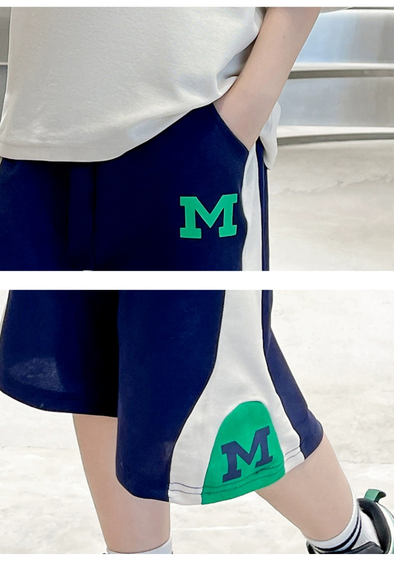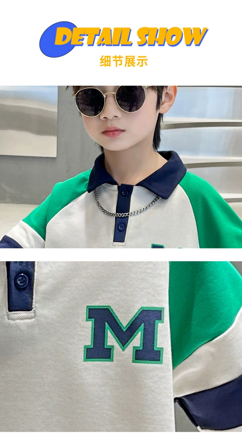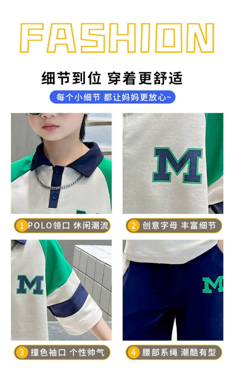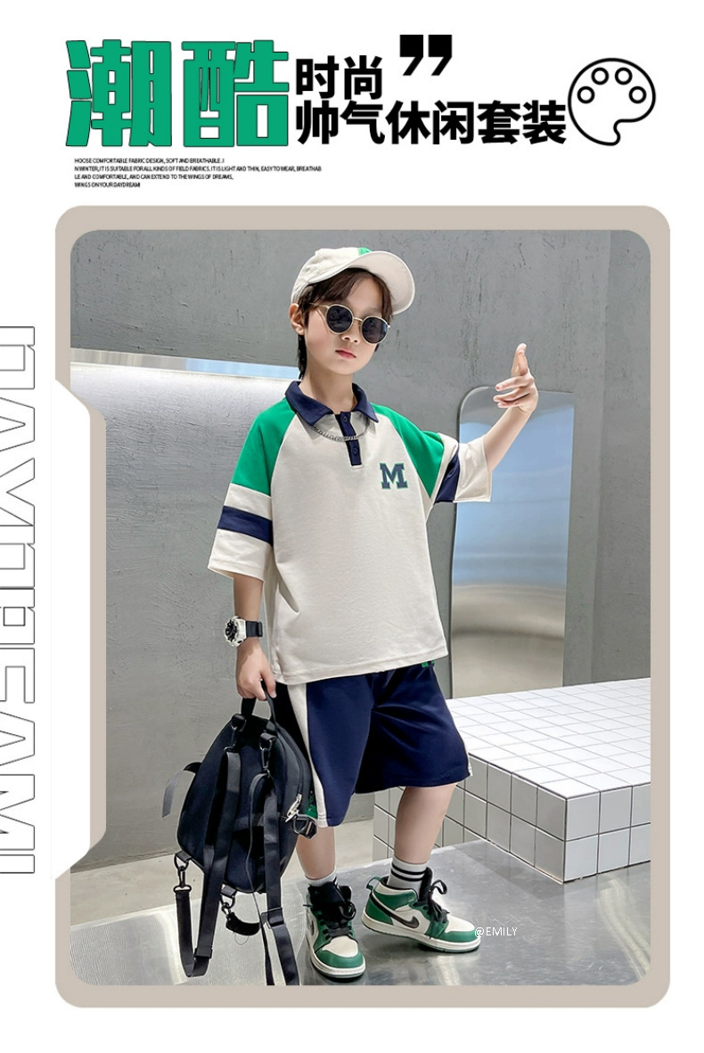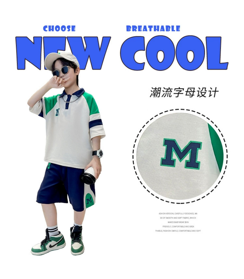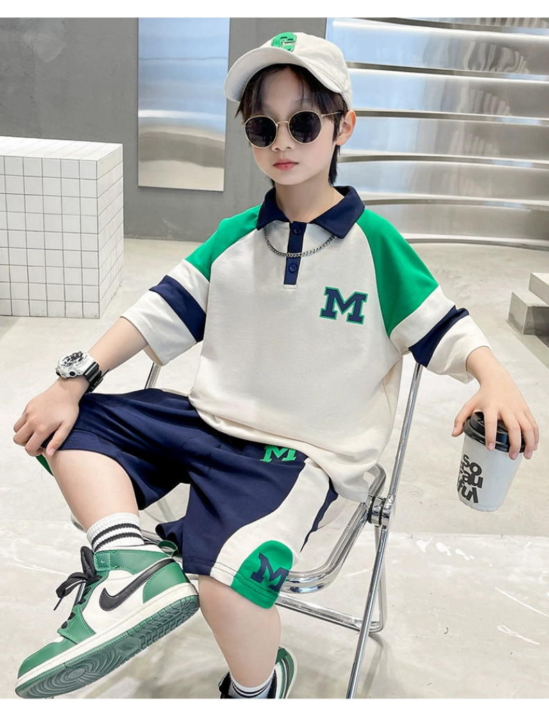 여름 어린이 트렌디 한 멋진 패션 잘 생긴 폴로 셔츠 캐주얼 세트 소년 컬러 대비 편지 짧은 소매 반바지 투피스 세트스토어 가기
