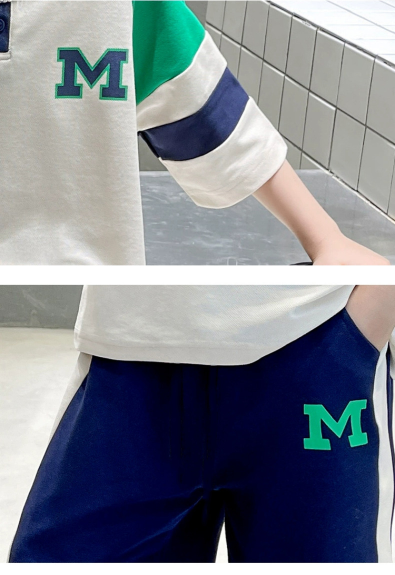 여름 어린이 트렌디 한 멋진 패션 잘 생긴 폴로 셔츠 캐주얼 세트 소년 컬러 대비 편지 짧은 소매 반바지 투피스 세트