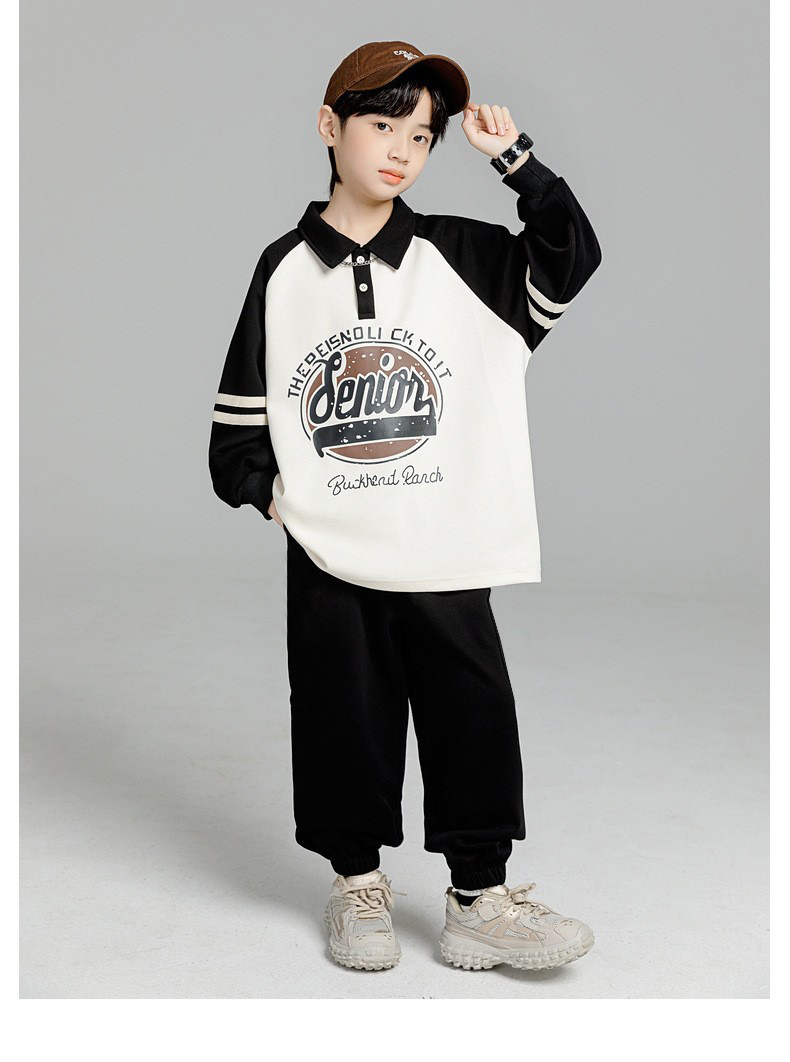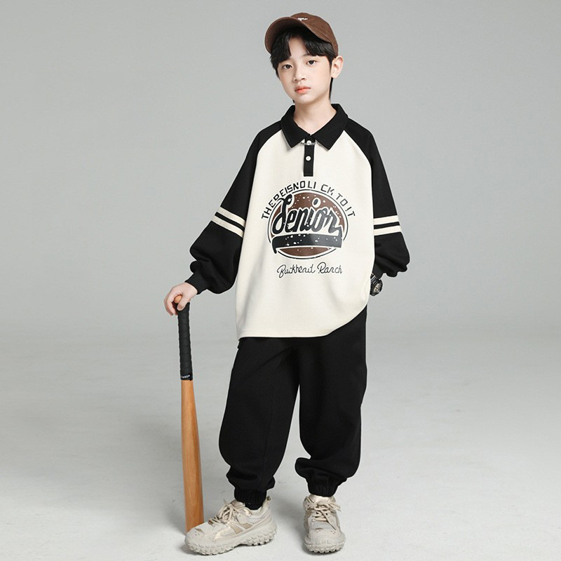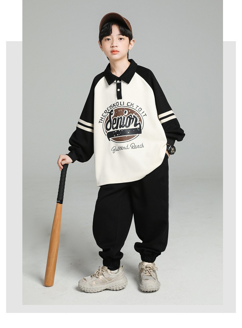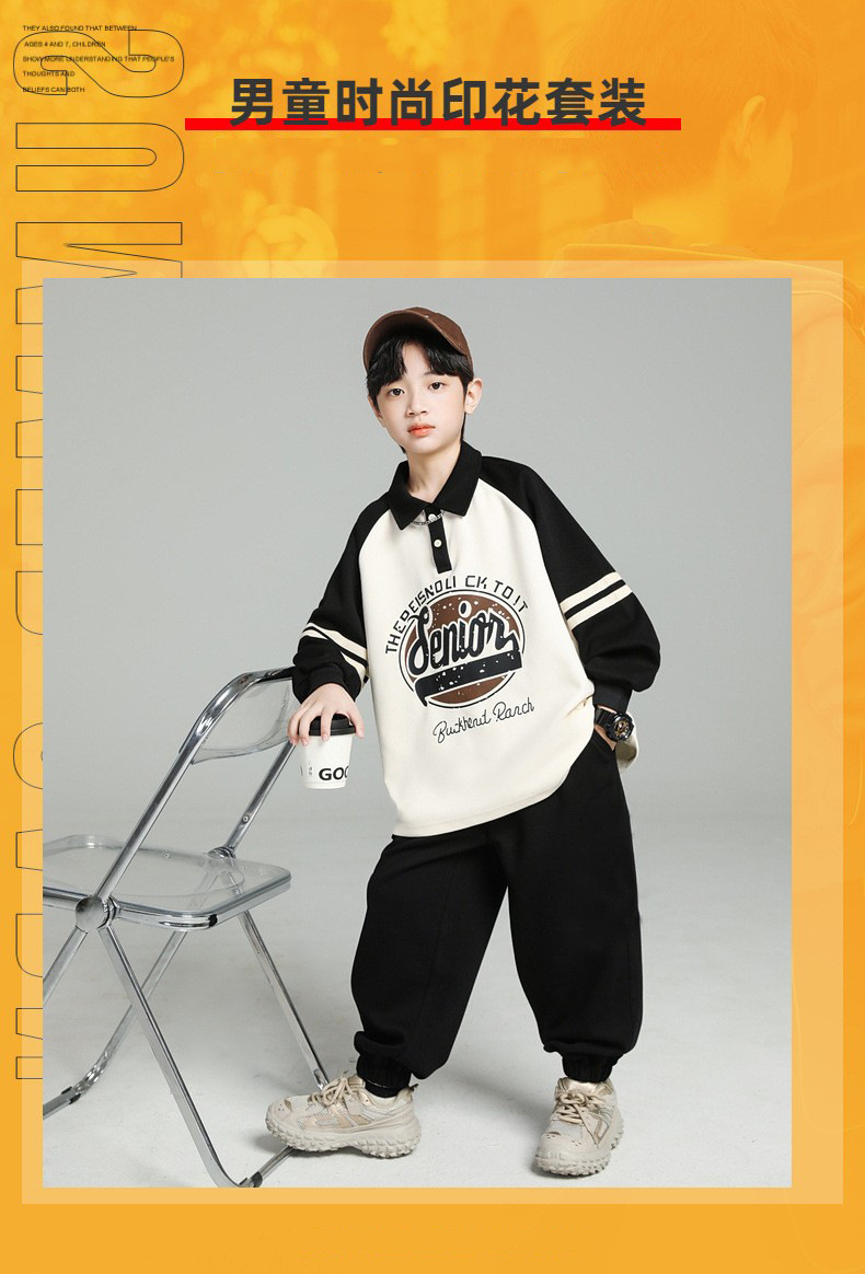 儿童时尚潮范印花翻领纽扣休闲套装中大童帅气宽松卫衣卫裤两件套