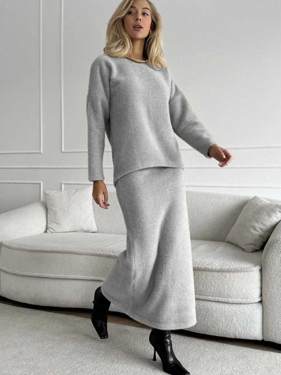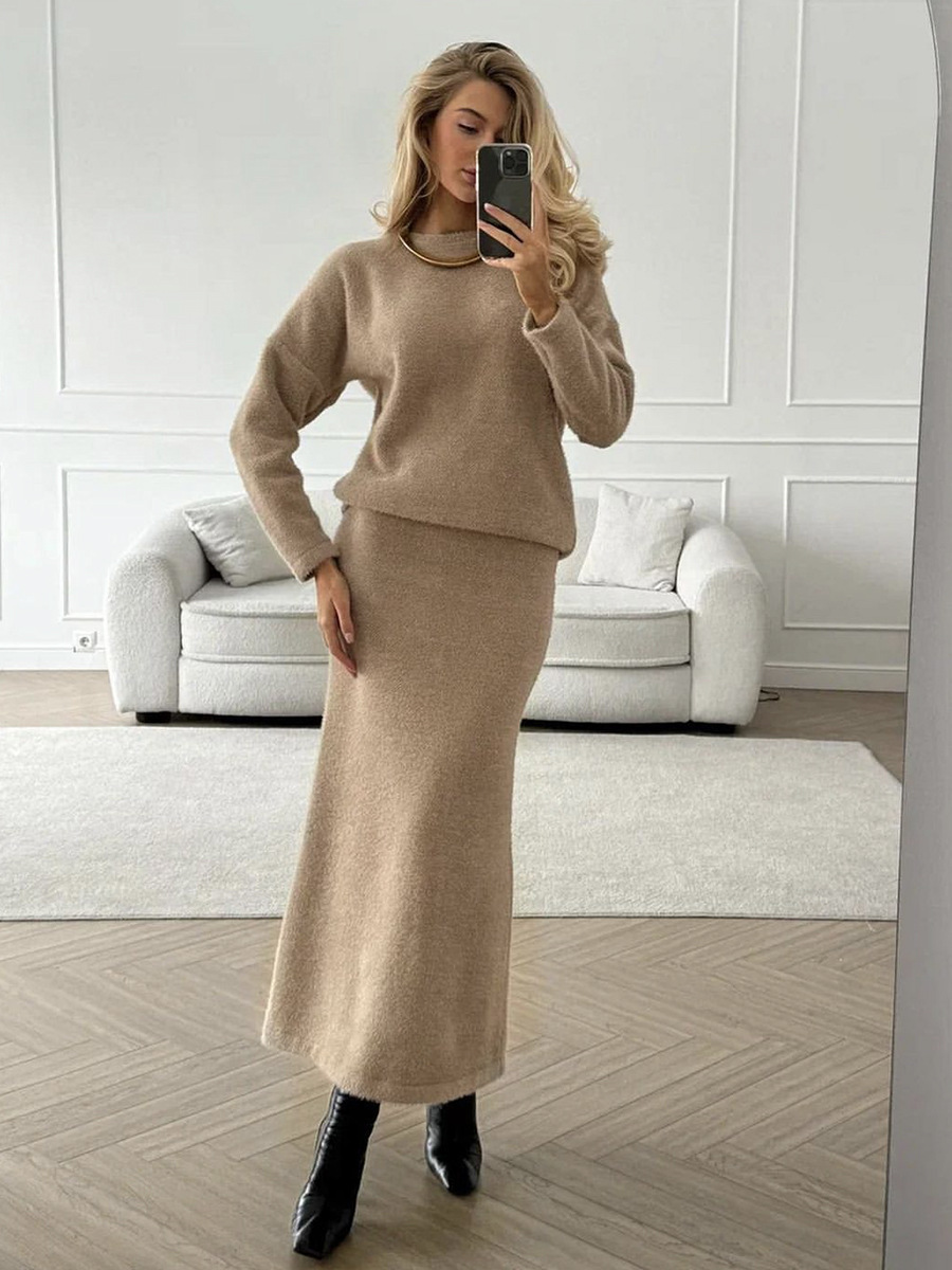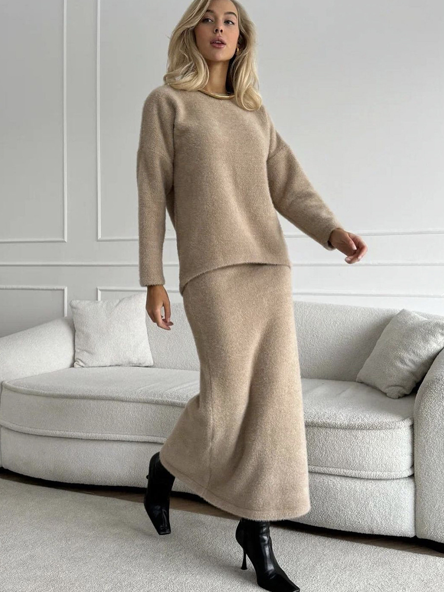 2025 가을 겨울 우아한 부드러운 두꺼운 라운드 넥 스웨터 + 피쉬 테일 스커트 투피스 여성 OL 스타일 탑 + 스커트 세트