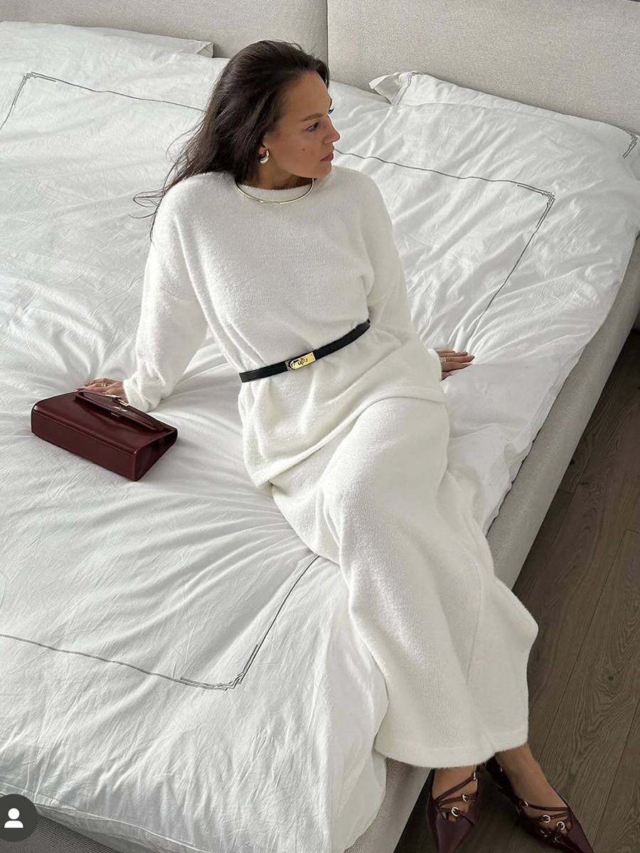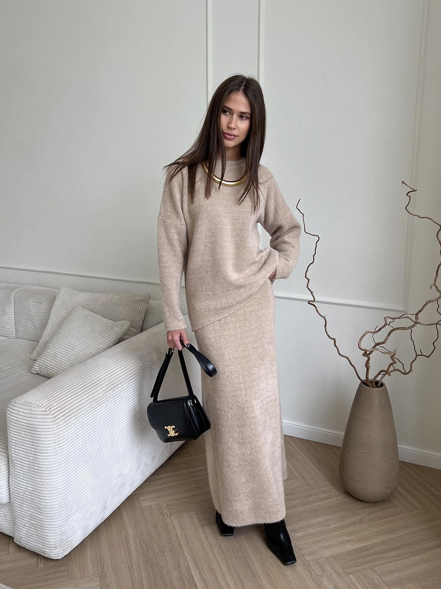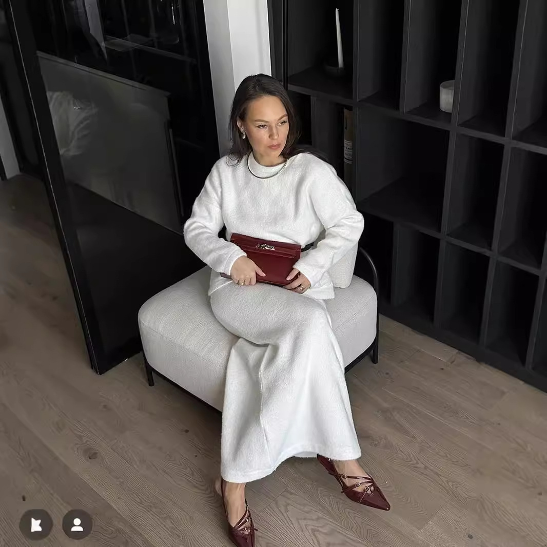 2025 가을 겨울 우아한 부드러운 두꺼운 라운드 넥 스웨터 + 피쉬 테일 스커트 투피스 여성 OL 스타일 탑 + 스커트 세트