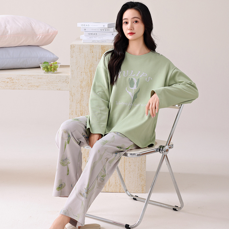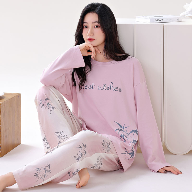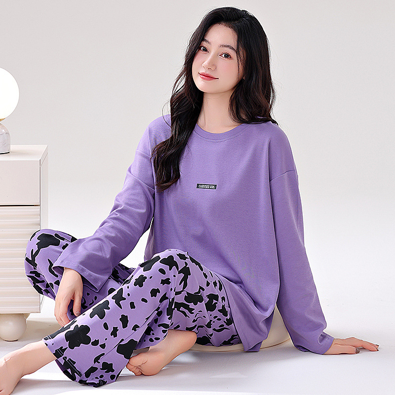 여성 잠옷 가을 면 긴 소매 세트 달콤한 귀여운 느슨한 캐주얼 플러스 사이즈 홈 옷 면 봄과 가을