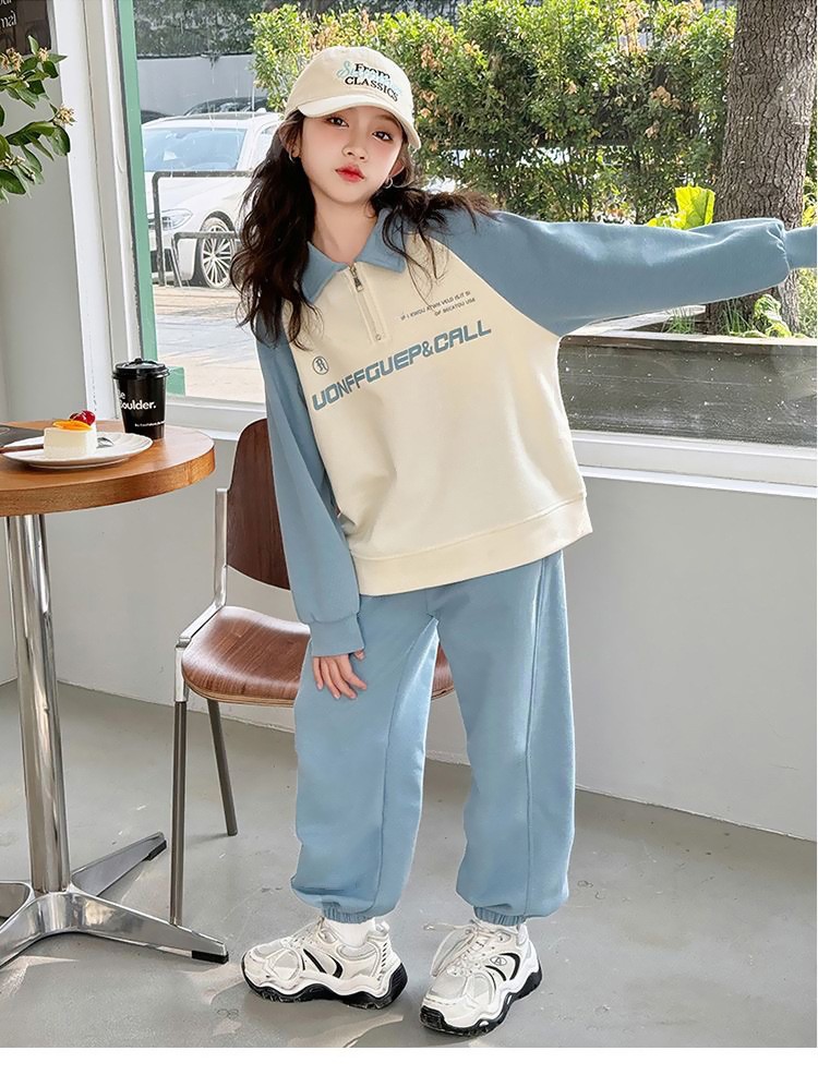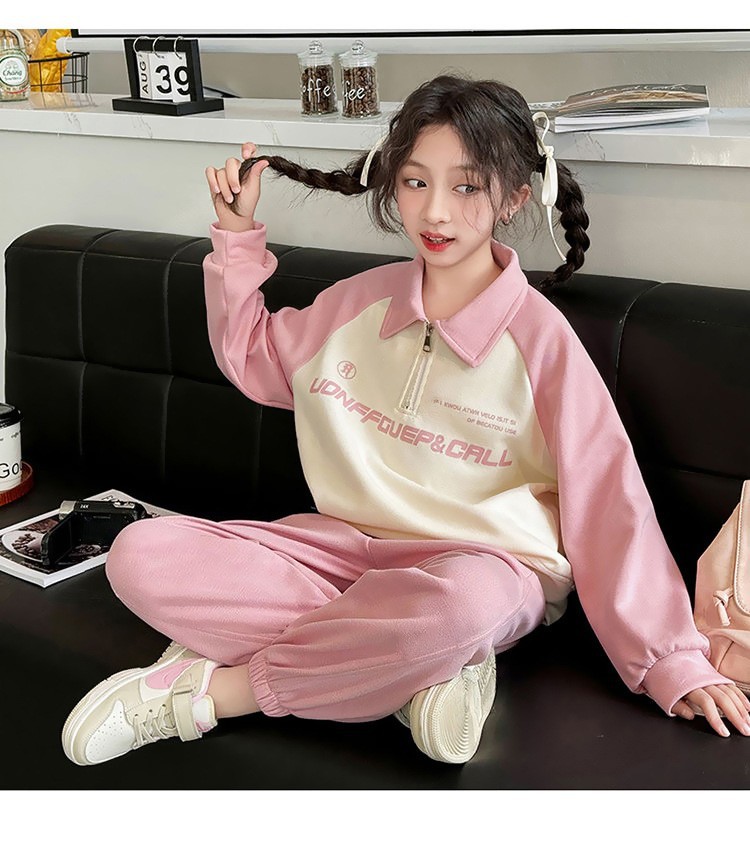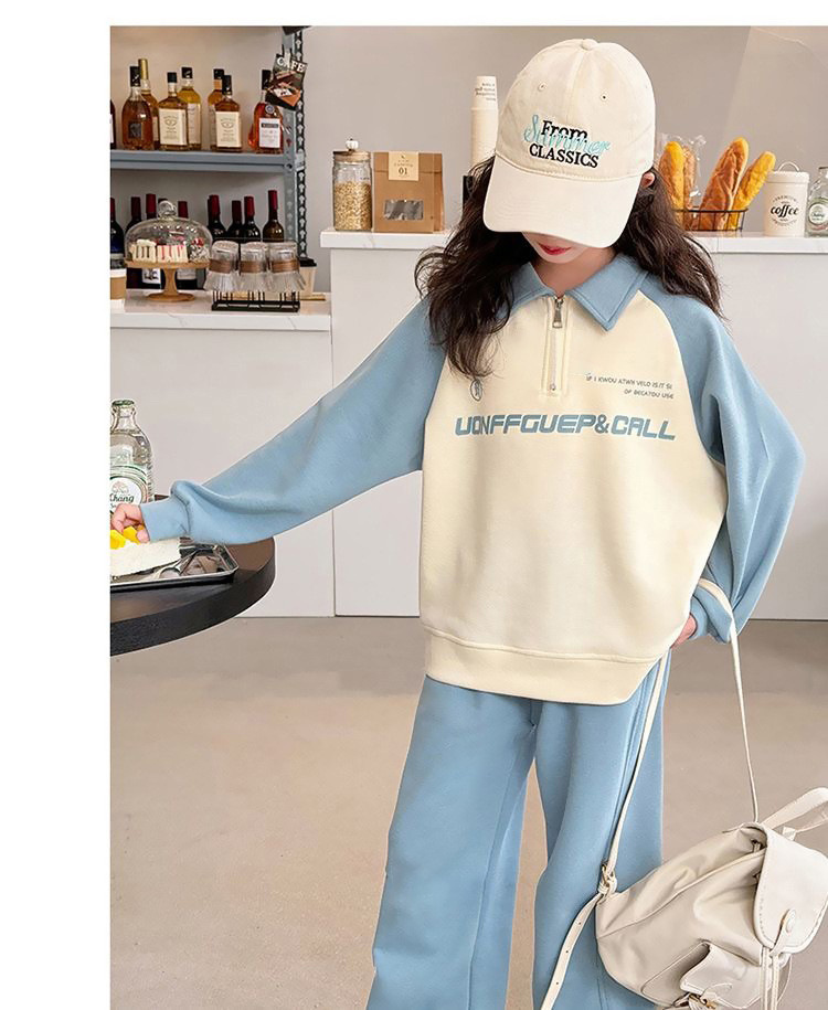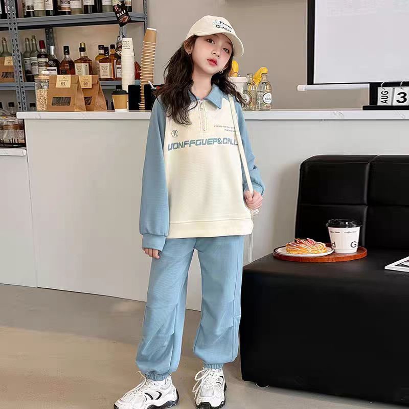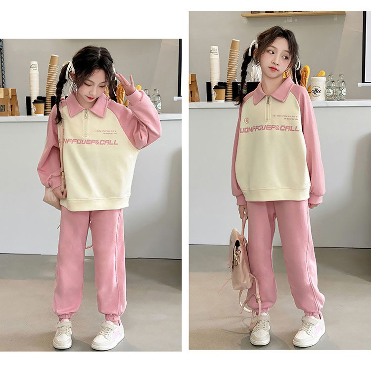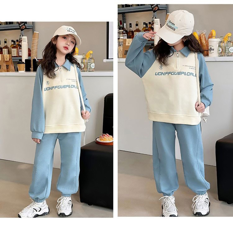 가을과 겨울 소녀 유행 스타일 옷깃 편지 느슨한 캐주얼 세트 큰 어린이 라글란 소매 땀 바지 세트스토어 가기