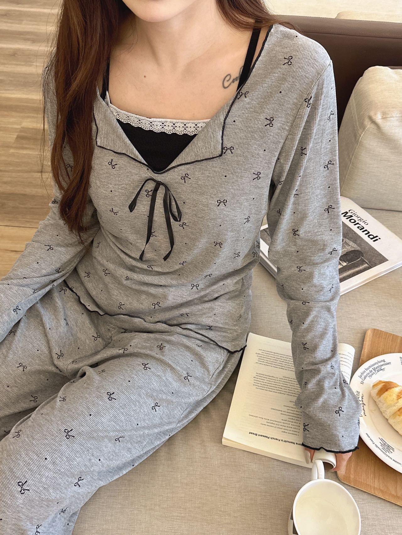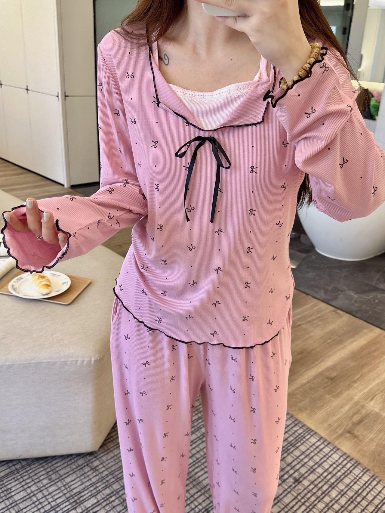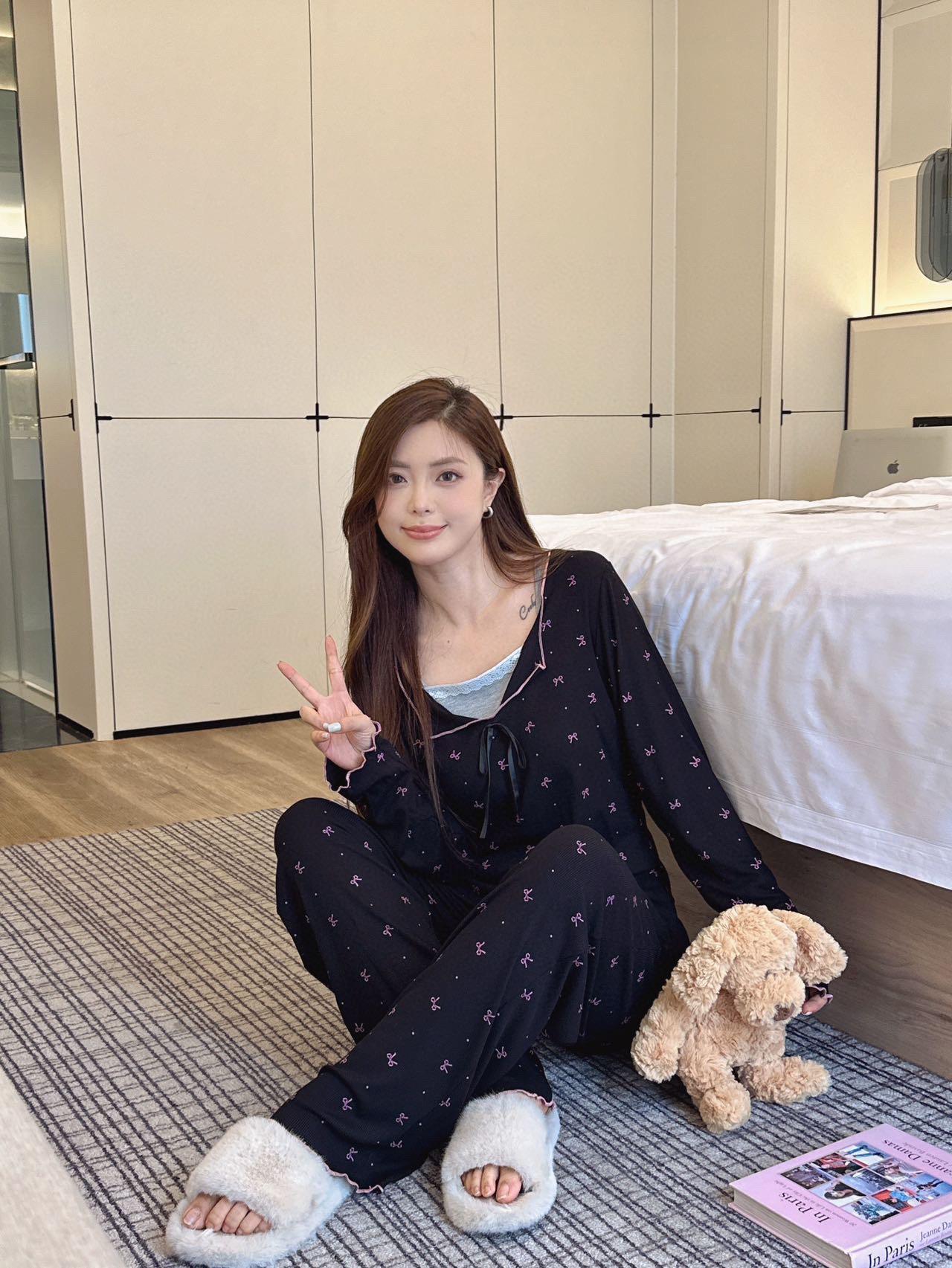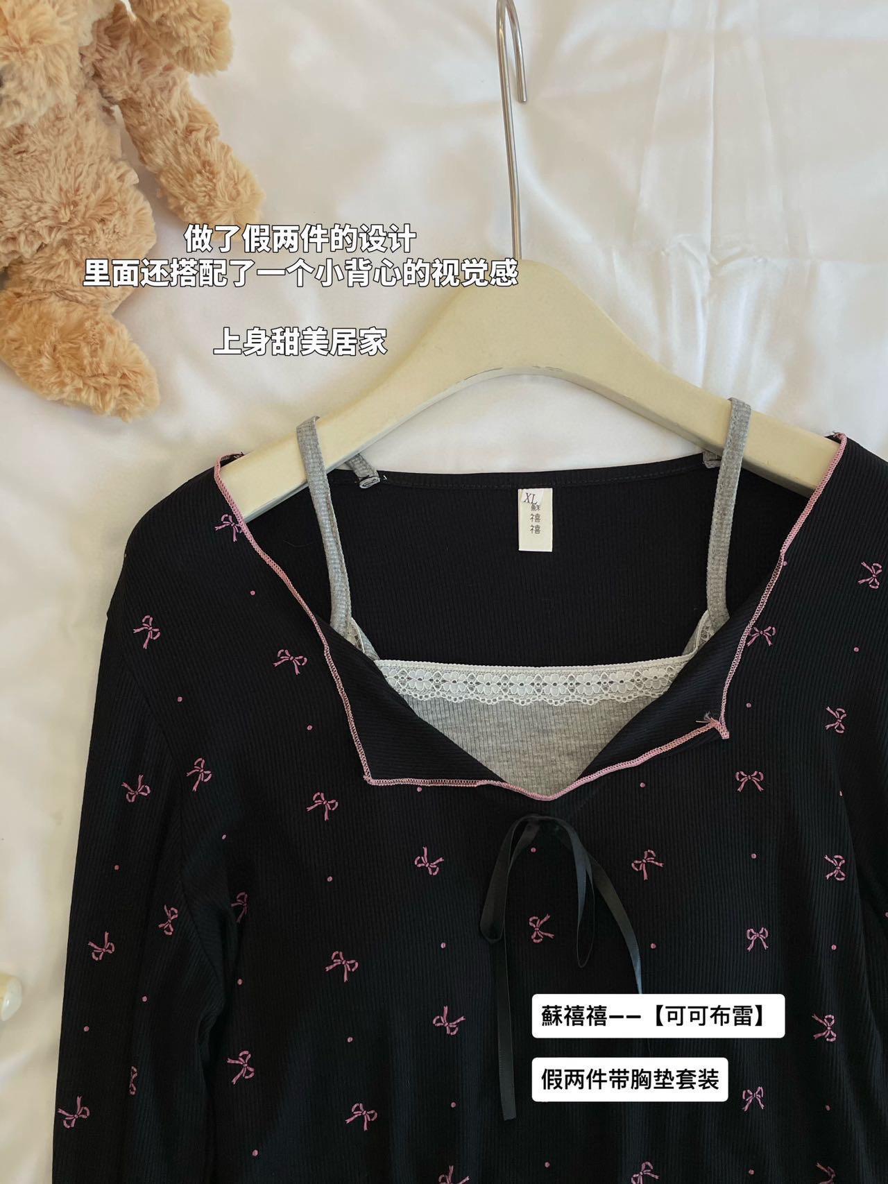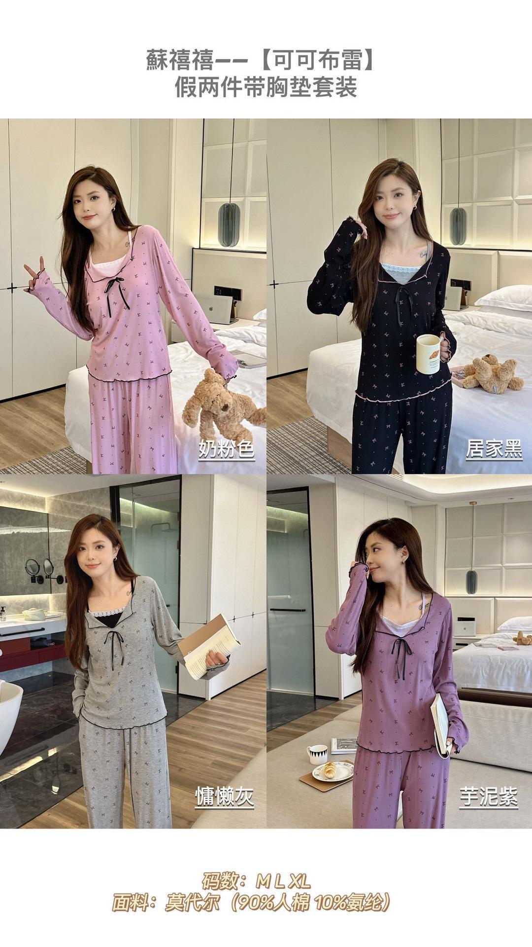 Su Xixi Coco Bray 가짜 양피스 세트 여자 한국 스타일 모달 긴팔 바지 파자마 홈 옷