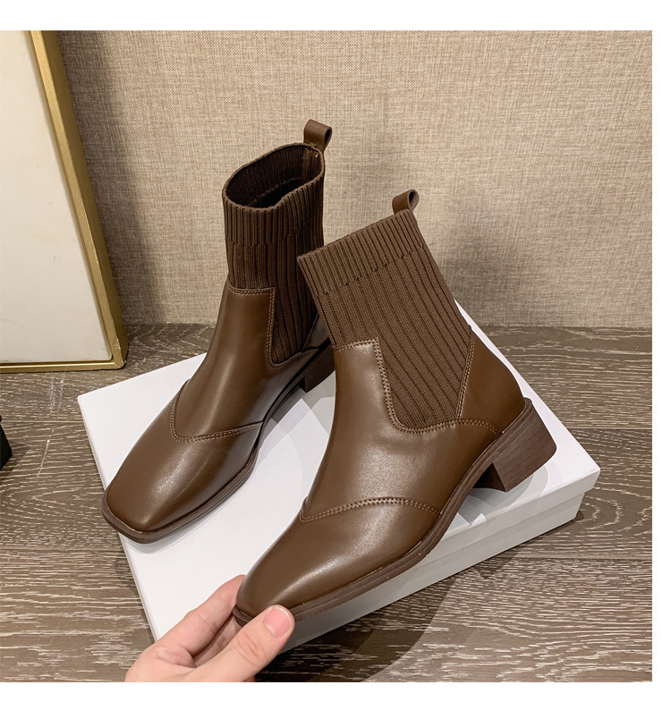 Cowhide Edition ~ 프렌치 레트로 니트 스티칭 Stingy 양말 부츠 영국 스타일 스퀘어 마틴 부츠 올 매치 두꺼운 발목 부츠