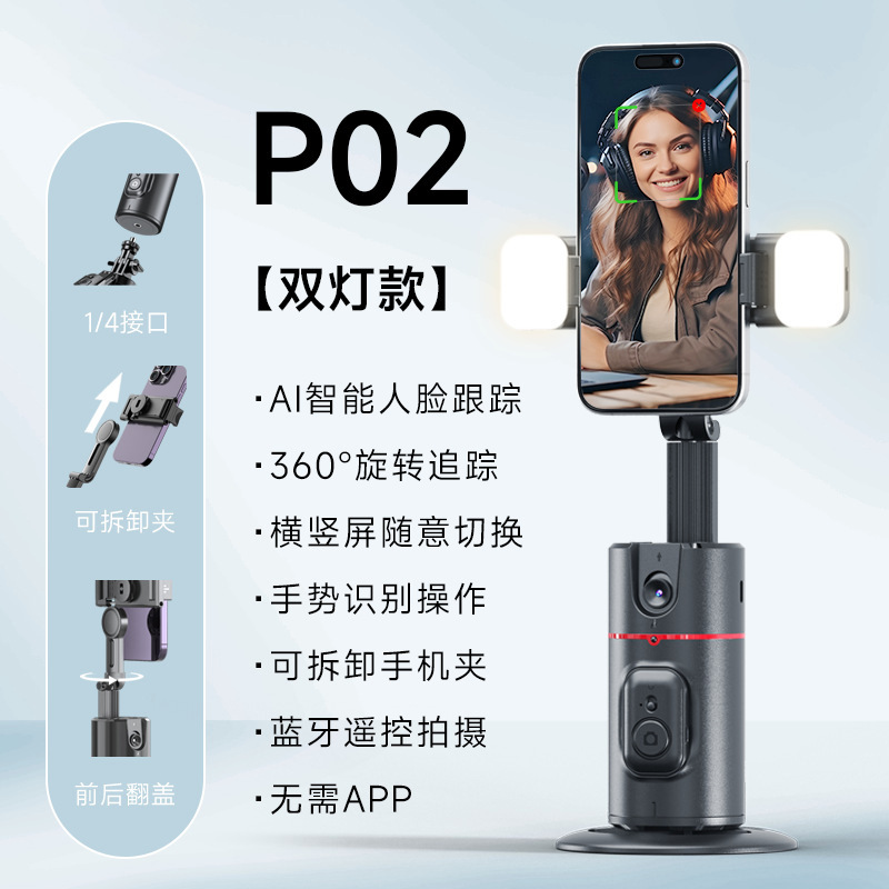 • 【P02D】듀얼 라이트 + AI 스마트 트래킹 + 360도 회전 + 전후 180도°피치 + 텔레스코픽 암 + 리모콘