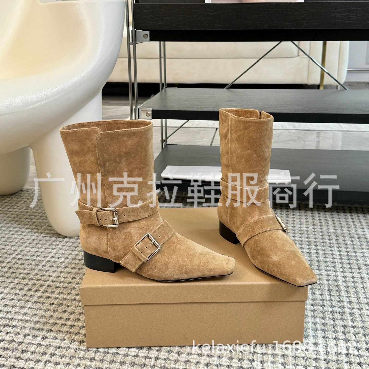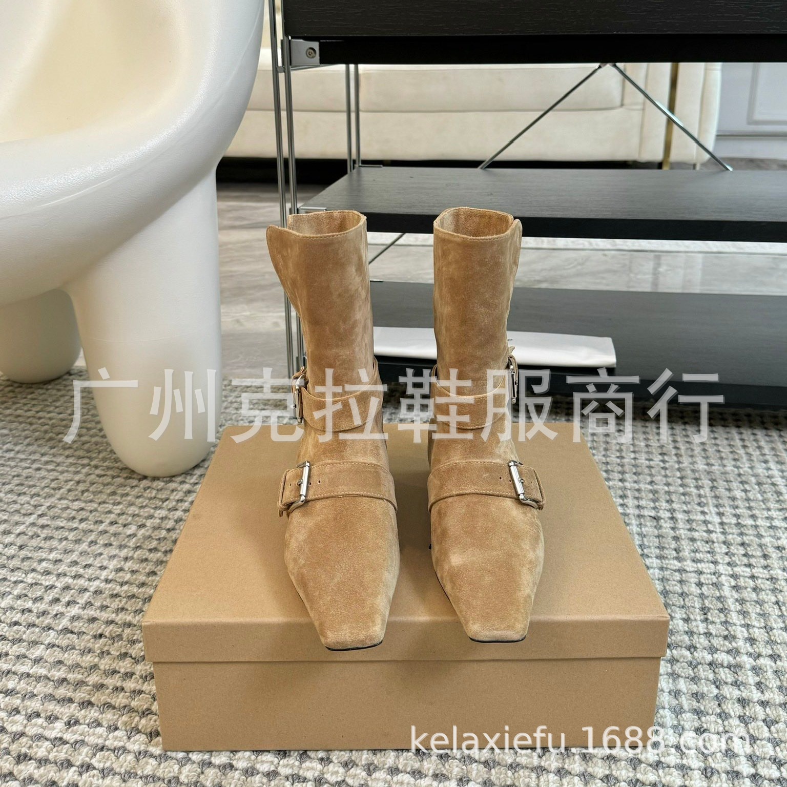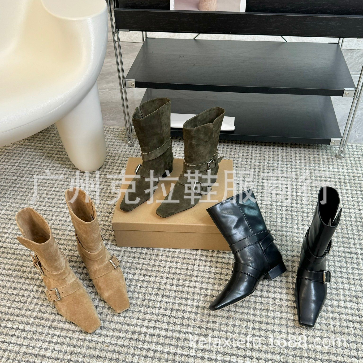 고급 맞춤형 2025년 신상 가죽 스웨이드 스퀘어토 미드컷 부츠 여성용 벨트 버클 슬립온 굵은 굽 웨스턴 부츠 숏부츠스토어 가기
