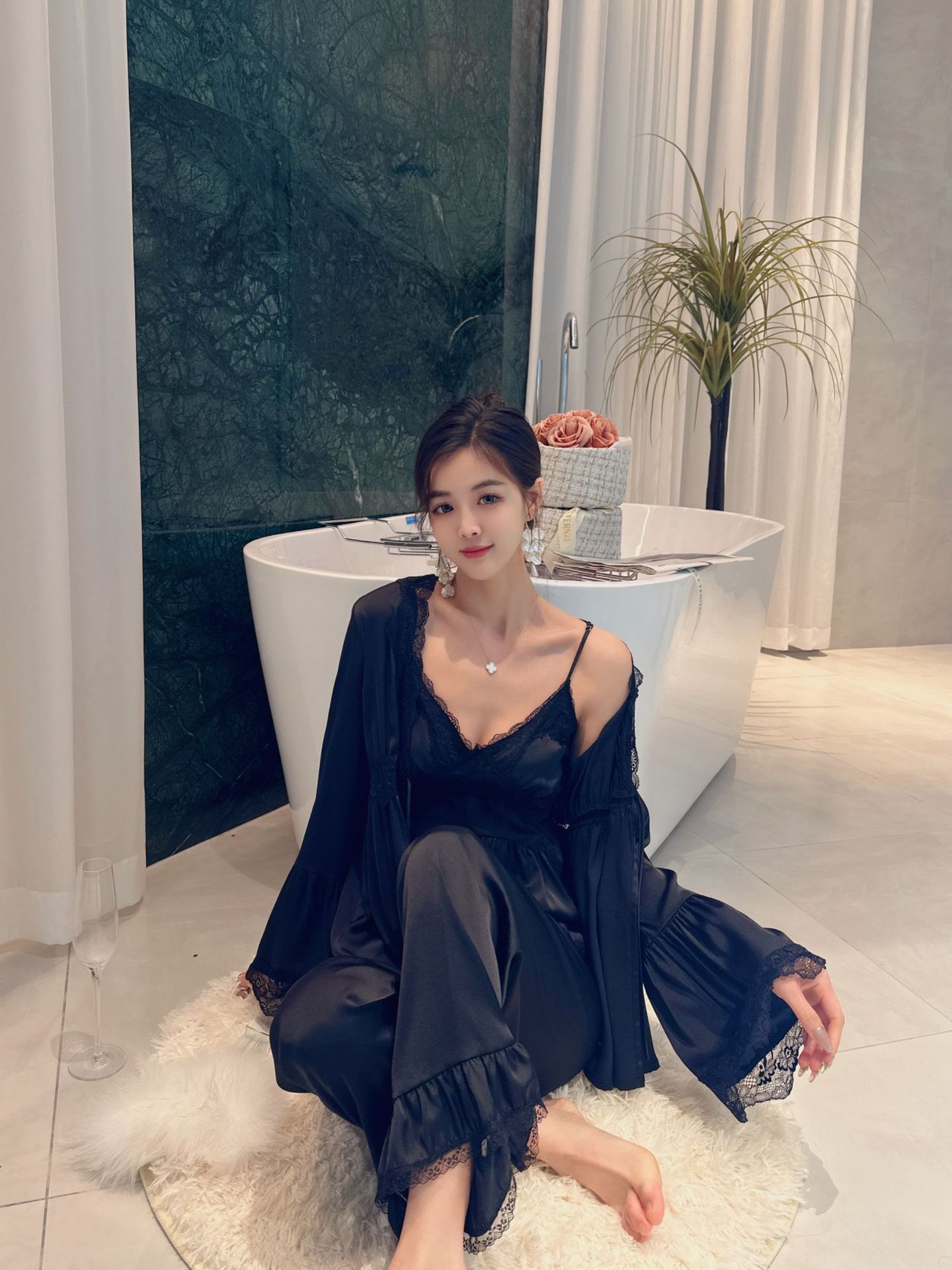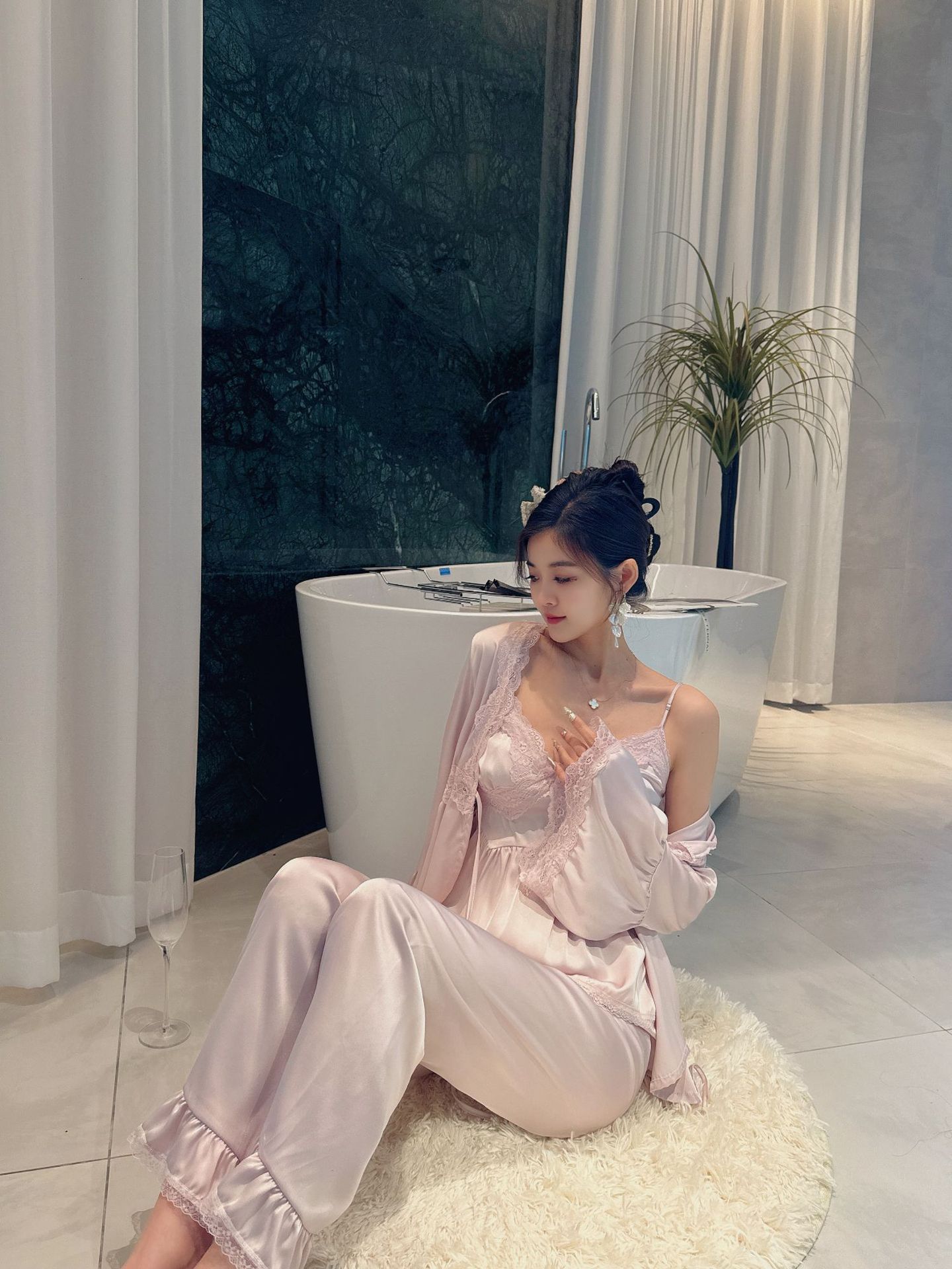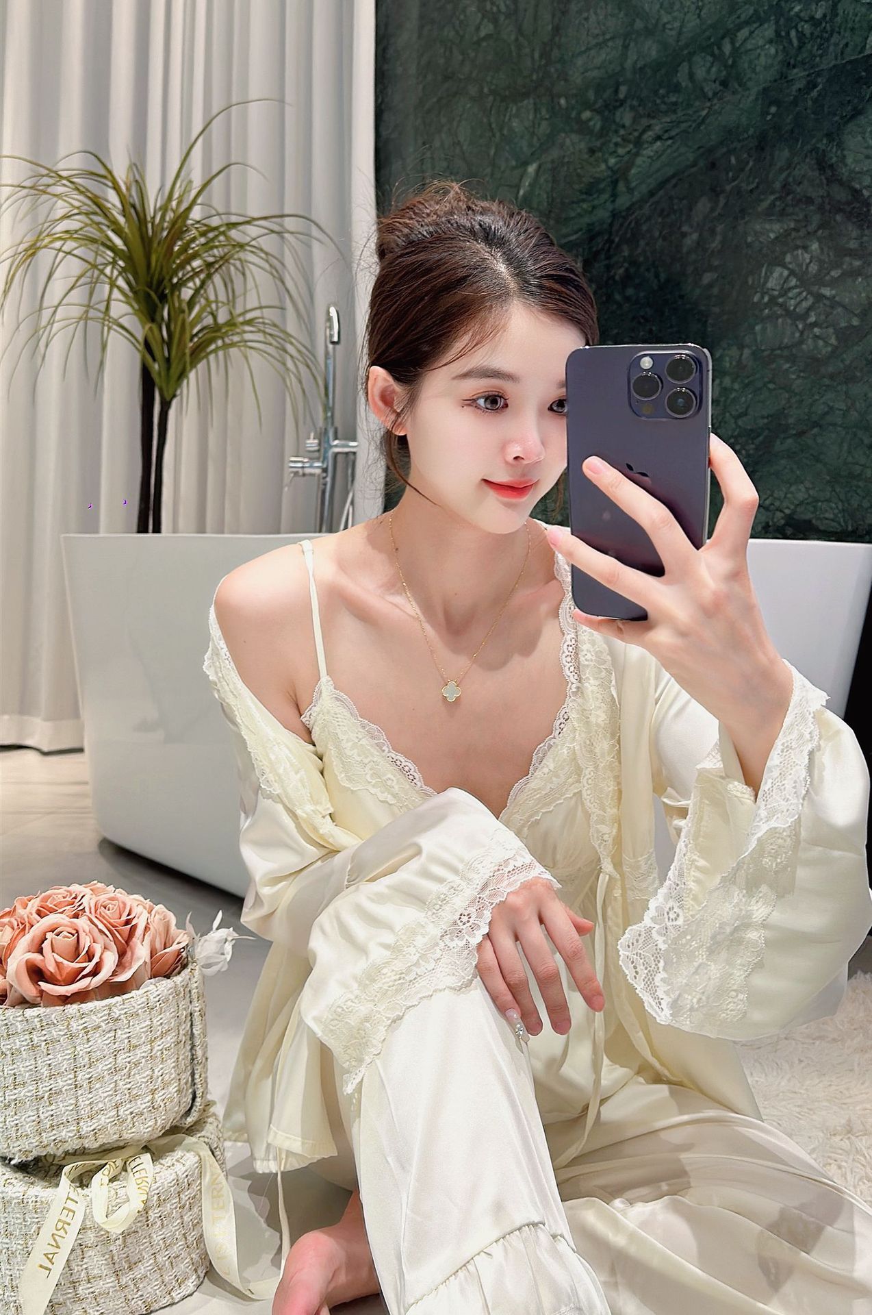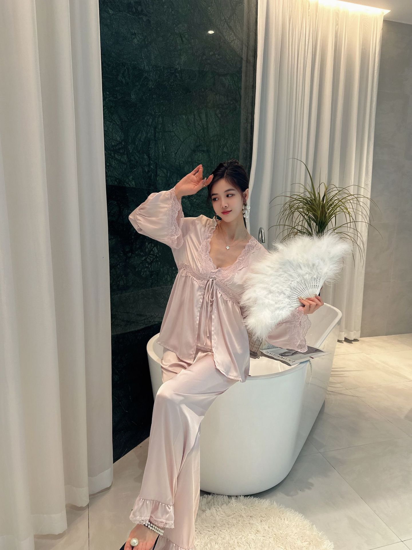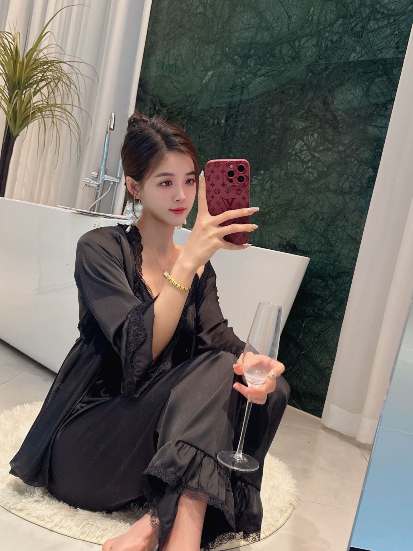 자오 루시 블랙 파자마 섹시 3 피스 세트 2024 가을 아이스 실크 슬링 레이스 순수 욕망 스타일 홈 의류스토어 가기