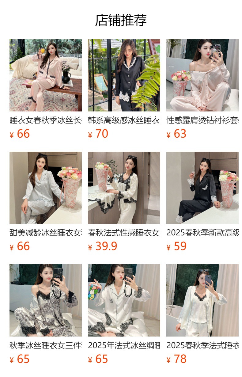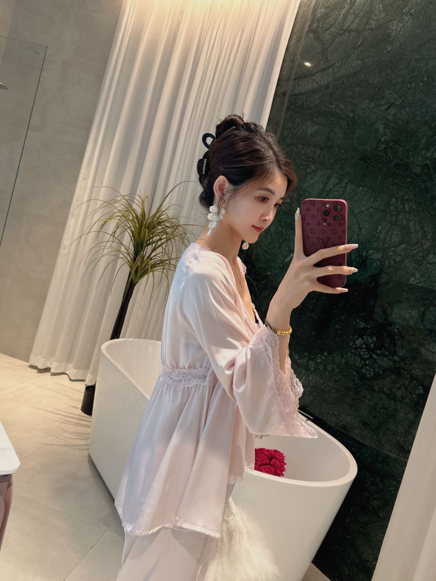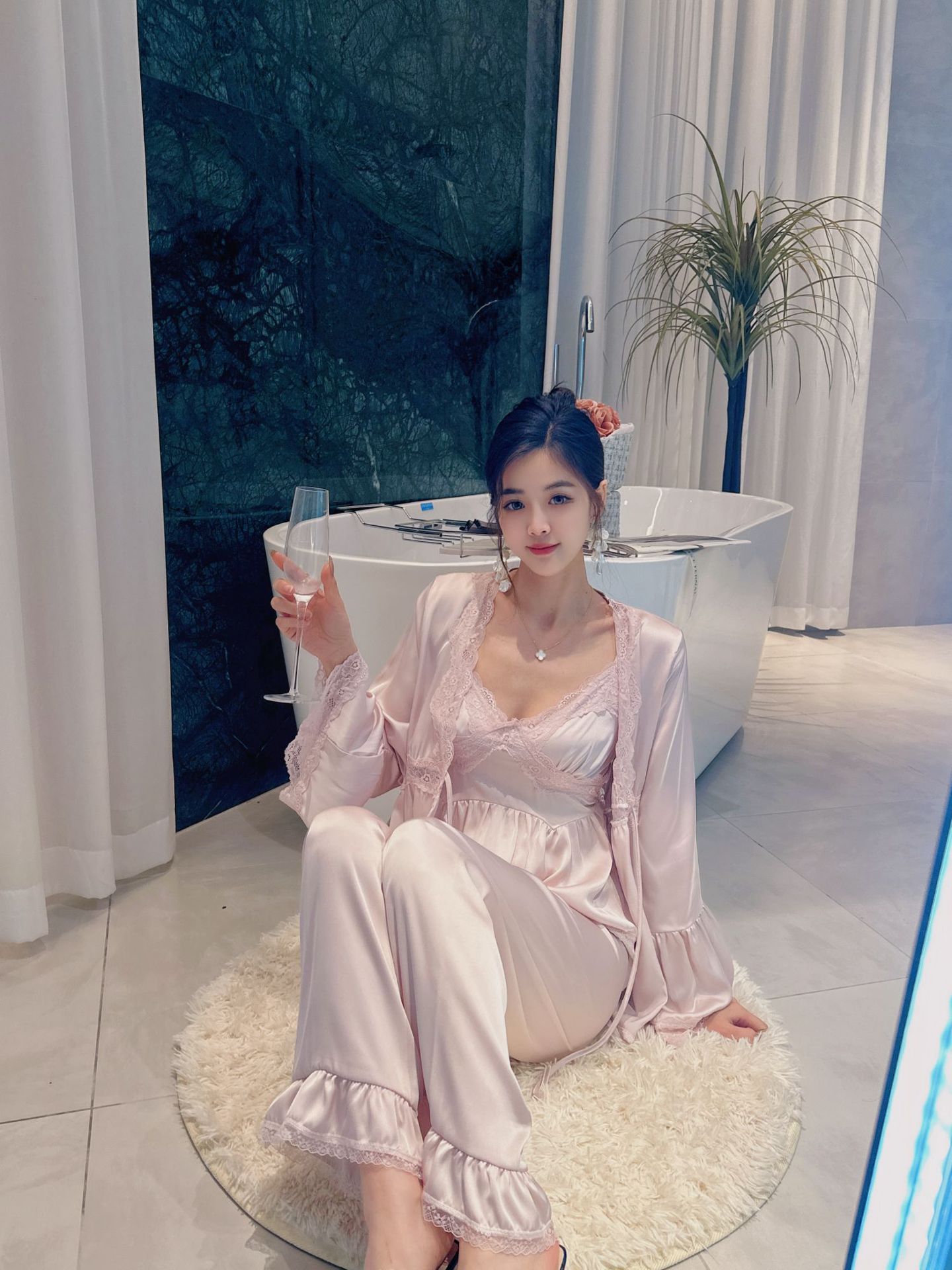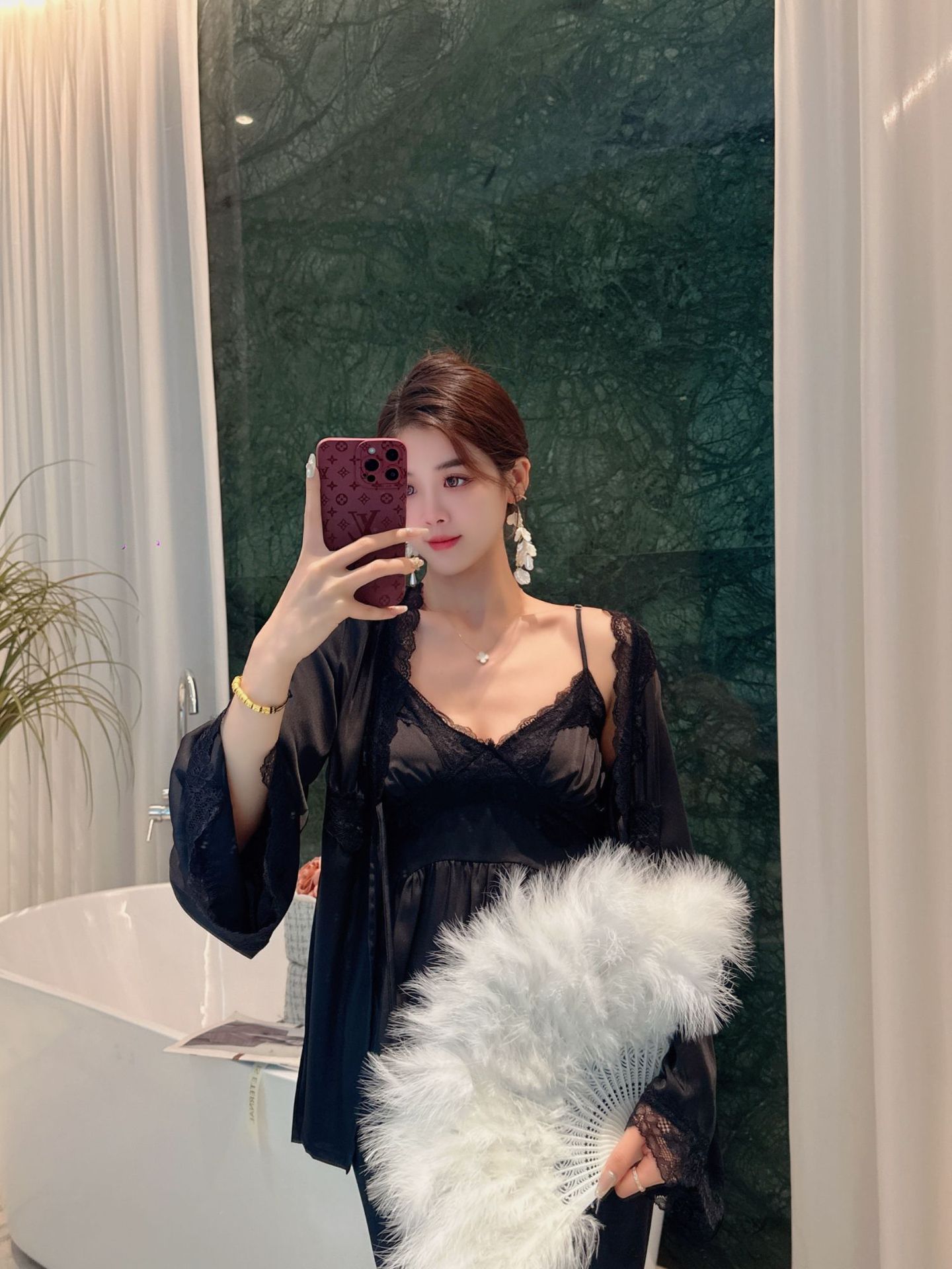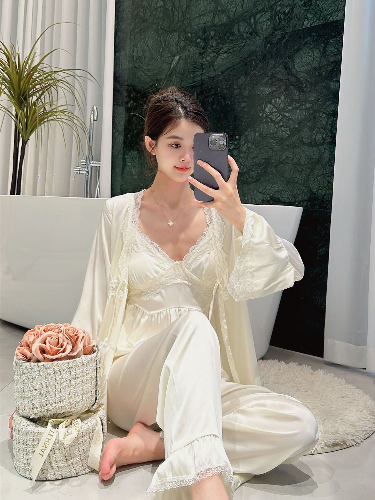 자오 루시 블랙 파자마 섹시 3 피스 세트 2024 가을 아이스 실크 슬링 레이스 순수 욕망 스타일 홈 의류스토어 가기