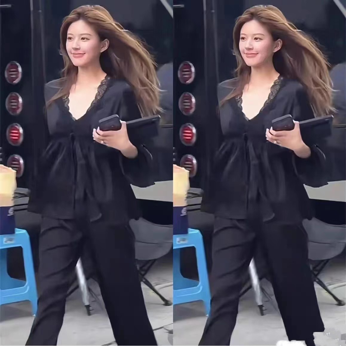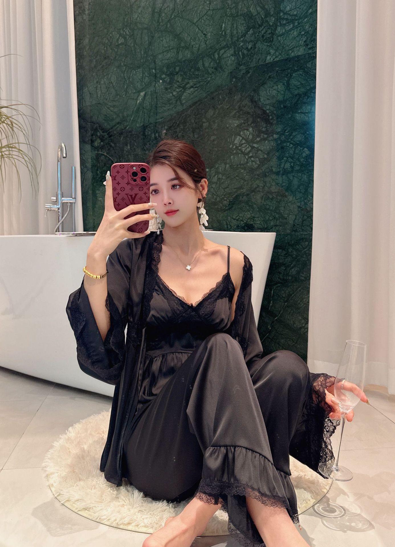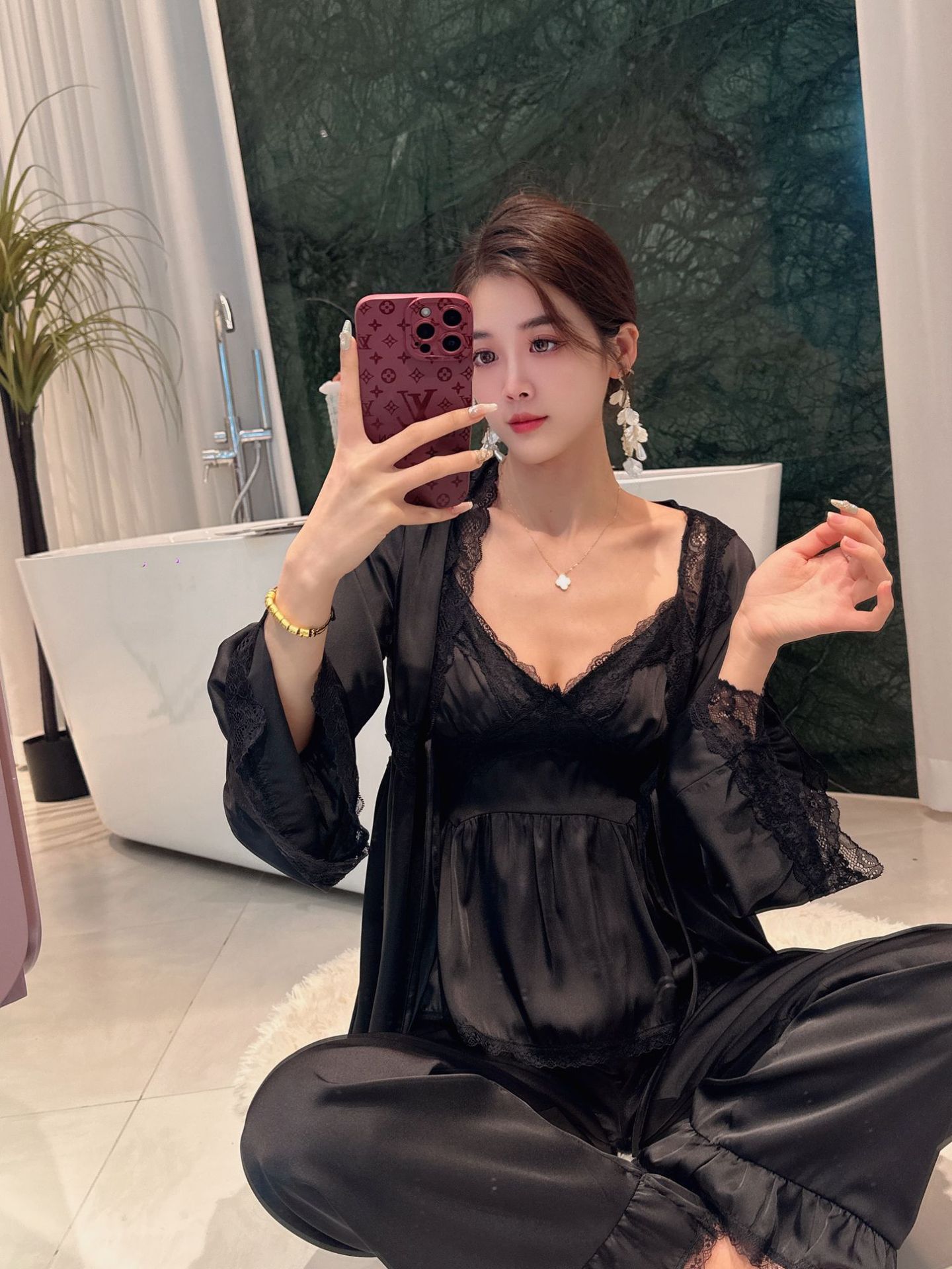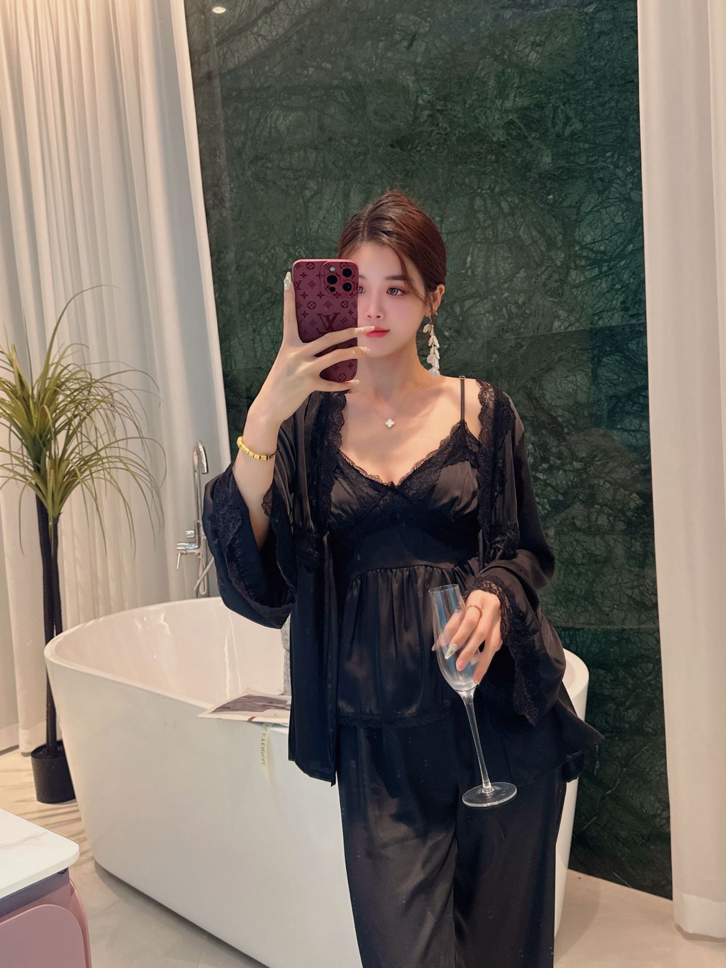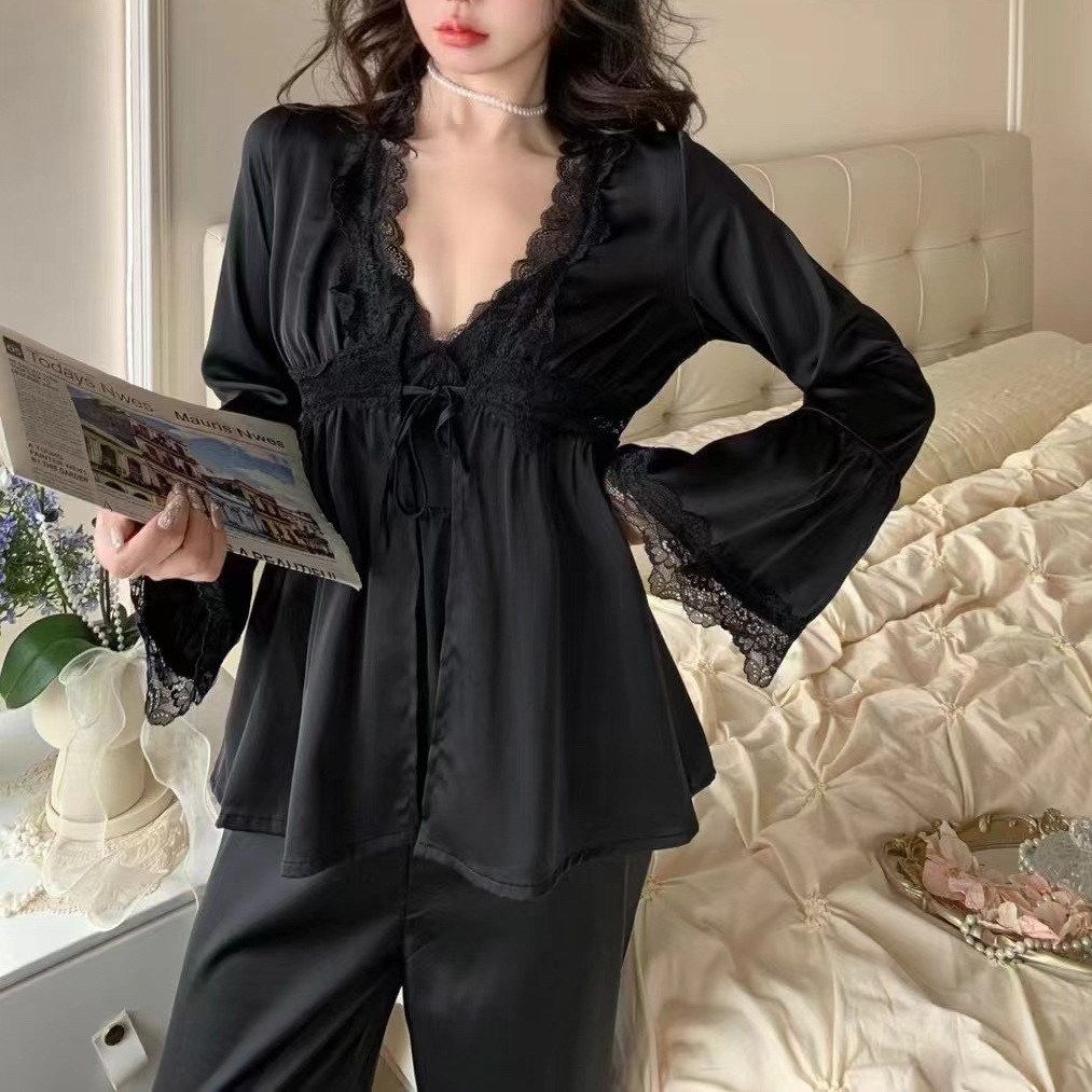 자오 루시 블랙 파자마 섹시 3 피스 세트 2024 가을 아이스 실크 슬링 레이스 순수 욕망 스타일 홈 의류