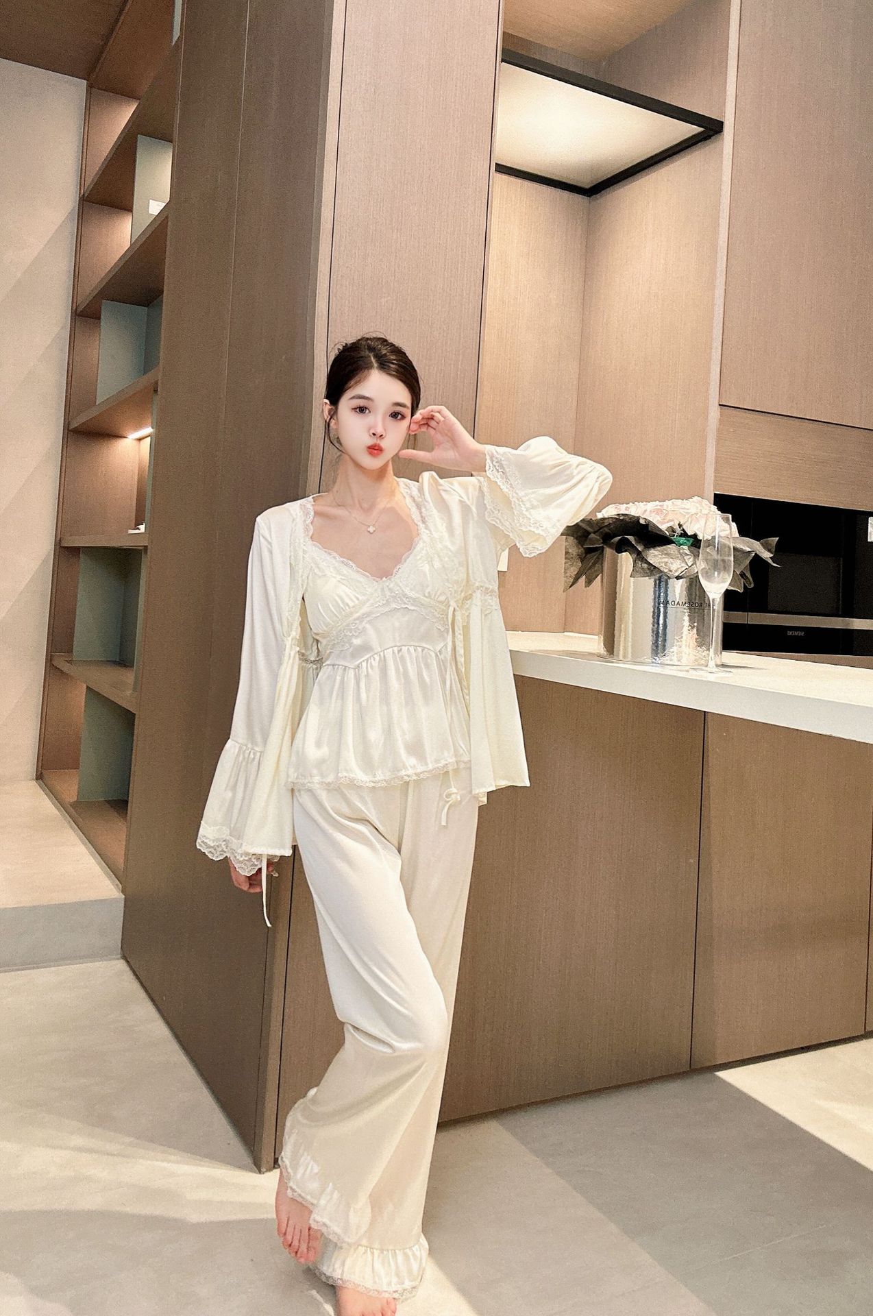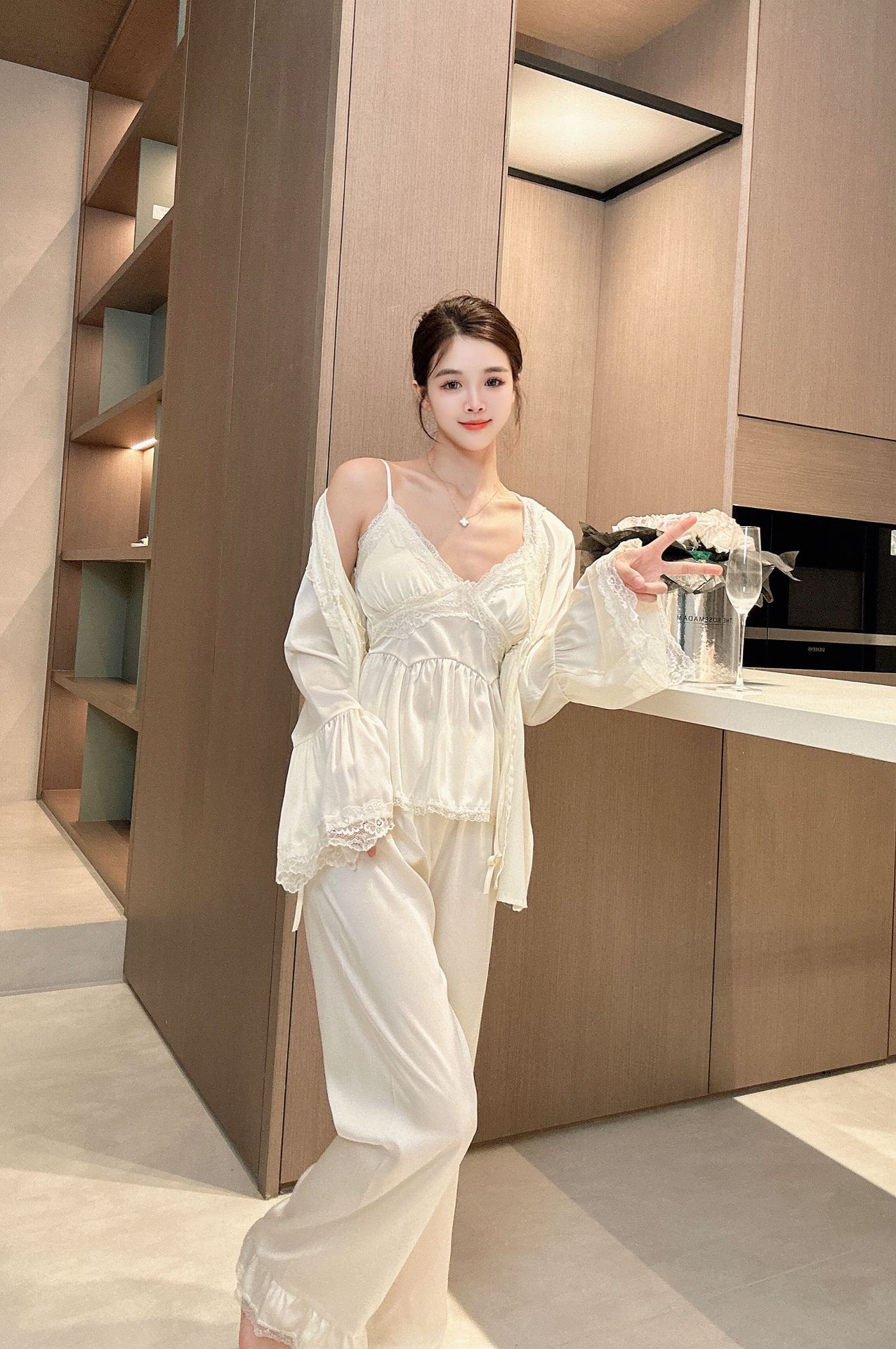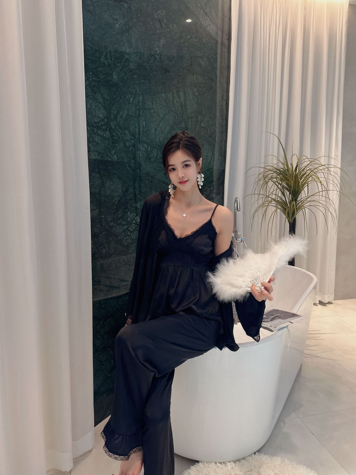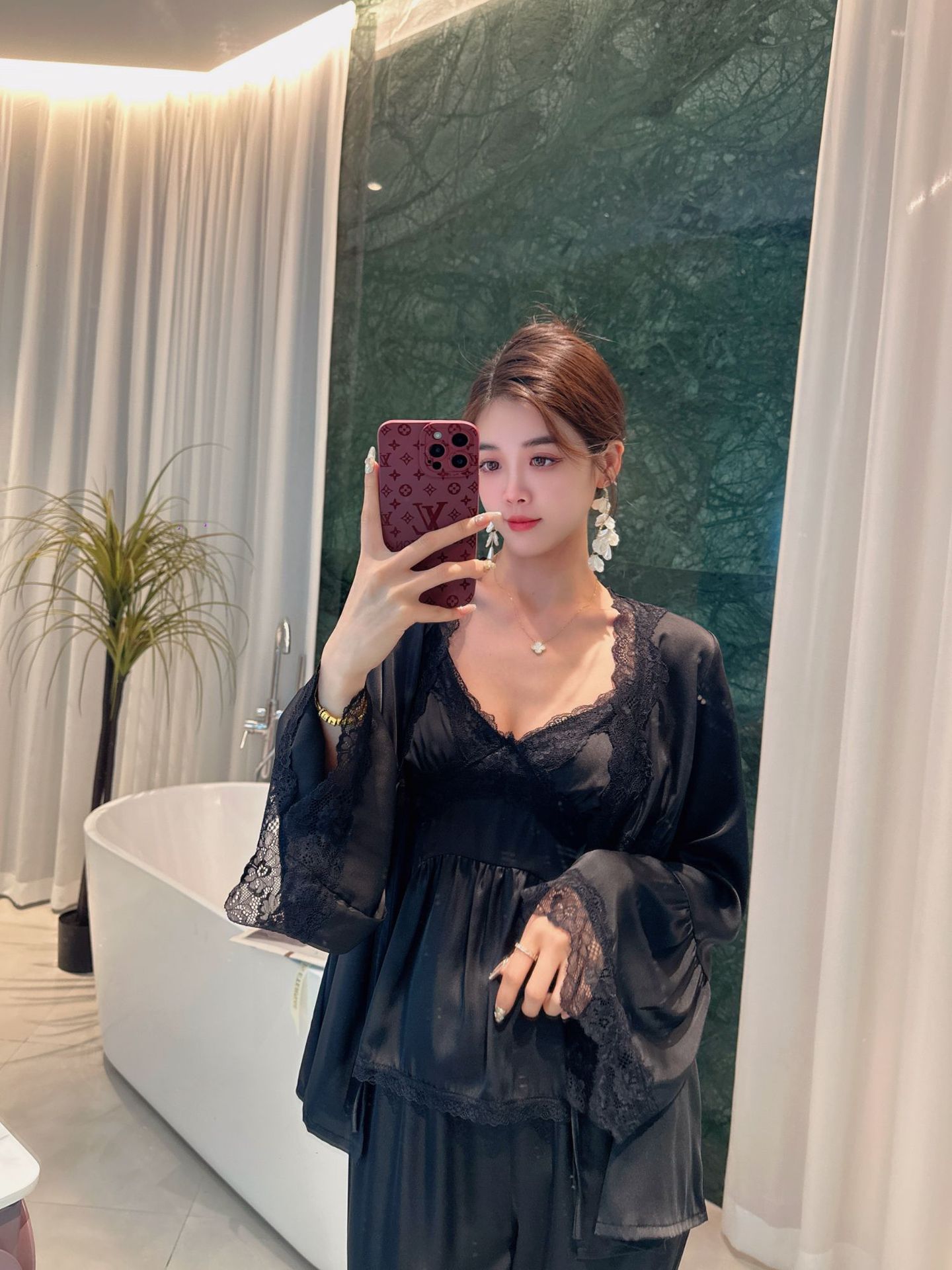 자오 루시 블랙 파자마 섹시 3 피스 세트 2024 가을 아이스 실크 슬링 레이스 순수 욕망 스타일 홈 의류
