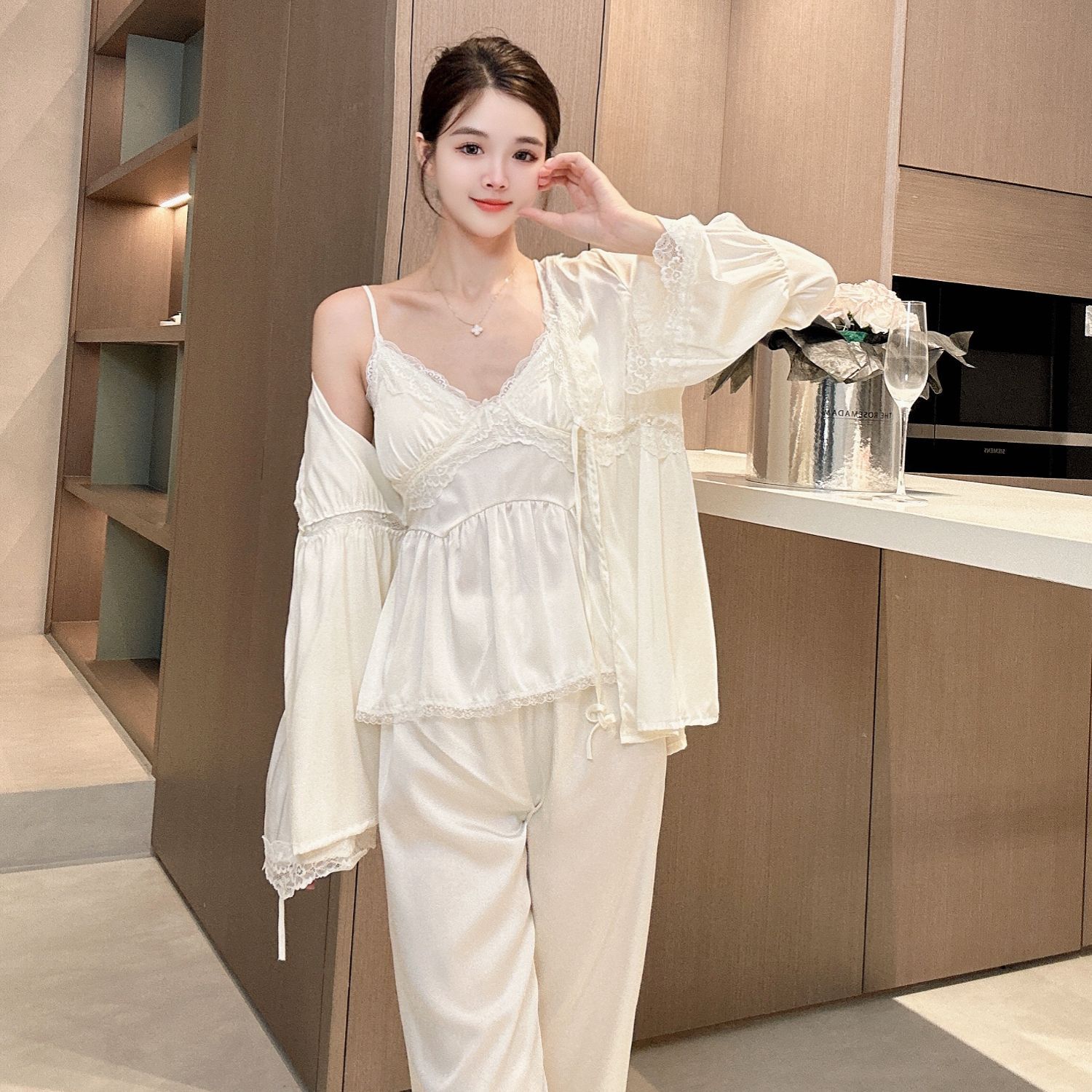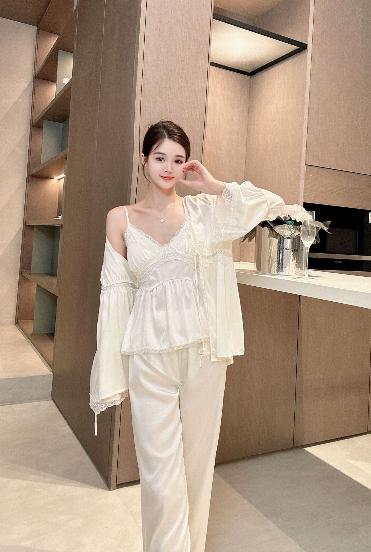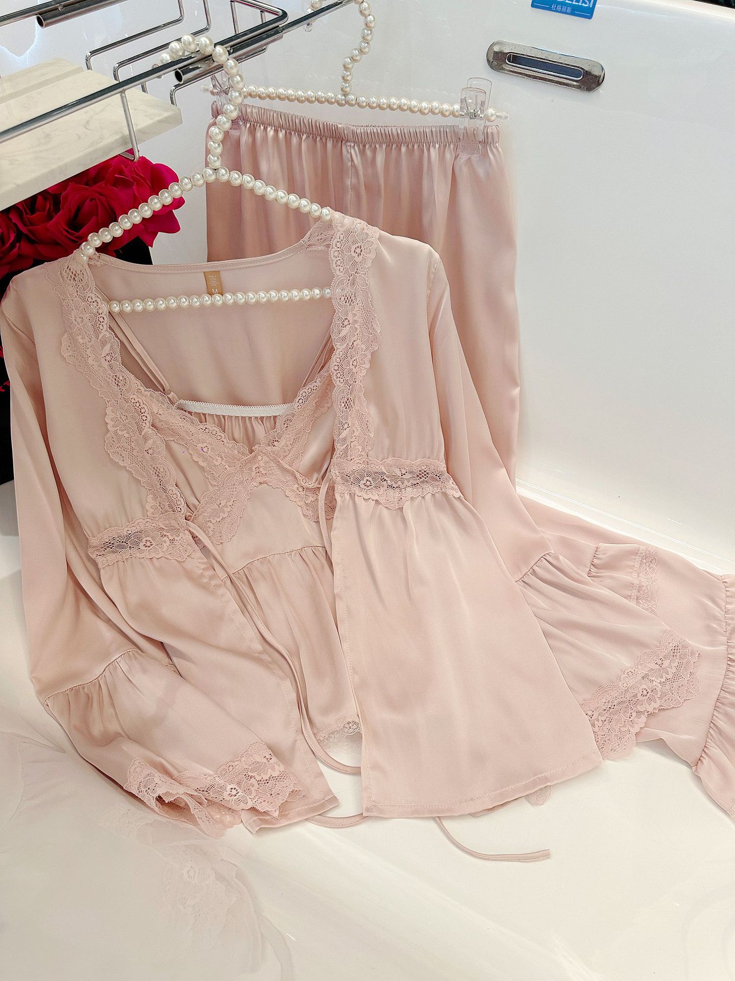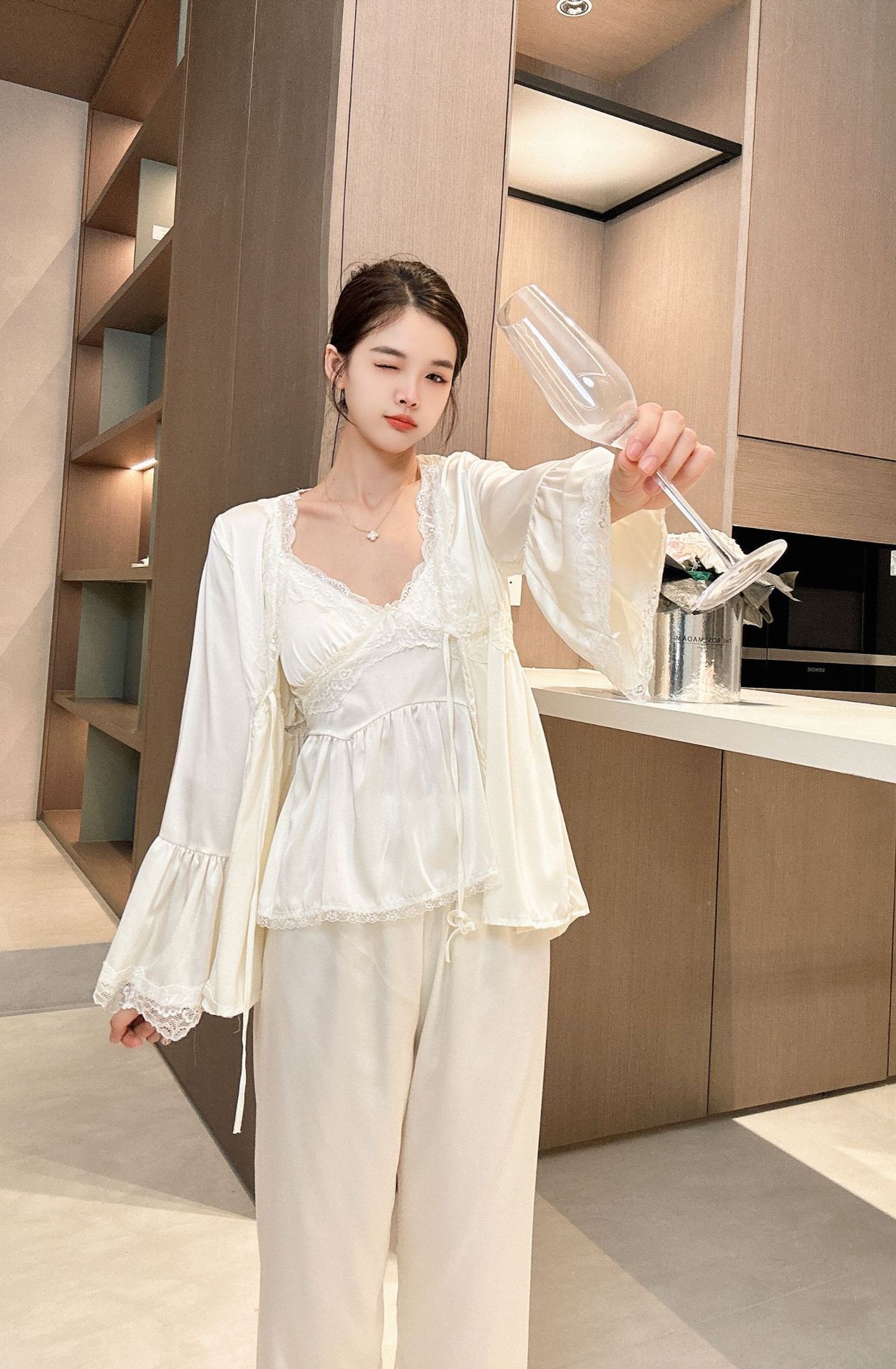 자오 루시 블랙 파자마 섹시 3 피스 세트 2024 가을 아이스 실크 슬링 레이스 순수 욕망 스타일 홈 의류